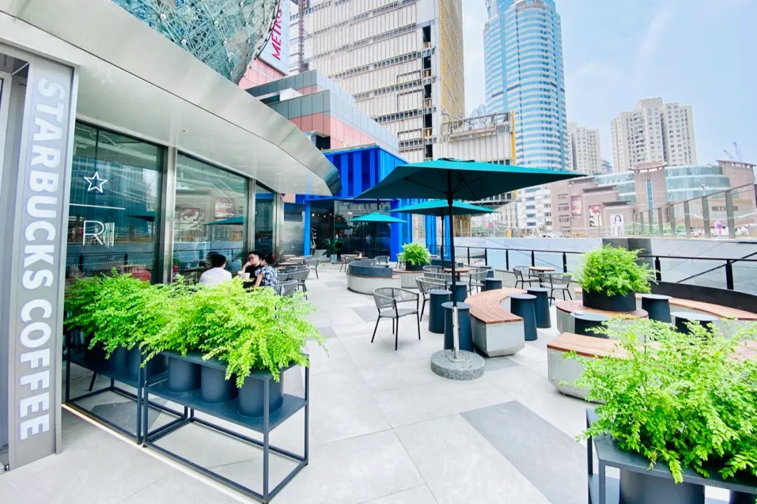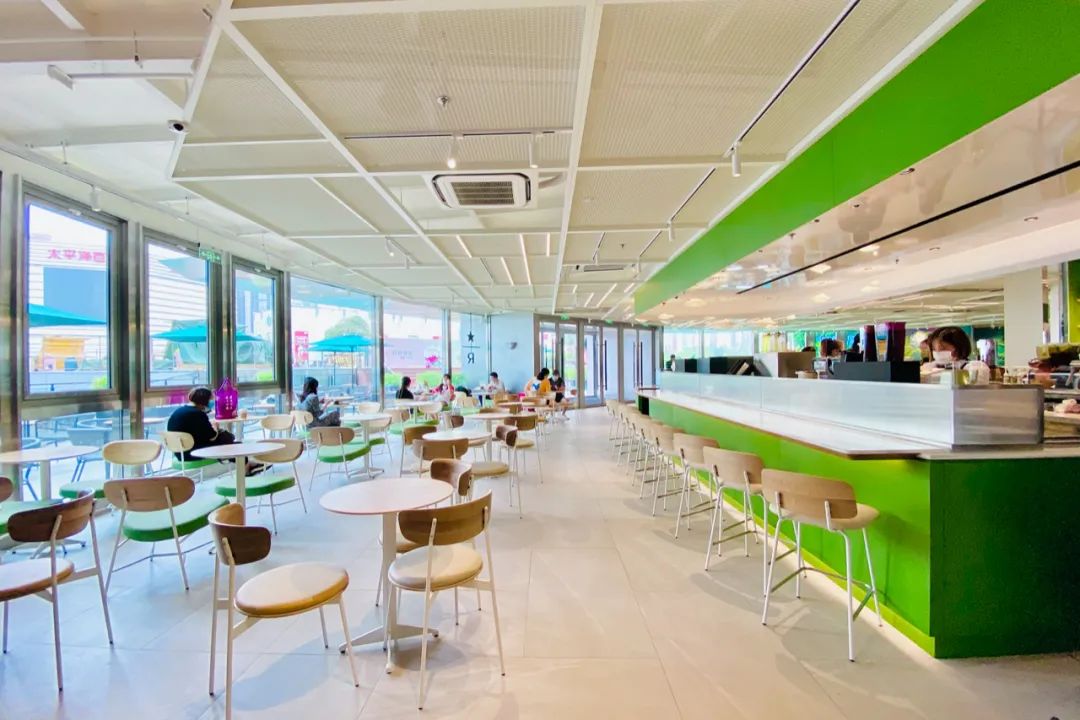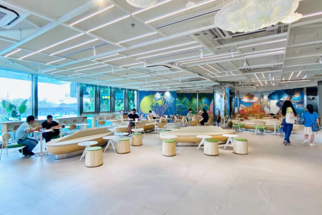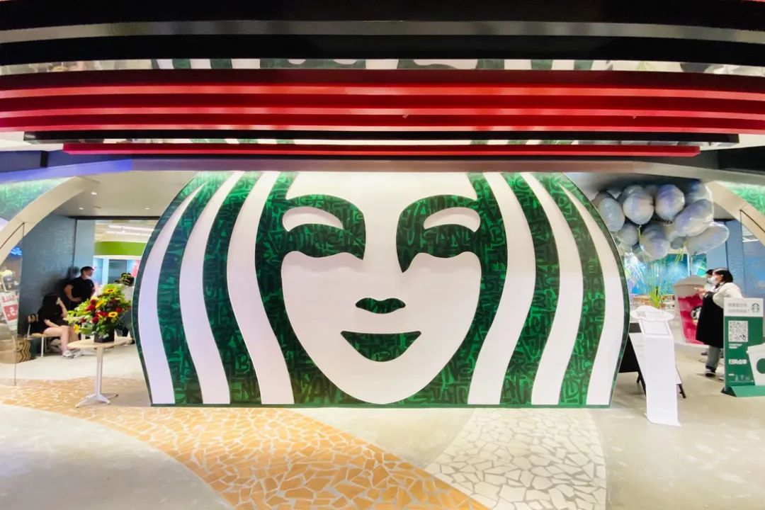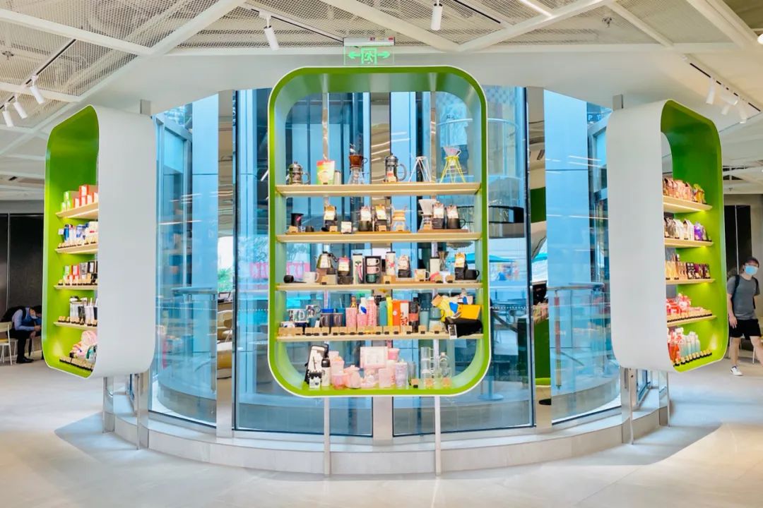 人鱼艺术主题在星巴克店内呈现的主要是位于店铺左右两侧的弧形墙画,左侧由于也是吧台工作区域,因此坐席较少,消费者在点单时更容易近距离感受作品。右侧则位于主力坐席区后方,如果不在该侧就坐则更适合远观。据悉墙画所表达的故事是:美人鱼带着咖啡产区、咖啡种植地的各种元素,漂洋过海来到了上海。整家门店的整体风格有点小清新,悬挂着“茶云”,吧台和产品陈列架的圆角矩形设计手法,灵感来自的宇宙、星空、飞船,打造了全新的网红打卡点。