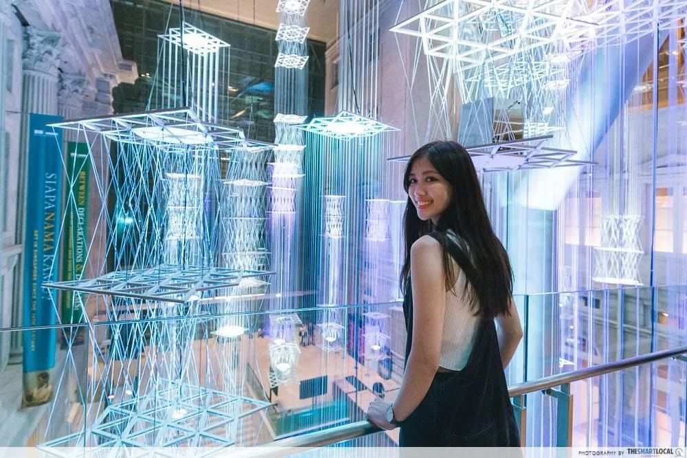 Floating City(浮城)不是一个静态中庭场景,而是一个有颜值还能互动的新媒体装置。进入画廊的巴东中庭,你肯定也会被“浮城”所吸引,创意和色彩搭配不走寻常路,装置以冷色调为主,色彩鲜艳抓住了人的眼球。装置悬挂在中空十分迷人,照亮了整个空间。装置的灯光会根据音乐变化,颜色和强度配合现场曲调,完成一场震撼人心的表演。