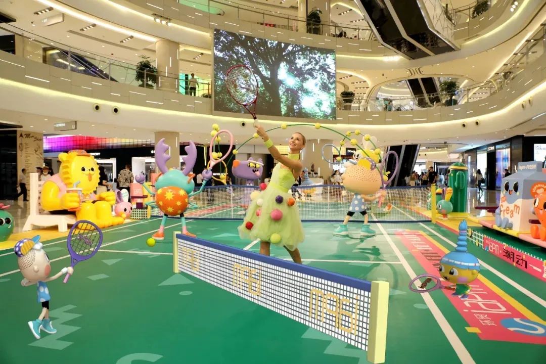 新鸿基地产旗下iapm商场特邀国际著名插画工作室TADO带来别开生面的“潮动一夏”AR艺术展。iapm中庭化身巨型网球场,12个萌趣可爱的卡通角色组成的「热血网球社」空降现场,献上一场精彩绝伦的网球盛宴。本次展览特别引入高科技AR增强现实技术,将艺术家笔下诙谐幽默的卡通人物融入现实空间,四大潮趣运动主题场景营造真假虚实的互动体验。