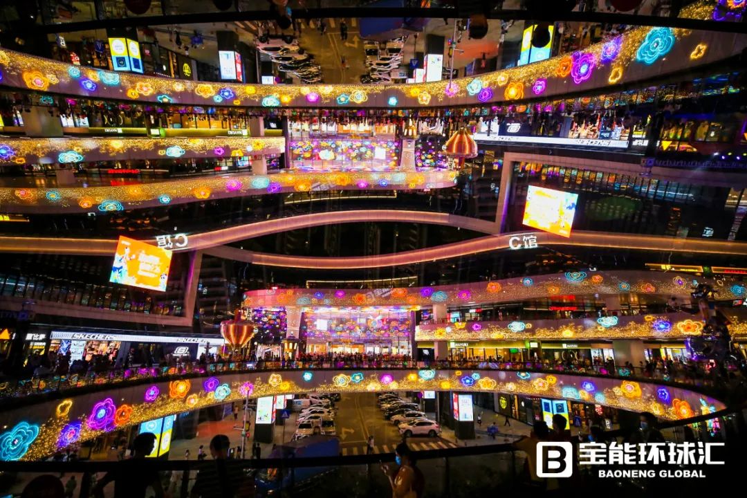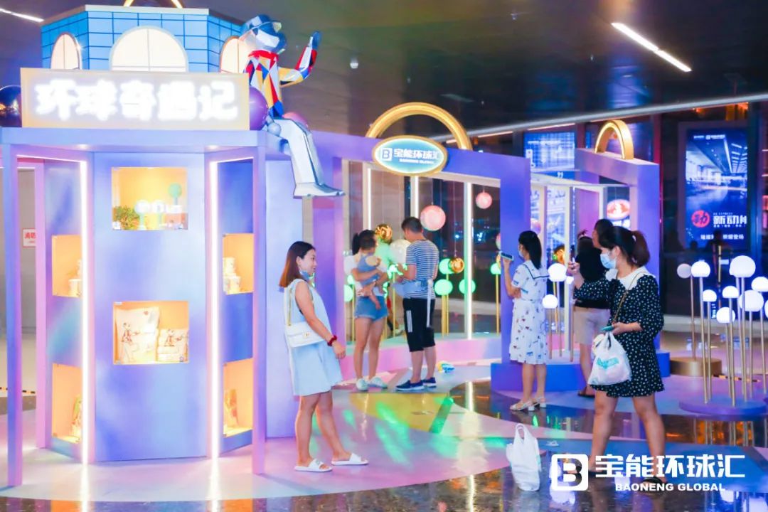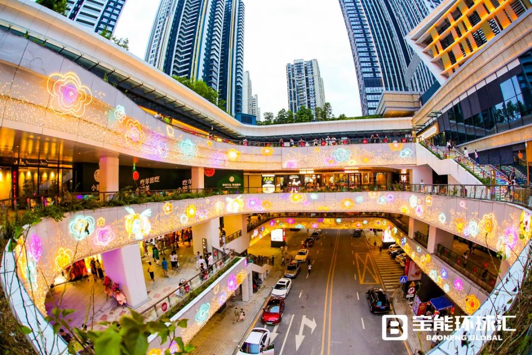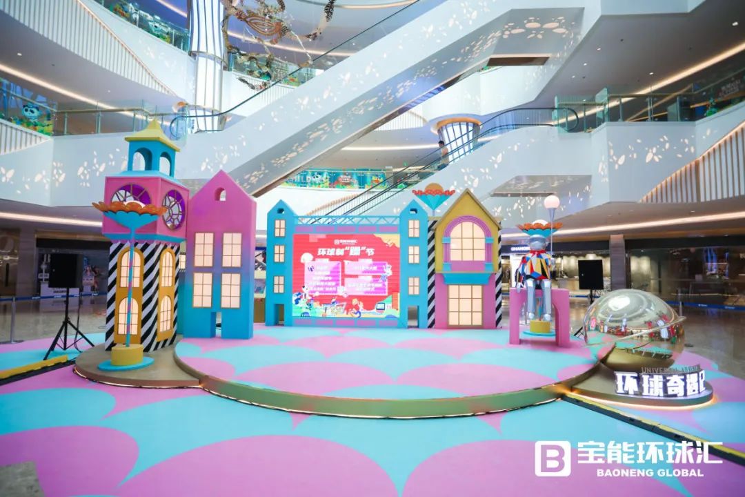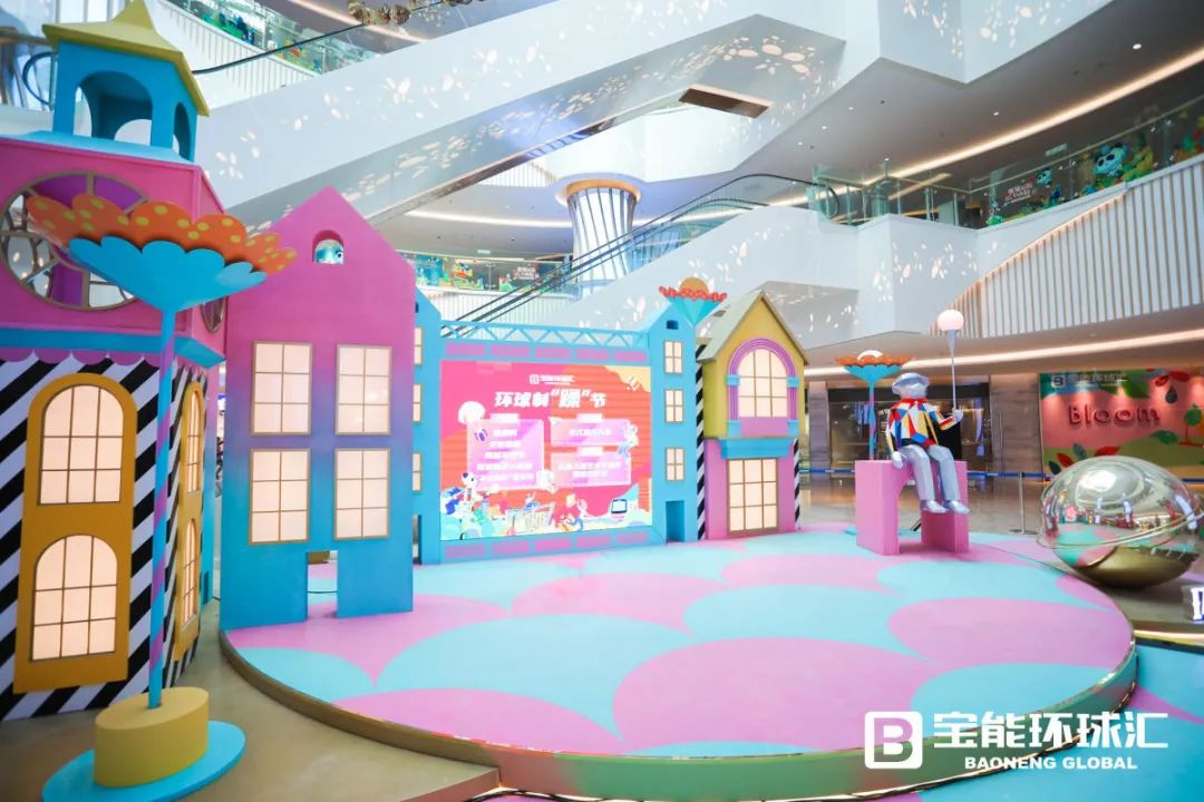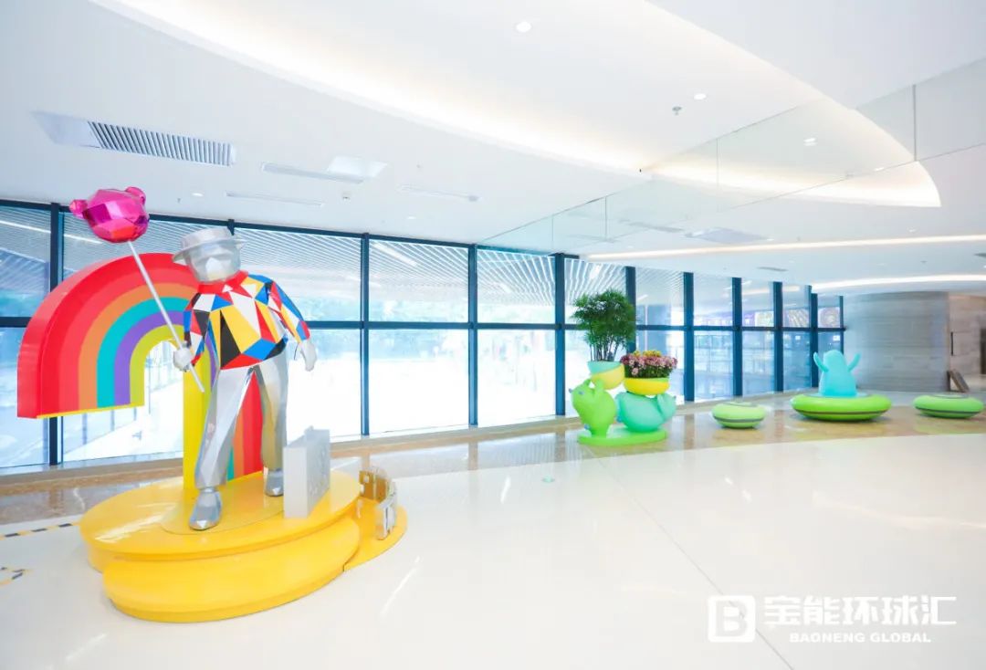 同时,西丽宝能环球汇利用IP形象融合美陈,结合空间属性,在商场不同楼层塑造多处梦幻场景,以此创造社交互动、个性有趣的拍照打卡处,形成项目与众不同的记忆点,如玩转光影、色彩斑斓的“环球之门”,有着热气球和城堡的“寻梦之亭”,可眺望花花世界的“发现环球汇”,以及“时光治愈之旅”“奇幻列车”等。除了IP吉祥物,在体量1万㎡的环形广场,还有优美景观雕塑、艺术互动装置、酷炫灯光布置、阳光草坪、梦幻花园等,再通过水、木等自然元素的点缀,商业体验的巧妙融合,项目成为立体人文生态空间。