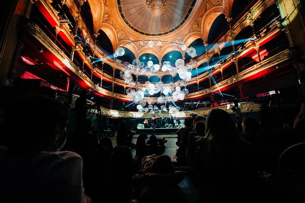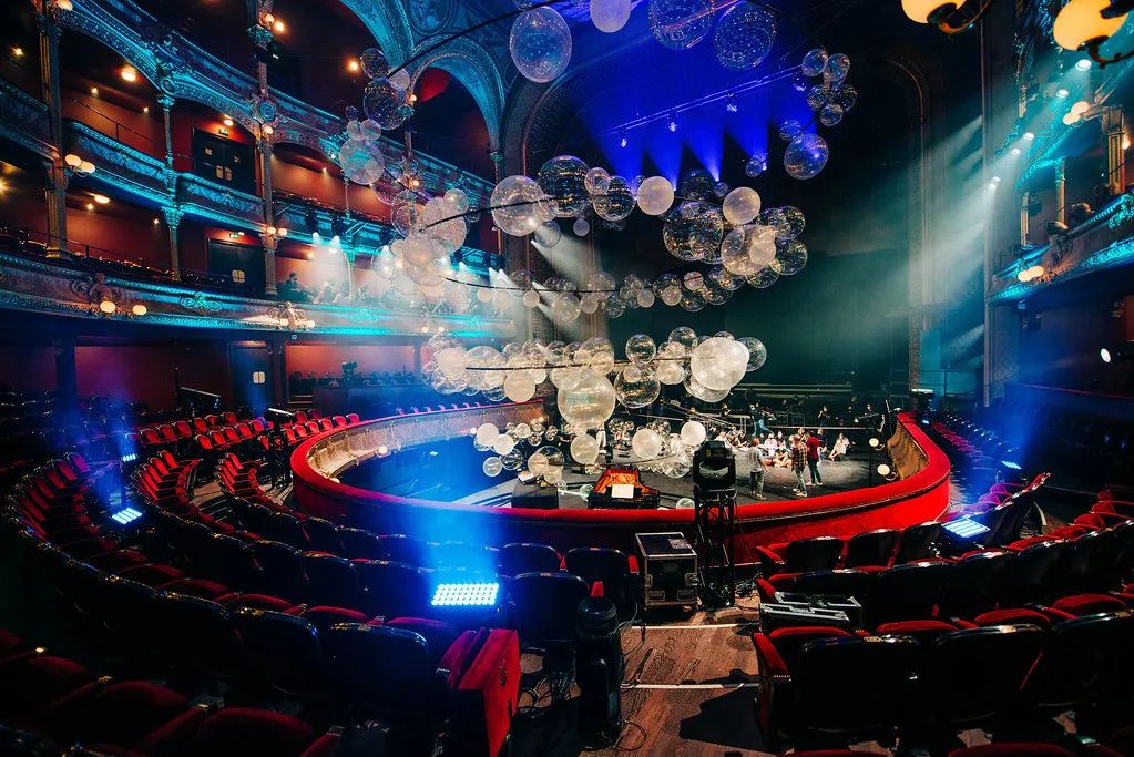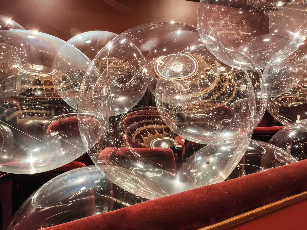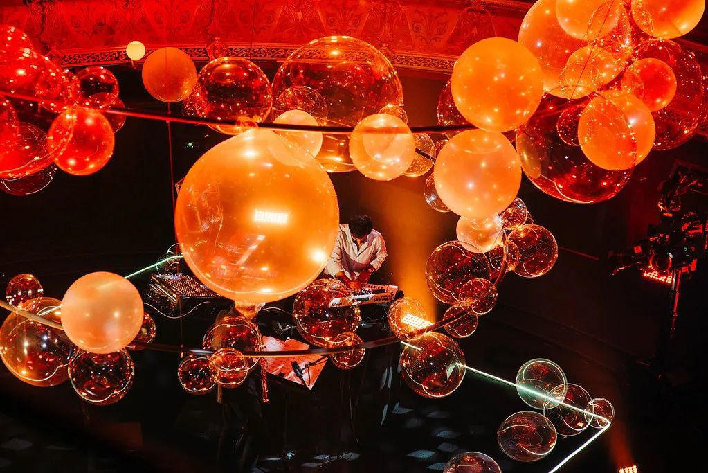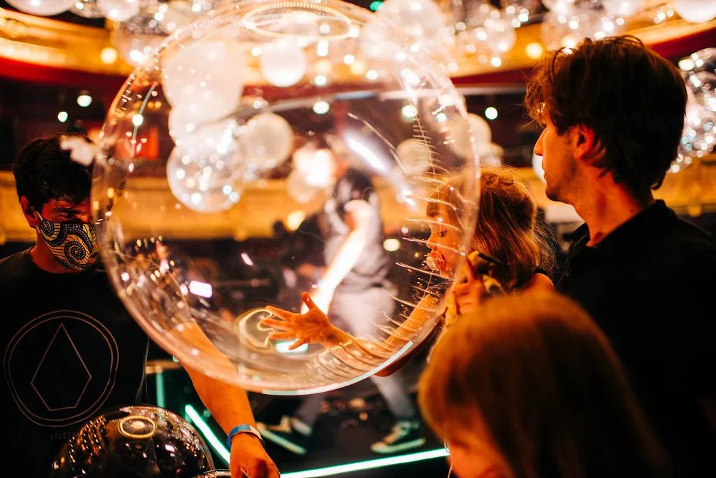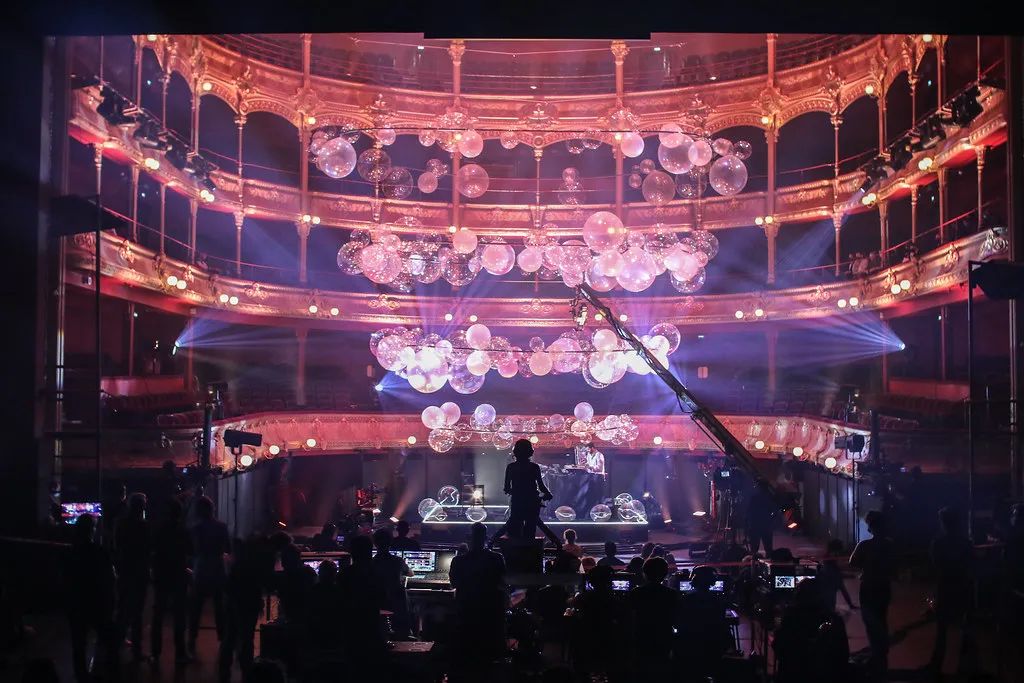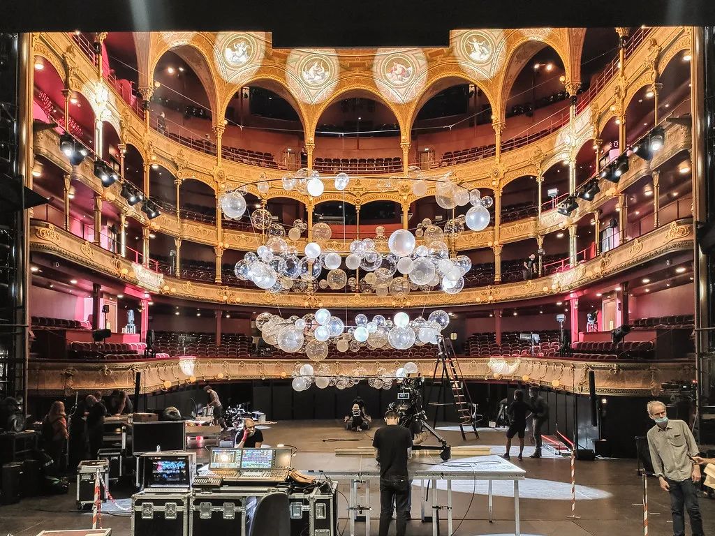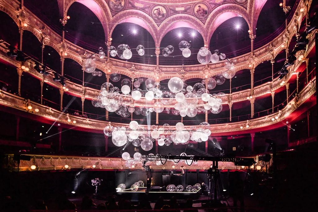 Collective Parenthese完全打破艺术界线,利用自己的第五个Variations作品,在夏特莱大剧院中把这种震动具象化。变幻的艺术装置、炫目的灯效、上天入地的空间创意,设计中还有一个回声装置,声音从舞台传向上方的吊灯。环形支架在空中的分布与剧院四层看台的形状和节奏相一致,闪烁的透明气球则代表了空中飞舞的轻盈音符。