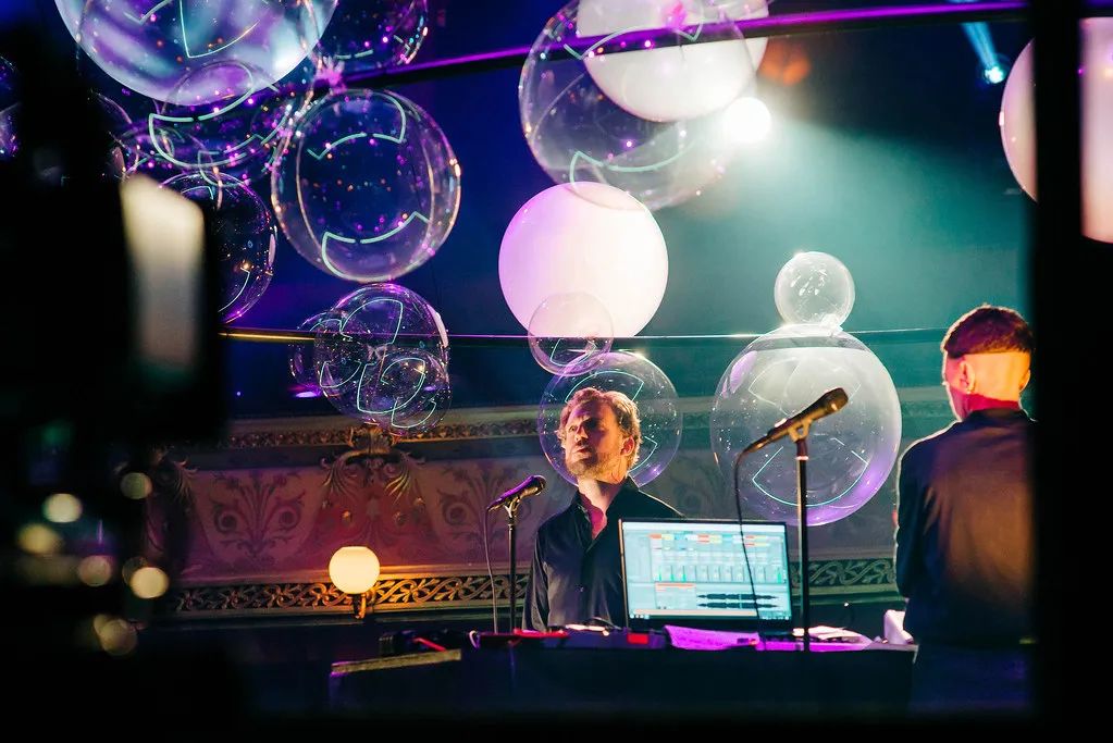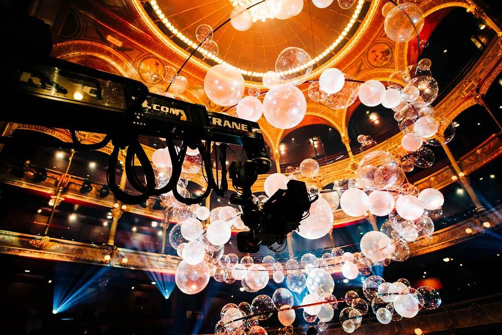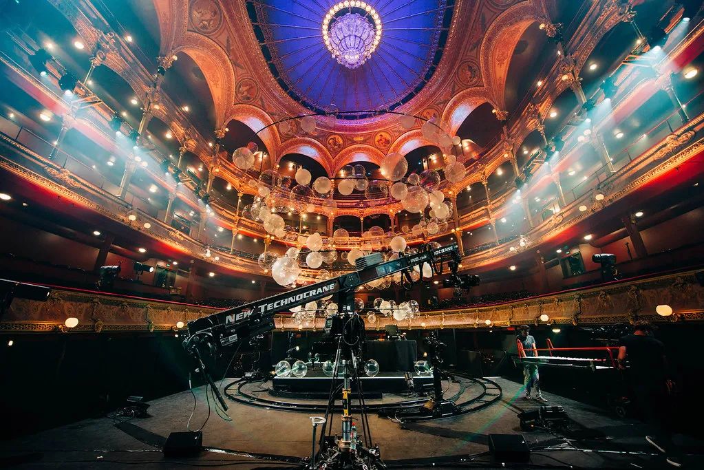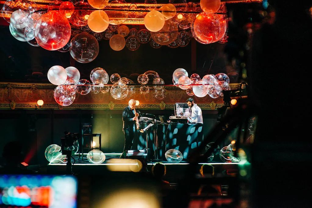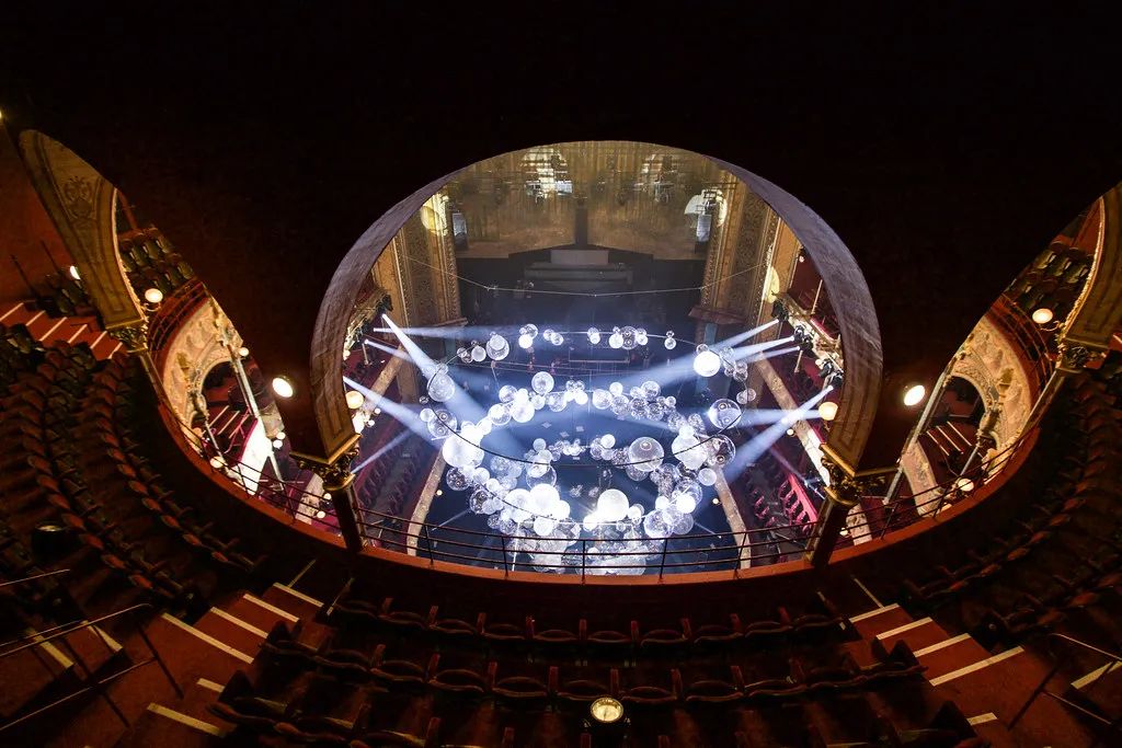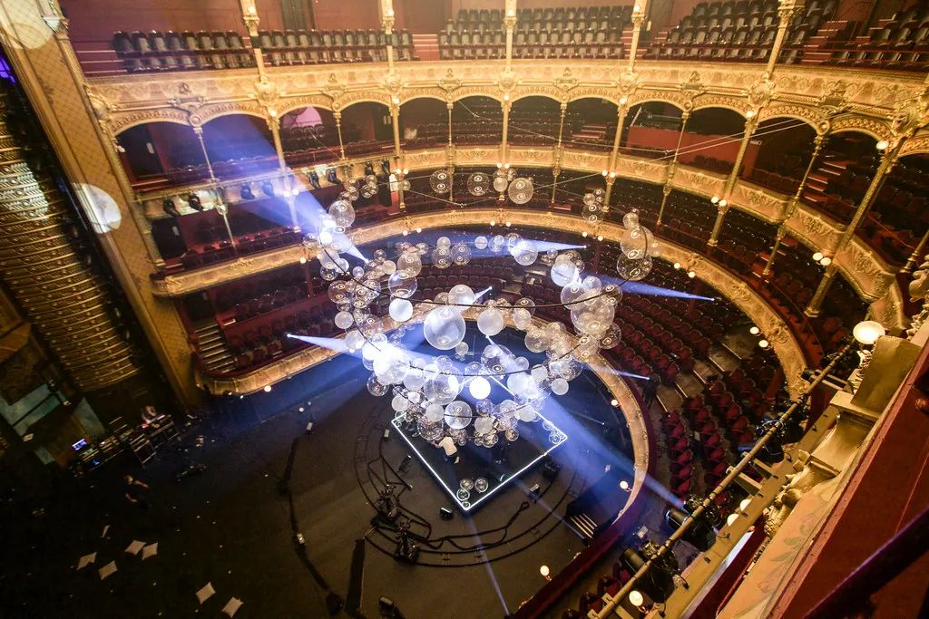 装置由4个大吊圈组成,这种场景让二重奏演奏家们可以沉浸在他们的演出中,同时突出了剧院建筑的特点。球是透明的,可以捕捉灯光和光线,同时不会对演出者或者舞台遮挡。演员可以与观众之间充分的互动,富有创意的空间装置设计,环形支架由黑色pvc管制成,与看台的节奏相互呼应。