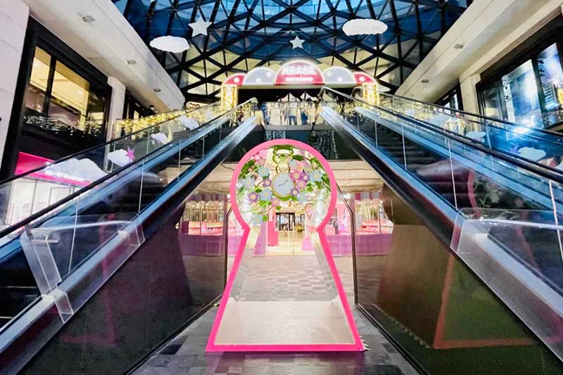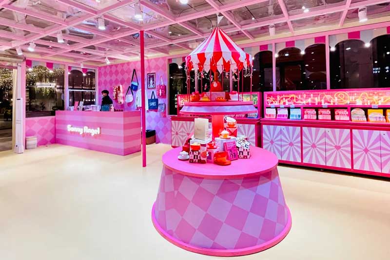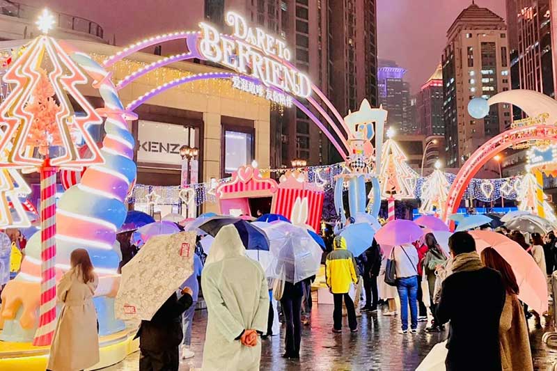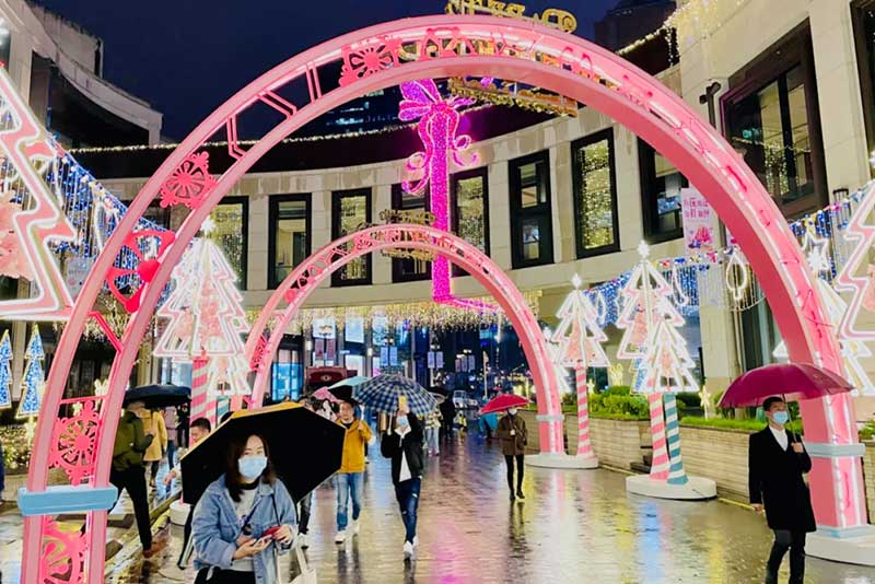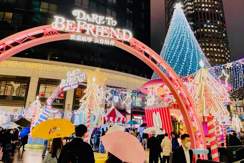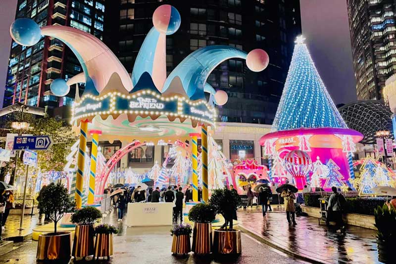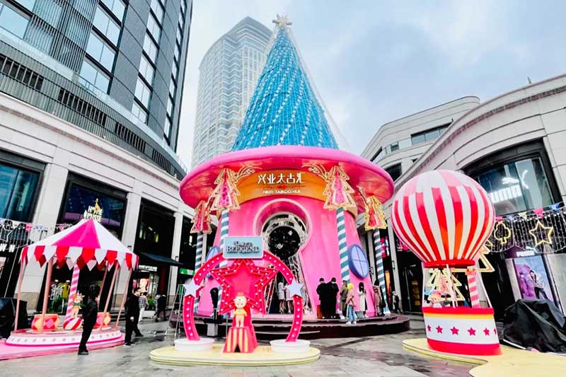 此次圣诞装置除了将此前圣诞树“升级”为了圣诞树屋,并且采用了马卡龙粉蓝配色作为今年的主题色,视觉层面也更为柔和,包括正对吴江路的门头设计,童话感更强烈。