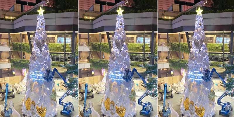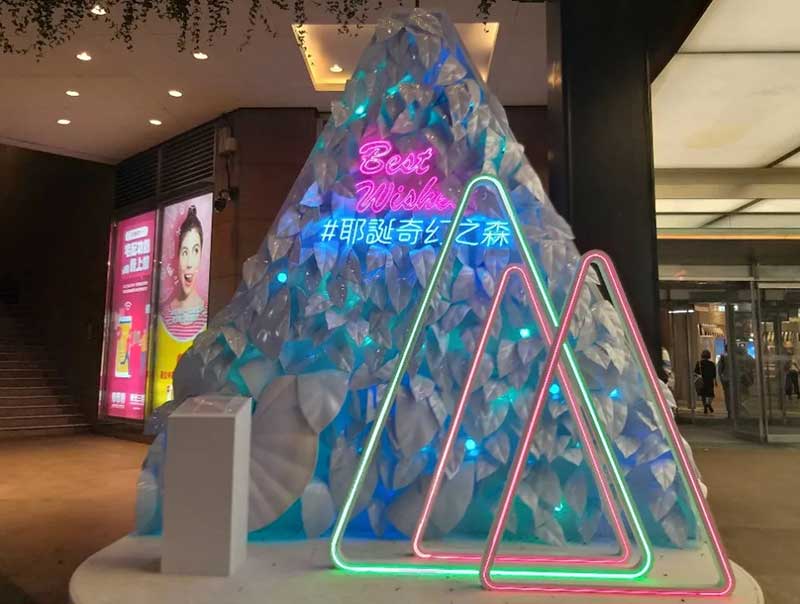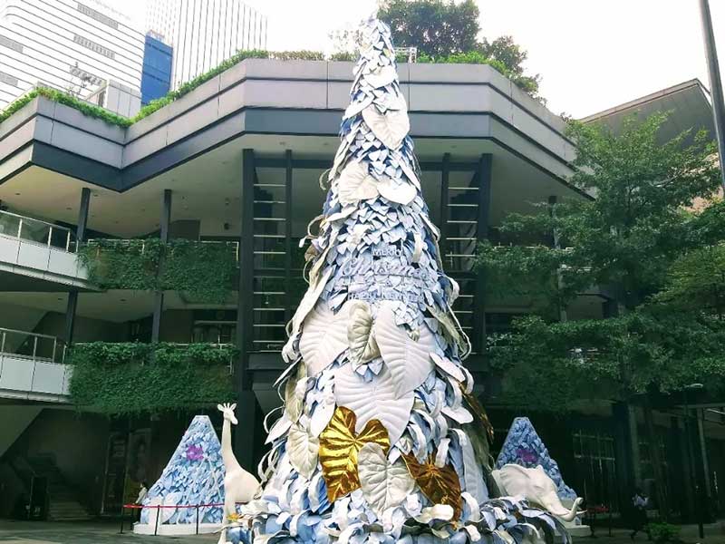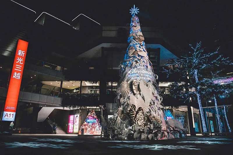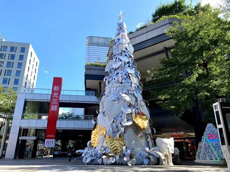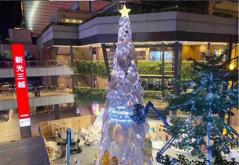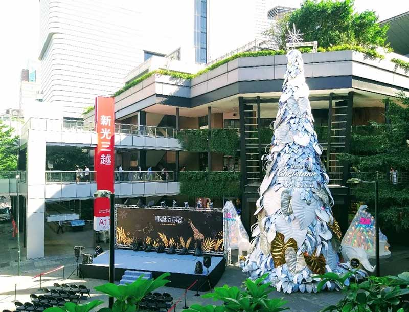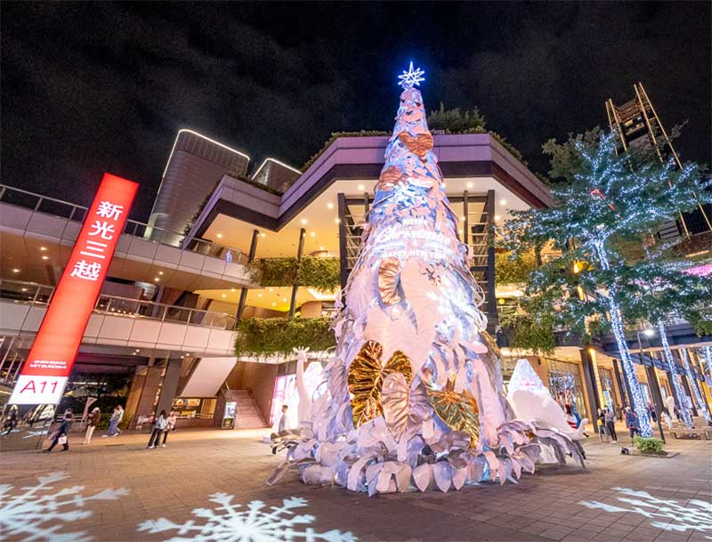 因应地球日50周年,新光三越今年以「永续的共生」为概念,17米高的雪白圣诞树造型与往年不同,以纯白热带植物叶子装饰,既高雅又梦幻,号称是「全台最美的耶诞树」,简约白色点缀金银色,是纯净、共荣的象征,运用五万个宝特瓶及玻璃瓶(1.5吨)再生原料混合椰子纤维,制作成五千片栩栩如生的叶片,以人工堆叠的方式,聚集成纯白色的希望之树。其中六成以上仅使用剪裁及真空方式制成,无添加余漆剂染料,拆除后可完全回收,大幅减少活动后产生的废弃物量。