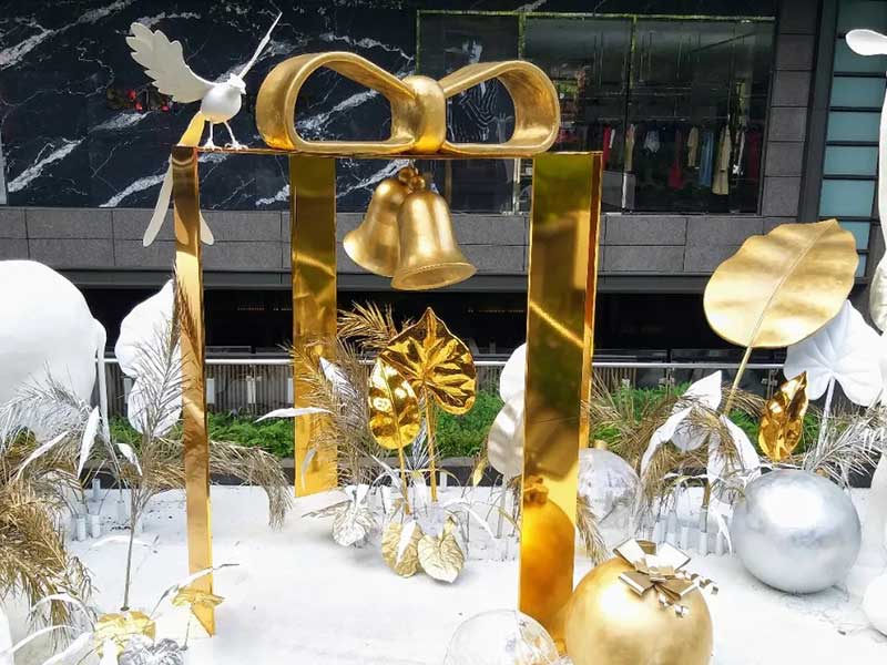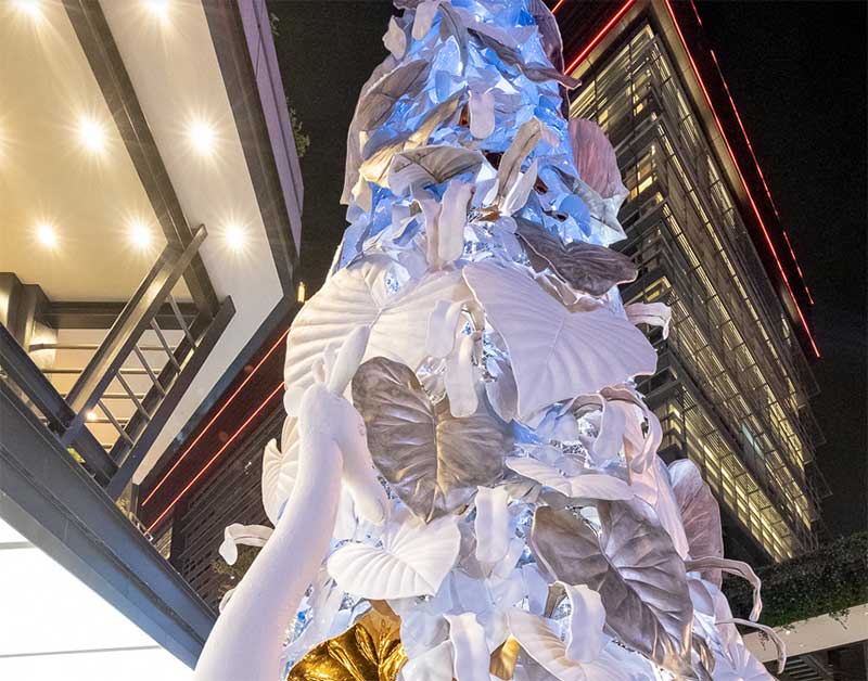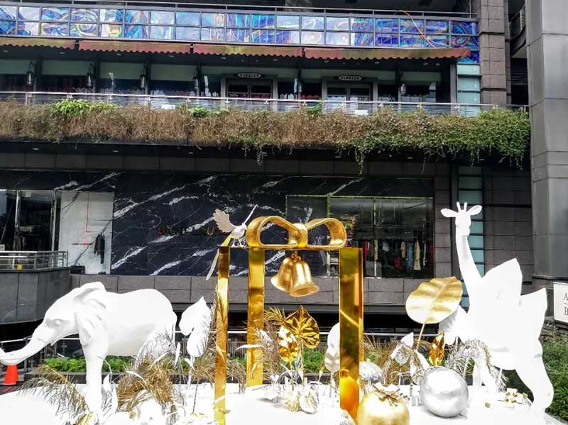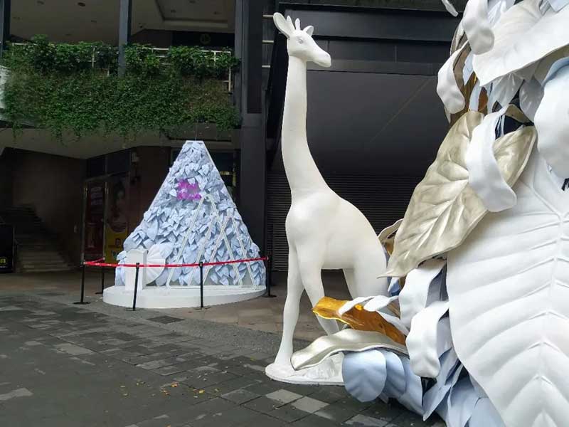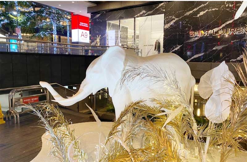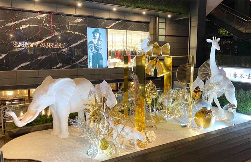 北欧风格的白色耶诞树为主角、并点缀金色叶子,周围还有大象、长颈鹿等动物环绕着,如同来到浪漫的森林中。纯白长颈鹿、大象,运用再生材质结合椰子纤维作为模型的表面材,刻意不做其他再加工的涂装漆料,自然呈现纤维丝及粗糙质地,不仅减轻了以往制作的雕塑品的碳排放一半以上,运用的材质于结束后,也能自然分解。