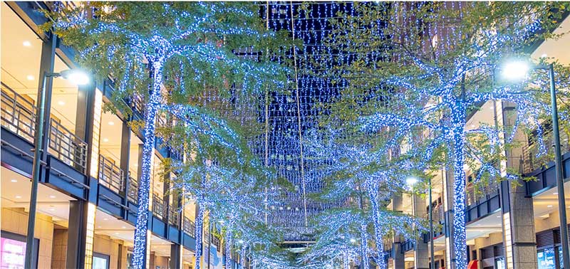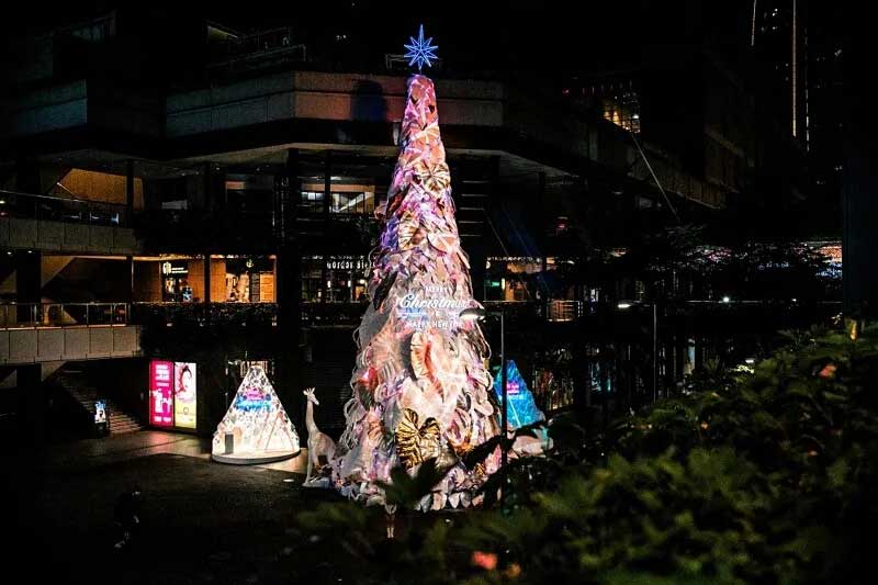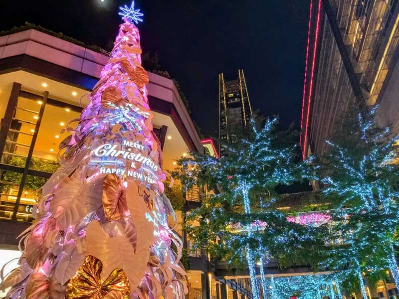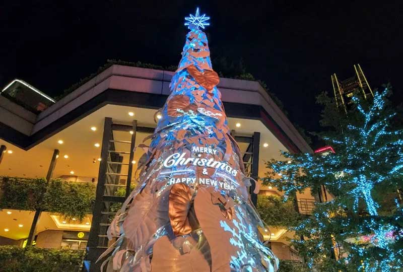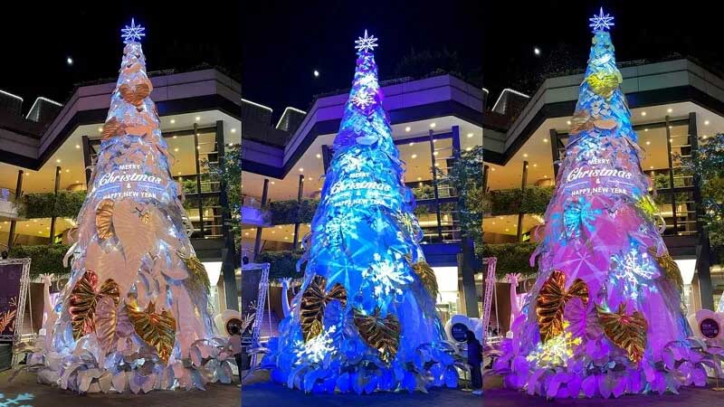 到了晚上整点时,还会有圣诞树光雕秀登场,伴随着光影变幻,原本纯白色的巨大圣诞树,不断地换上不用的色彩;在此同时还会从圣诞树的后侧洒下雪花。
