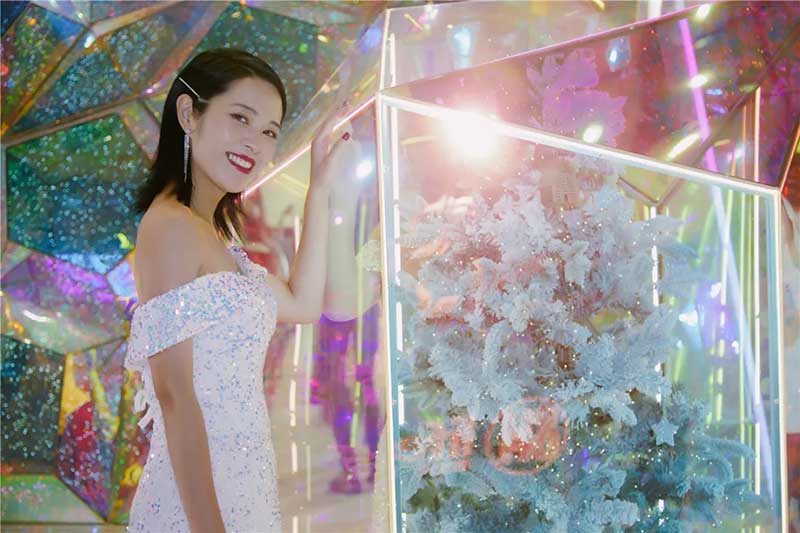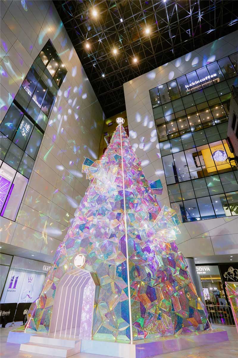 多棱的晶体挂枝于树身,犹如破土之笋,喻示着更加自信绽放的自己,不甘平凡,不畏将来,向光而行。在不同的时刻,站在不同的角度,这棵圣诞树都将呈现出不一样的色彩,每一个站在圣诞树前的人,都仿佛能够拥有一颗只属于自己的,散发光芒的圣诞树。