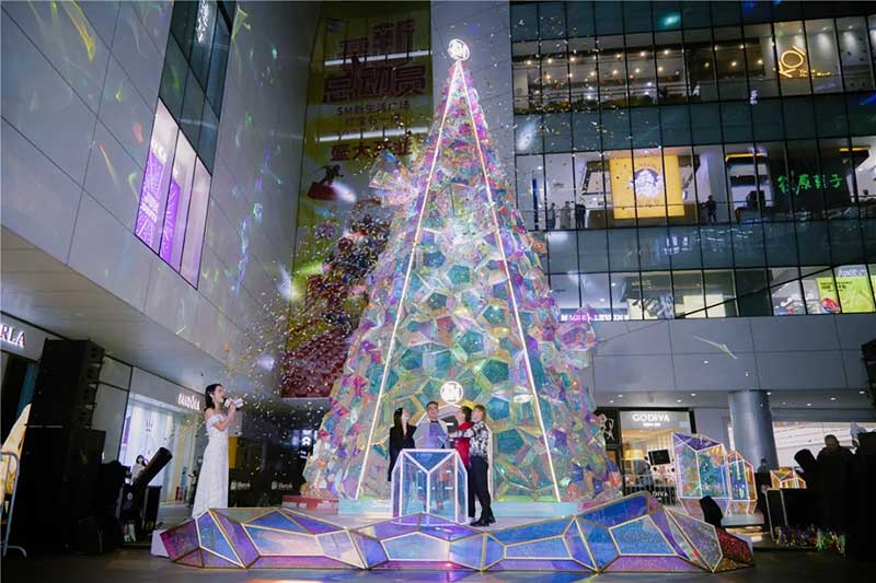 这是SM新生活广场首次独立进行创意设计的圣诞树,基于SM建筑中本身红、黄、蓝三个宝石的基因,打造高达16米如宝石般闪耀的圣诞树。白天素颜时的圣诞树,本体的幻彩镜面材质单靠自然光,就能折射出斑斓的色彩。夜幕降临后,绚烂模式恣意开启,璀璨梦幻的光影让你满眼星光,同时在环境灯光的映射下,在四周建筑的墙面,玻璃幕墙上,都折射出绚烂的光影。