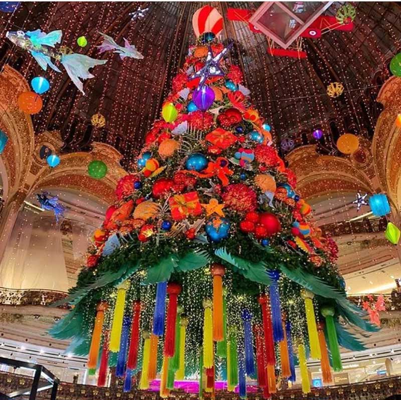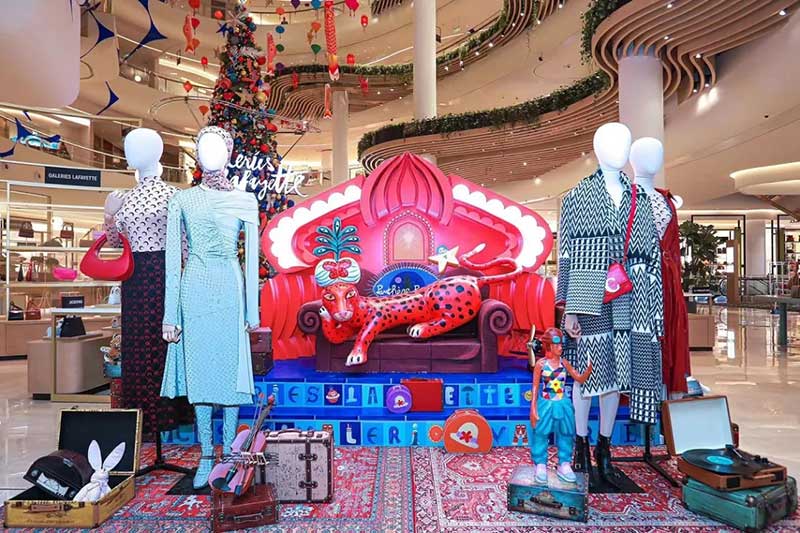 老佛爷百货店有不同主题圣诞场景打卡点,其中有戴着阿拉伯风情羽毛头饰的红色豹子代表着古老又神秘的异域文化,与圣诞的节日气息相得益彰;色彩斑斓的俄罗斯套娃、寓意美好的天堂鸟和欢快活泼的猩猩等诸多元素融合在一起,以奇趣的视角为顾客呈现飞行员的圣诞环游历程,串联起不同的地域文化,传递着同样的圣诞祝福。