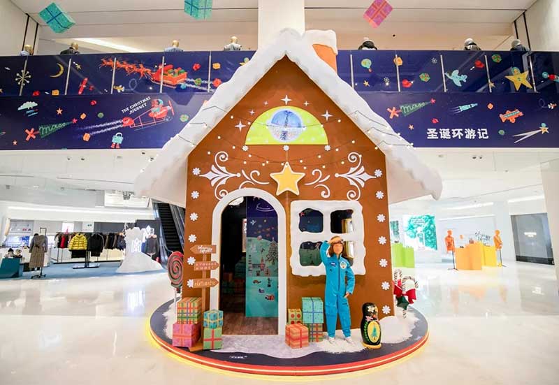 穹顶的巨大圣诞树展示了成千上万的礼物,让每个来到的人都很开心,工作人员还会让圣诞装置每30分钟闪耀一次。红色的飞机沿着圆弧形的轨道绕着圣诞树盘旋,螺旋桨在树顶画出优美的弧线,带给顾客身临其境的梦幻体验。