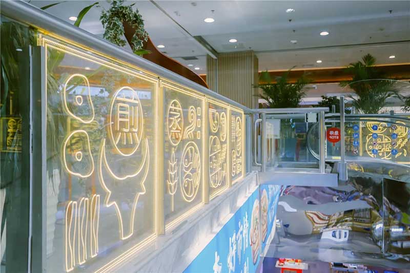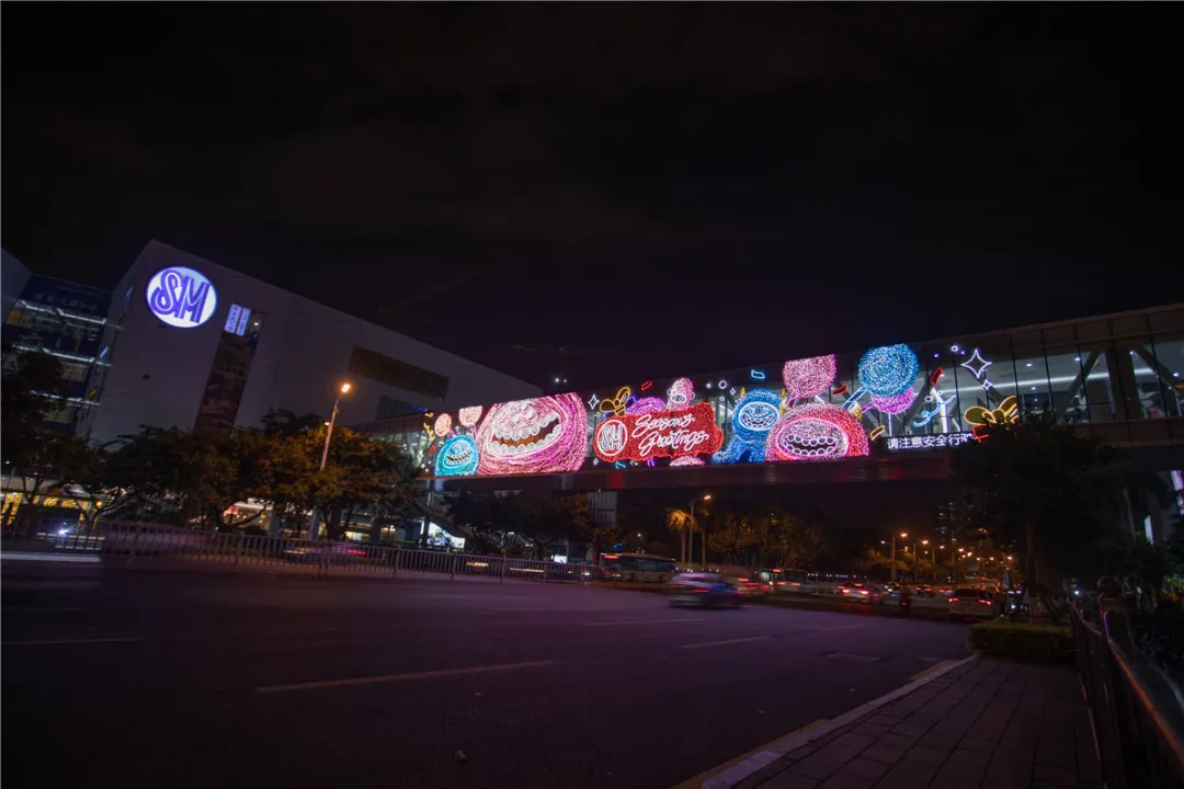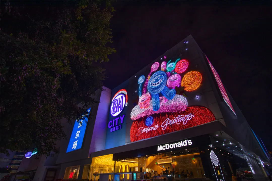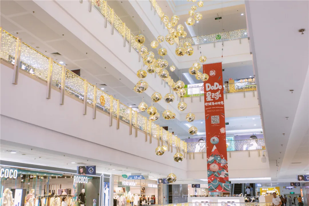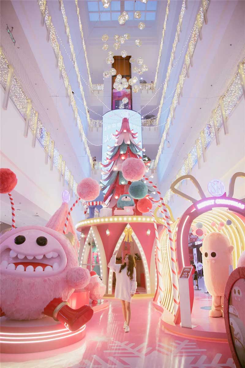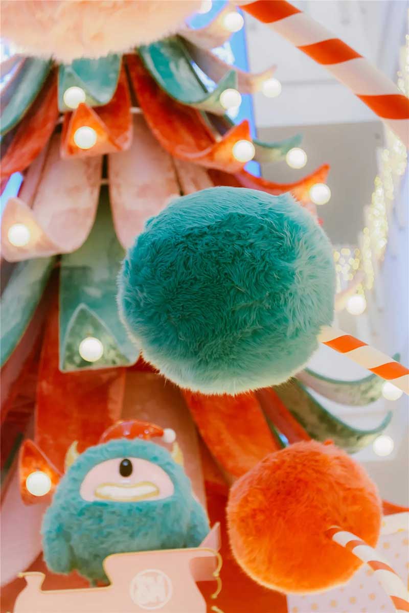 霓虹闪烁的DODO星人造型灯饰、炫彩夺目的DODO家族灯画、火树银花的金色灯幕,揭开了2020SM“DODO星球毛绒圣诞世界”的神秘面纱。5只来自DODO星球的“小怪兽”们,外表柔软,却搞怪夸张的在SM创造了一座“毛绒圣诞世界”。她们用俏皮的粉和满是圣诞气息的红绿搭建了一棵11米高可爱又热情的圣诞树,层层叠叠的毛绒树叶尖儿上隐隐闪着暖暖的灯光,伴着摇曳舞姿的DODO星人和堆满礼物的雪橇车,欢乐而惊喜。