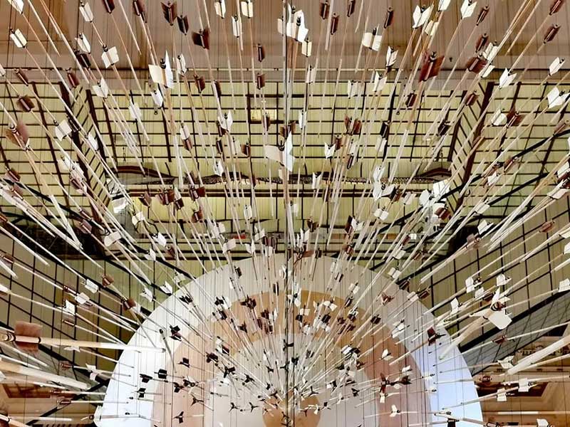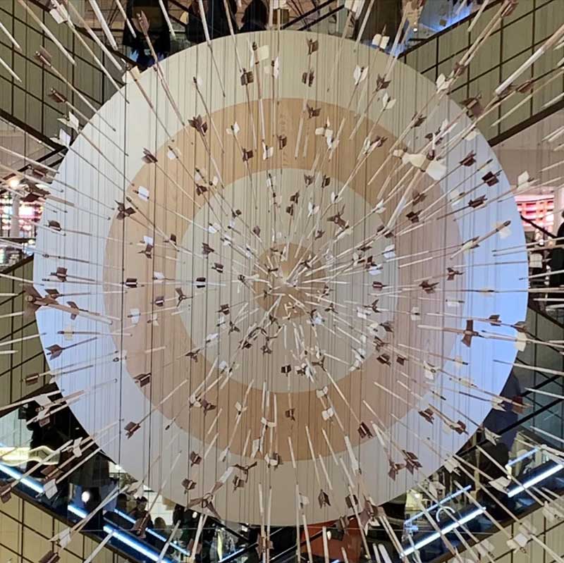 这个艺术装置具有纪念意义,它向防治乳腺癌致敬,乳腺癌影响到大约八分之一的妇女,需要早期发现才能更好地治愈。这数百支羽毛箭头代表化疗射线,它们射向这个乳房形状的射箭靶。这个巨大的乳房也代表着生命,就像锯树干一样。因为当你砍树的时候,你可以把所有的生命都砍掉。通过这些形状,你可以识别出严冬和神奇的夏天,就像人类生命的隐喻。这座巨大的空中作品,被称为“原始亚马逊”,“原始亚马逊”被理解为战胜疾病的隐喻。病入膏肓,心里犹如千箭穿梭。