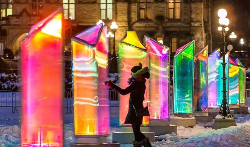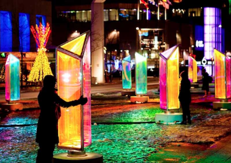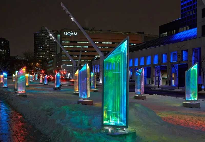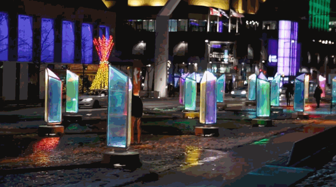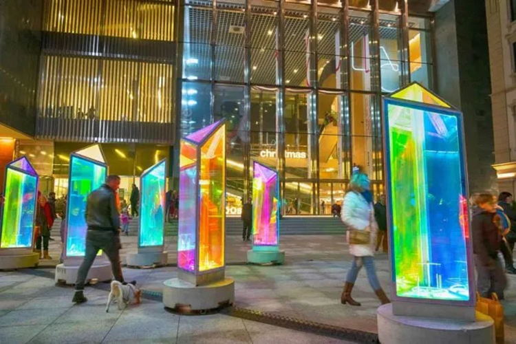 每一个棱镜都覆盖着二向色膜的面板构成的,并产生无数的彩色反射,随着光源和视角的变化而变化。每个棱镜都安装了一个底座,底座上有一个投影仪,当夜幕降临后,这个投影仪为装置提供了一个新光源。装置本身附带着音乐,加上万花筒般的色彩,为行人创造一个五彩缤纷的穿行环境。白天时的Prismatica,缤纷的棱镜还是很美的,不过夜里看起来更多了一种科技感的俐落和张力。