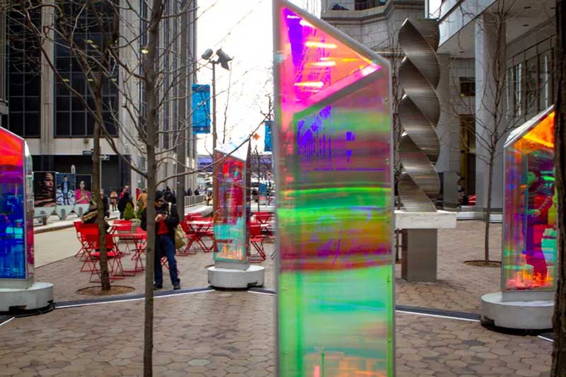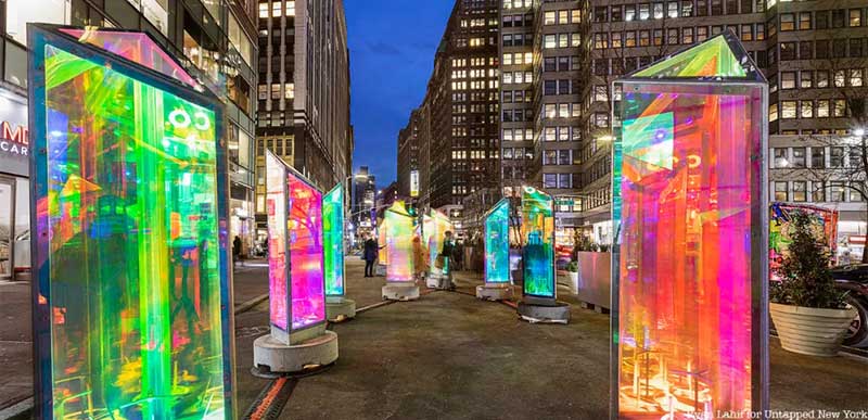 最近,「Prismatica」互动灯光装置来到曼哈顿中城百老汇大道(Broadway)39街~40街之间,也位在「Garment District」街区之内。这是由RAWDesign以及ATOMIC3合作的项目,在街上摆放25个色彩缤粉的旋转三棱镜,每一面镜高6英尺,游客可以转动佇立着的棱镜,让光影翩翩起舞。
