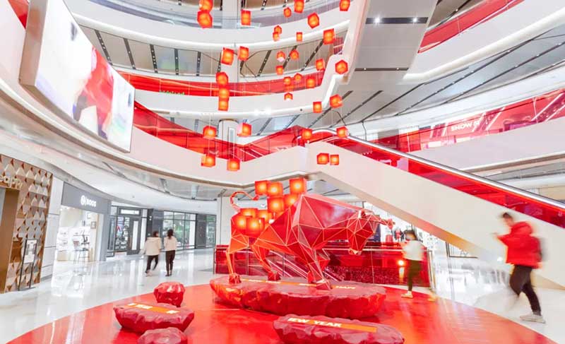 中心正门的新年主题装置则以质感取胜:五排阶梯形展示的红色灯笼,左上角还点缀着大型复刻版「包装丝带」,超高颜值瞬间吸睛!论如何兼具时髦感和科技感,BFC早已为你提前演示:3D全息装置“牛转乾坤”将中国传统生肖形象与前沿科技结合呈现,并融合BFC外滩金融中心的潮流属性,超用心的同时还十足年味。无论是上方还是内部都大有来头,天空吊挂着的方块装置仿佛正一层层从上往下叠加,中间则是以20面超大红色镜面打造的小型空间。置身其中,似乎虚拟世界和现实世界的界限正被打破,折射出立体丰富的动态场景,寓意来年财运加倍聚集。