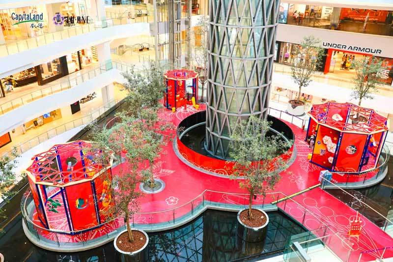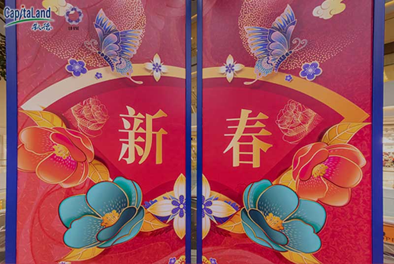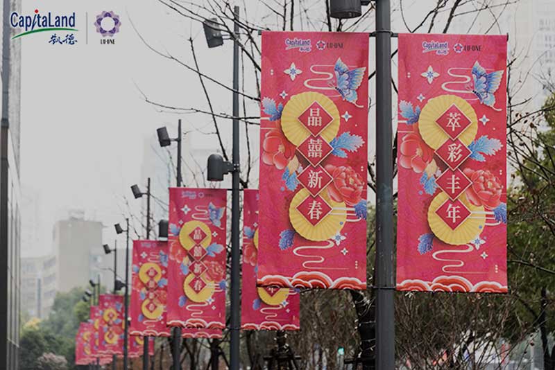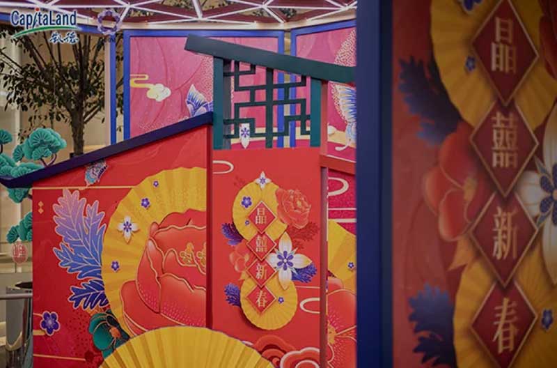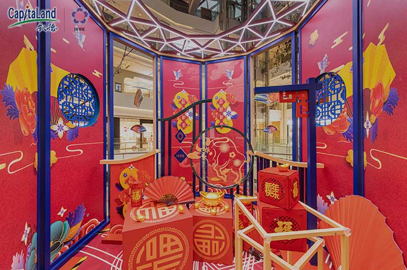 刚刚走进就能看到高大气派的贺年大门矗立于此显得格外瞩目,高高的门头高挂着出传统春联,将中国年的喜庆与豪迈尽显无疑,跨过这道囍门,便是跨入新春跨入崭新启程的一年。