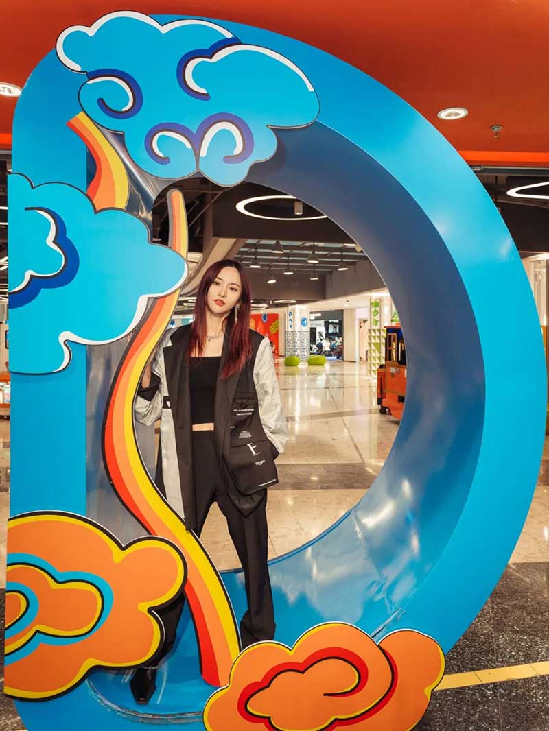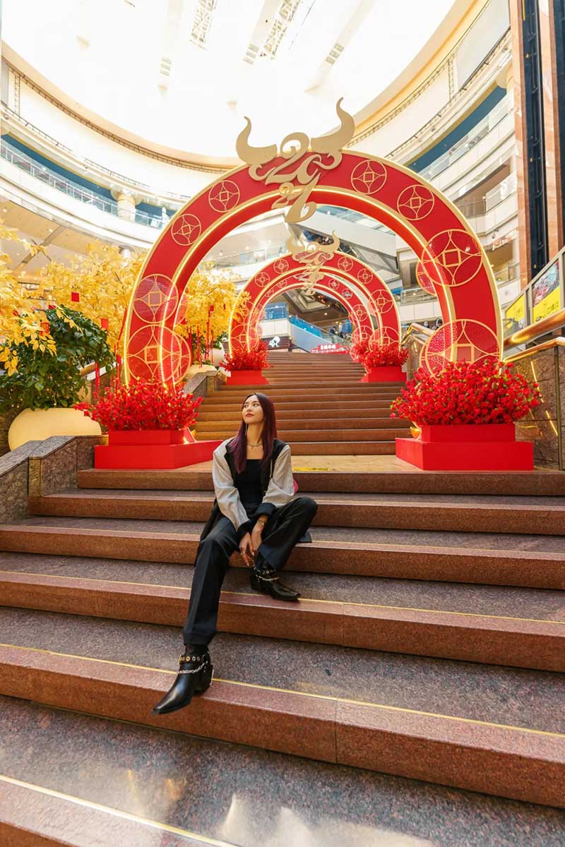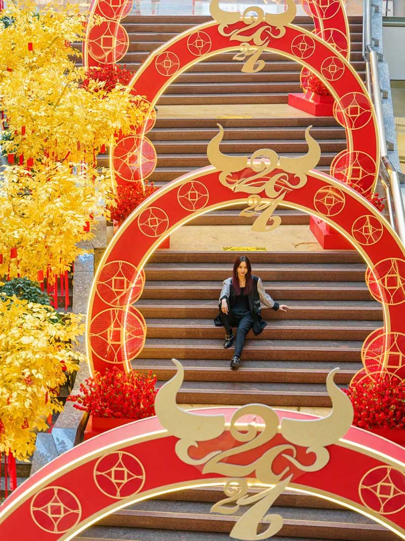 二楼的儿童区域,也换上了缤纷的节日装扮,让大小朋友们都能在这收获新春童趣。“KIDS”字样的装置,全部点缀上了卡通的彩色祥云,全家人一起来逛的话,还能各自拥有一枚特别的字母打卡照。为你带来更多的节日好礼。连通四楼和五楼的大阶梯,是正大广场出了名的拍照打卡地,换上节日装扮后,这里也变得更好出片了~布置着金色钱币和牛形图案的红色拱门,层层叠叠延伸到台阶顶部,像是一条时空隧道,带着你通往好运连连的新一年。
