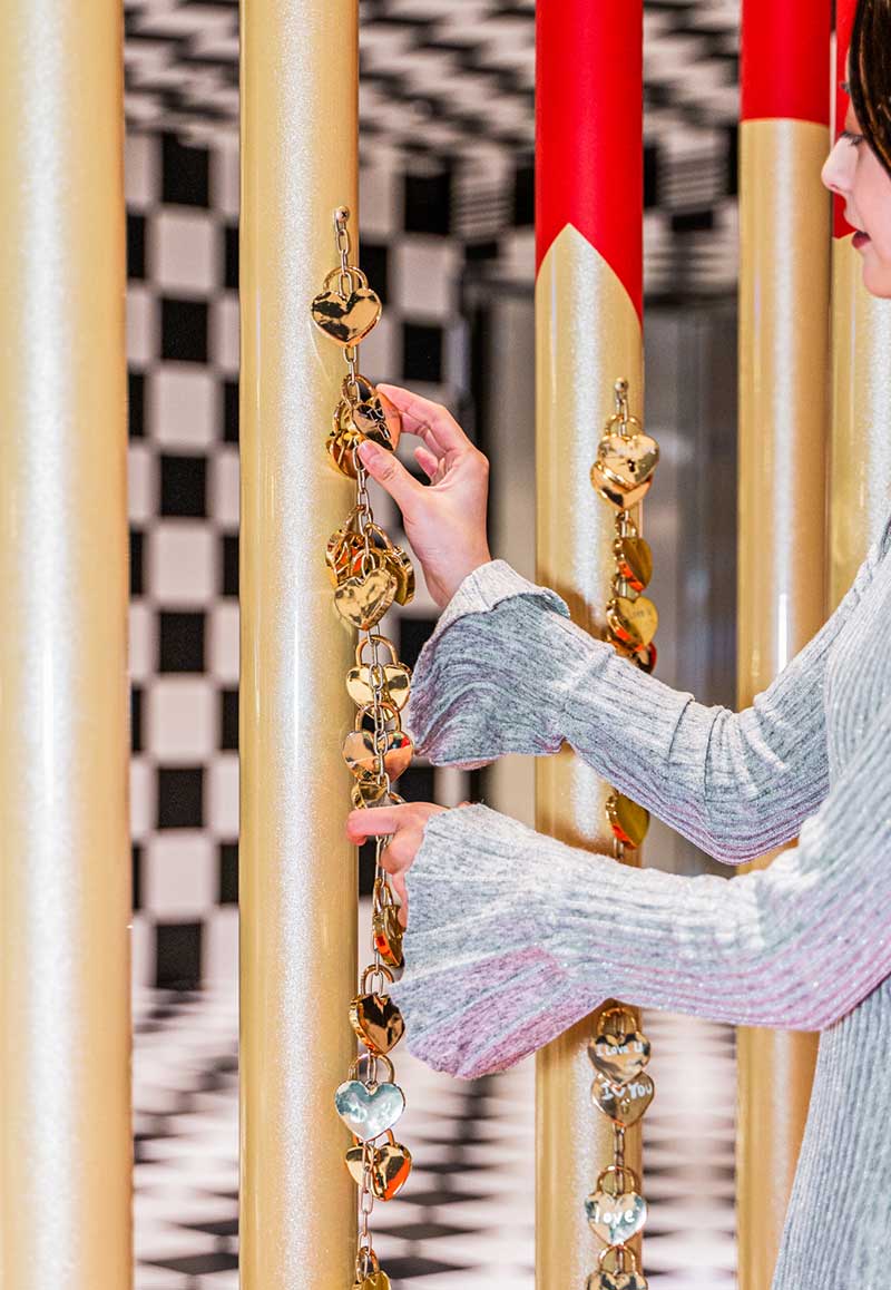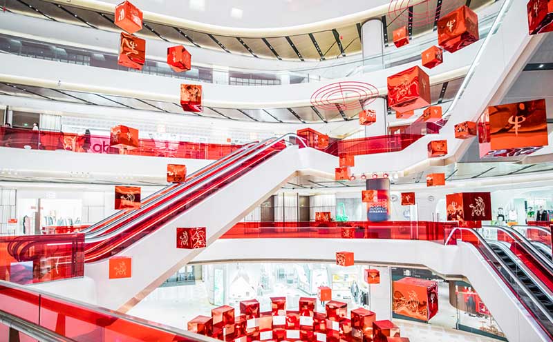 新年想要“牛”转新意?BFC给你开年好运buff加持,融合中国传统生肖形象与科技的3D全息装置“牛转乾坤”,在炙热新年集结好运,让你的2021红火一整年。近20个超长3D裸眼嵌入屏相互交映令人仿佛置身虚幻世界,群牛影像环绕间点亮开年鸿运。穿过红色的金属方块阵,抬头也是错落悬挂的红色盒子,在灯光的折射下散发着绚烂的光,让你尽享这份新年的美好畅想。