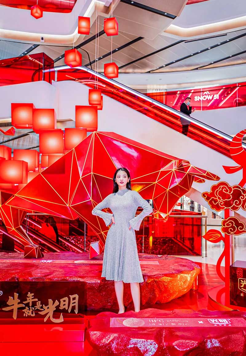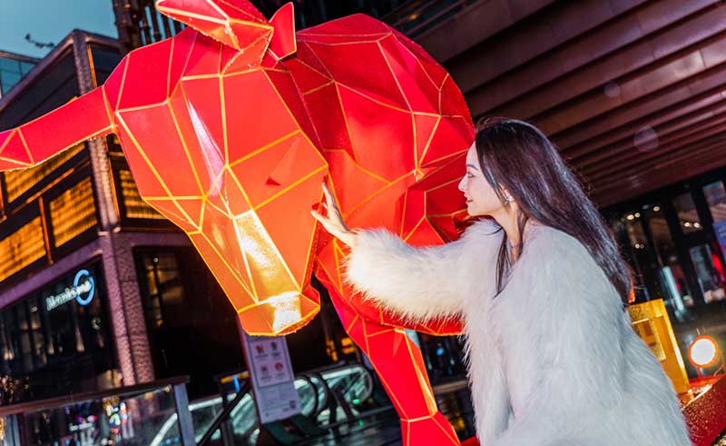 广场上还有一头红牛以耀目之姿抢占来往路人的视线,牛身分明的线条、棱角,在灯光的衬托下英气十足,为你加注满满“牛”气。红红火火的新春灯笼&丝带缠绕在BFC的商场正门,以惊喜礼物包装的创意表达,把这份新年好礼送到了魔都人面前。