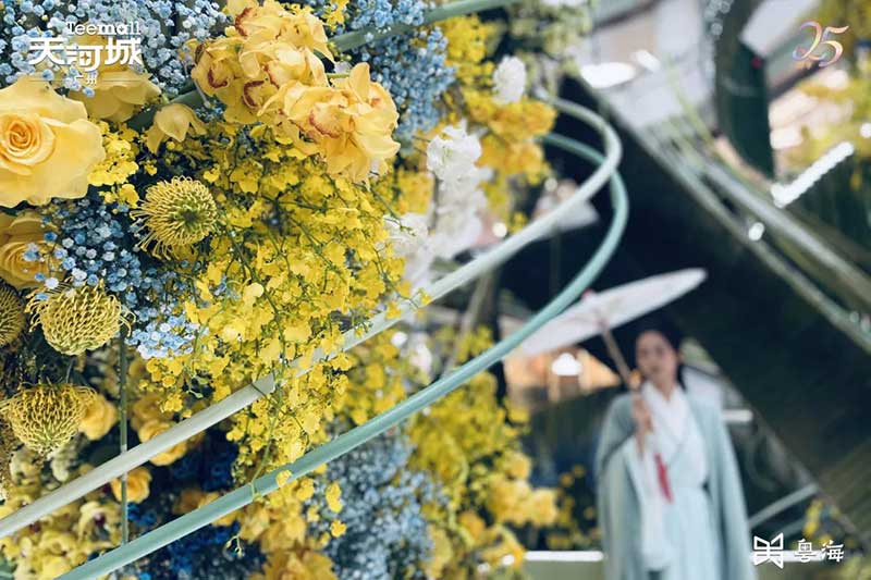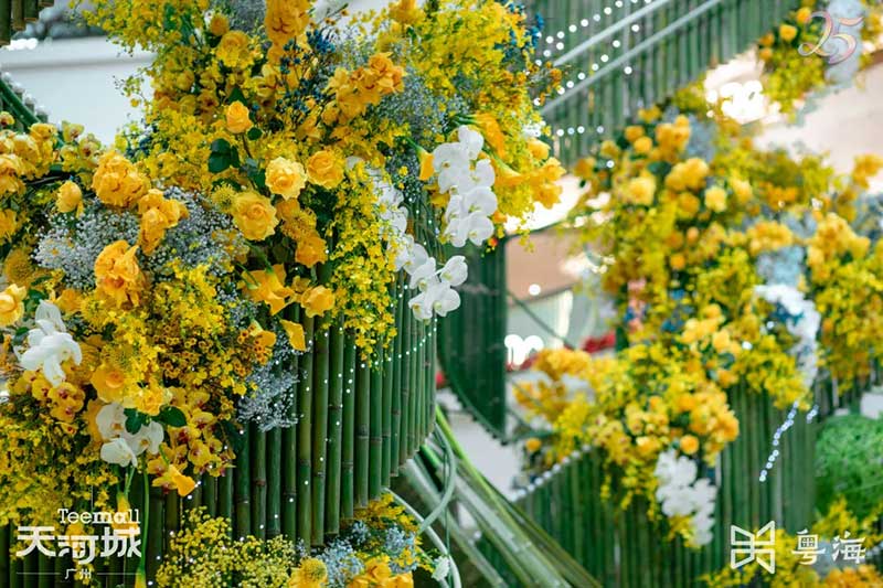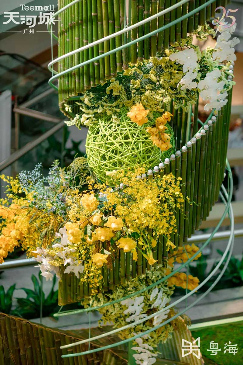翠竹葱葱,竹子凭借着坚韧、柔软的特性,成为中国人精神的象征。在光影的促动下,盘旋而上的根根竹节,迸发出“生生不息”的力量源泉。立体而通透的设计感,让人仿佛置身在高低起伏的层层竹林中。黄白跳舞兰、大花蕙兰、蝴蝶兰、马蹄莲的清新恬静与俏皮优雅的深蓝色绣球,桔梗交相辉映。团簇的鲜花星星点点,跃然于7米高的青葱竹林间,勾勒出一幅沁人心脾的和谐之景。