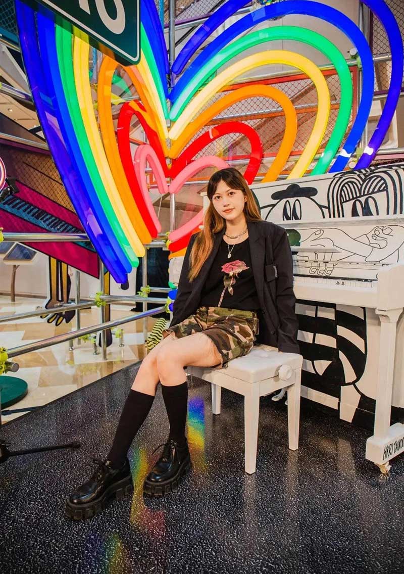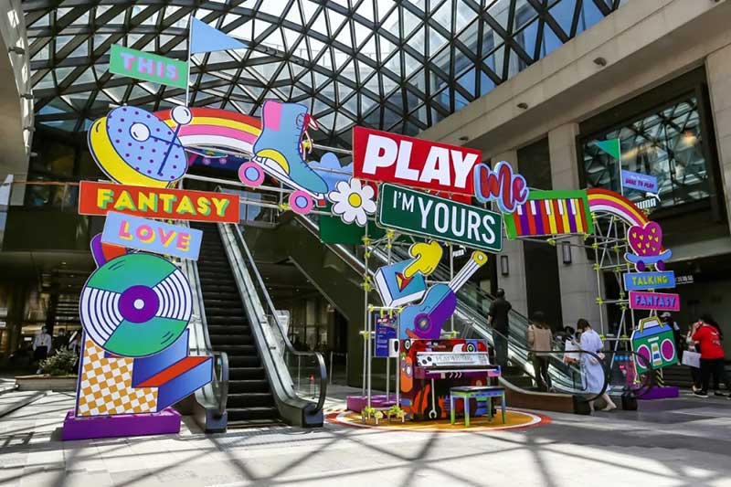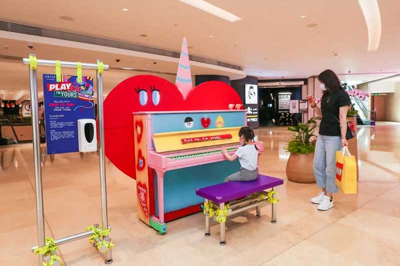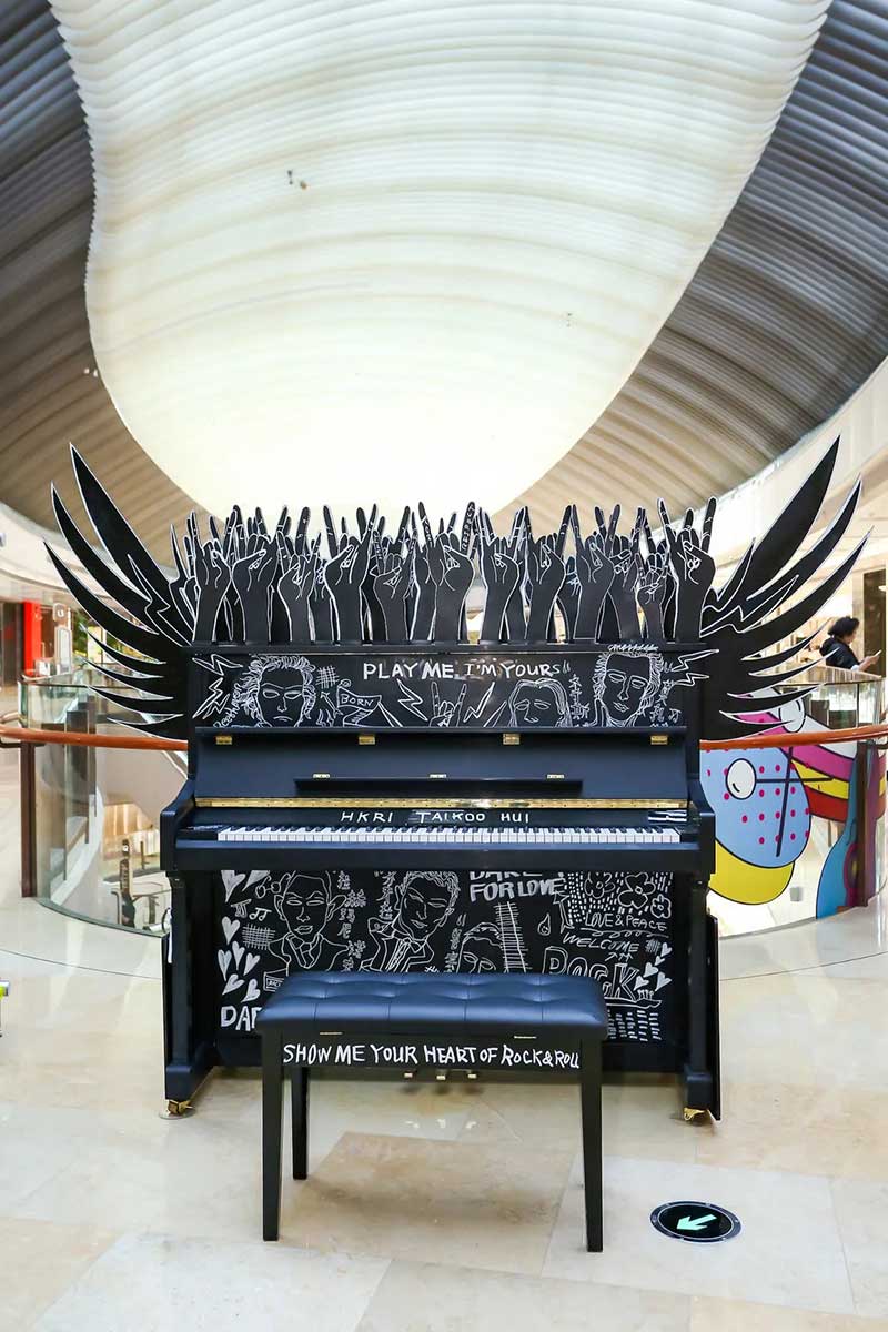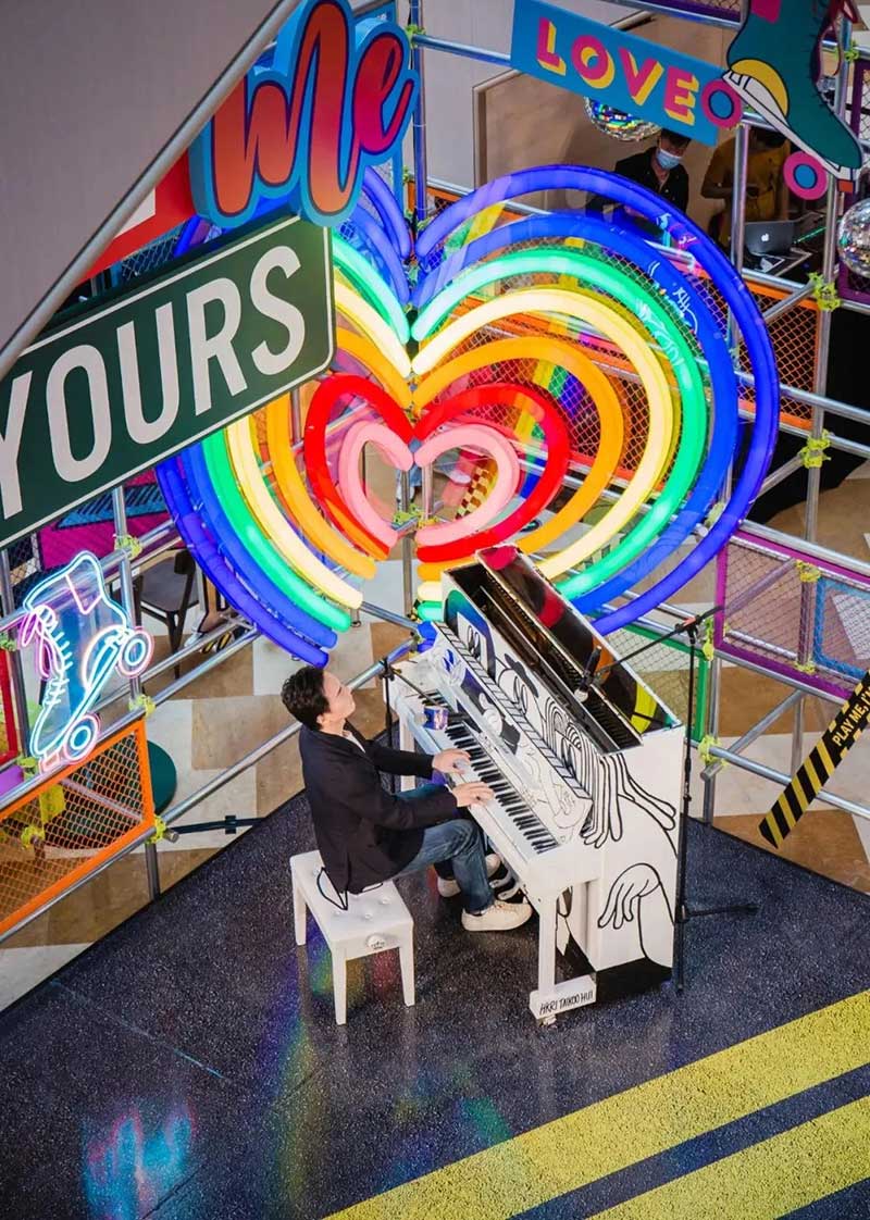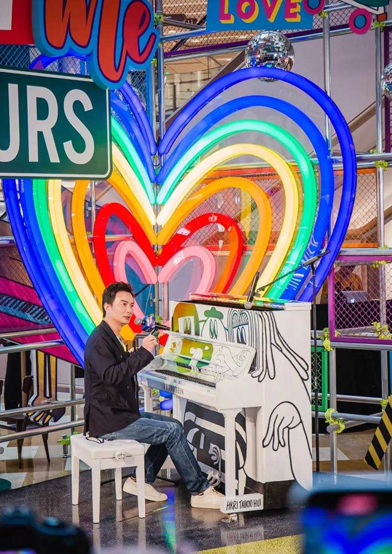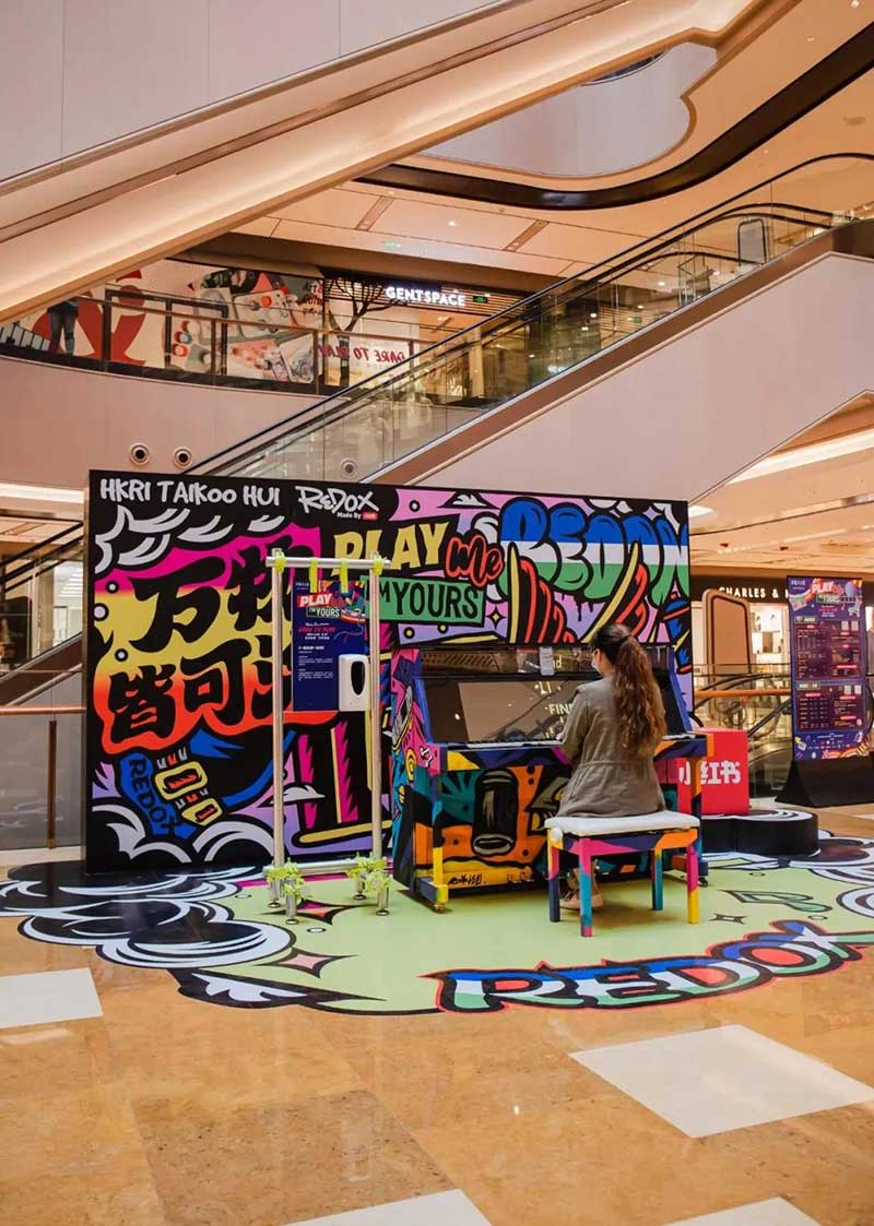 一架复古艺术涂鸦钢琴摆放在兴业太古汇北广场,楼梯口也变成了一个时光隧道的模样。穿越这个隧道,斑长仿佛来到了一个80年代音乐现场,复古的logo、动感的音乐,一场复古派对即将开启!18架复古涂鸦钢琴摆放在商场各个角落,每个经过这里的人都可以弹奏。被音乐和钢琴包裹的兴业太古汇,不但吃喝玩乐一整天,还能享受一场钢琴音乐带来的瞬间治愈。作为2021年“Play Me, I’m Yours”公益钢琴活动的「钢琴慈善大使」,听到李泉现场弹奏音乐,真的超级治愈!