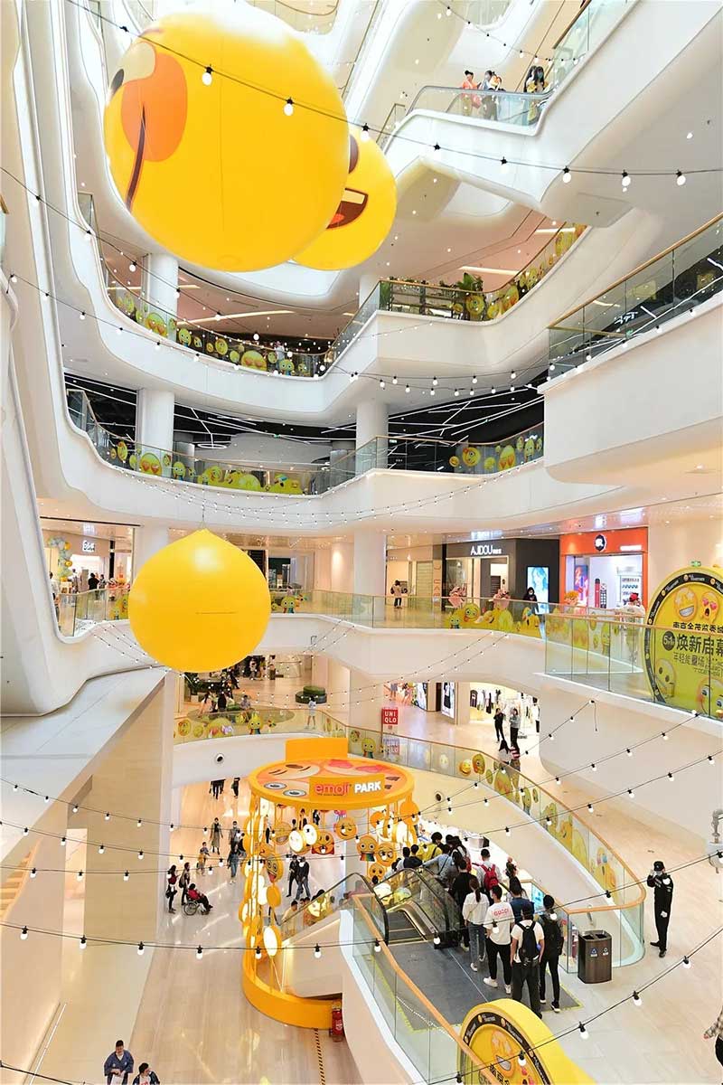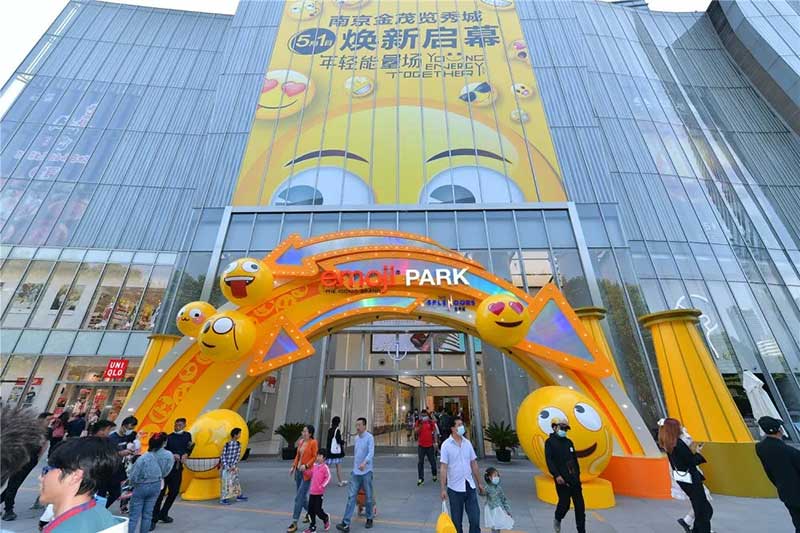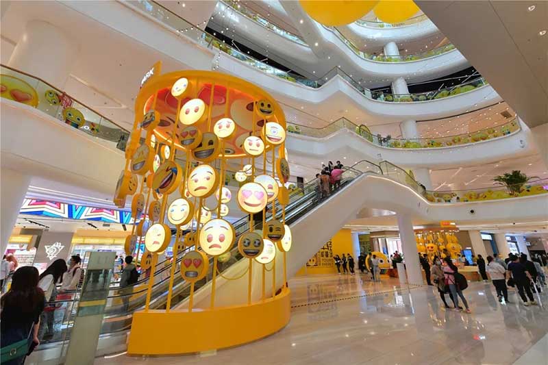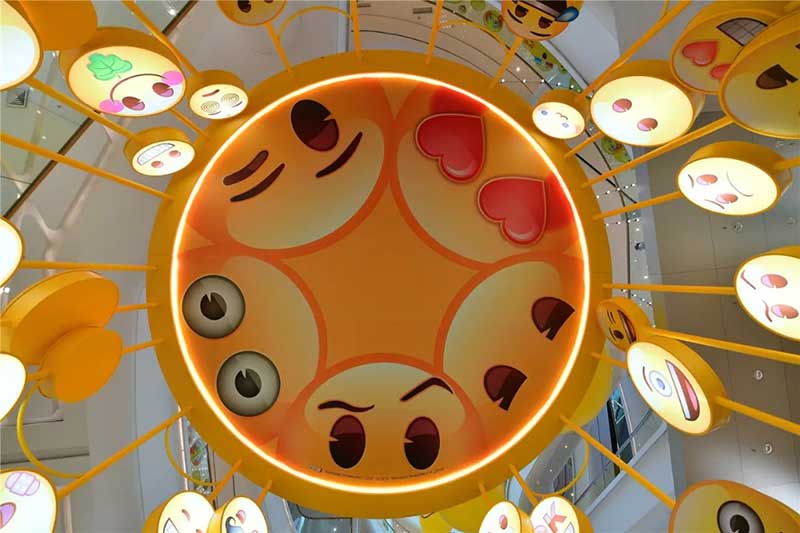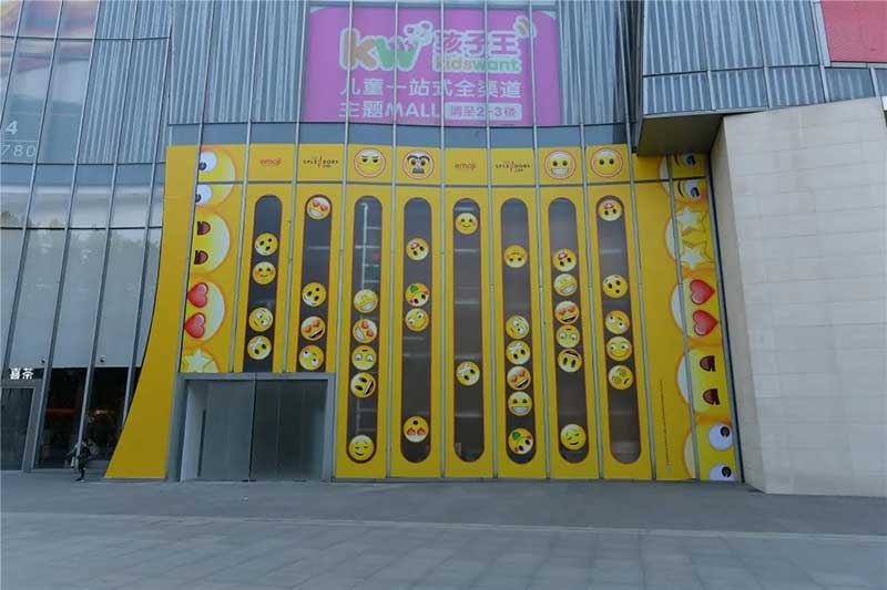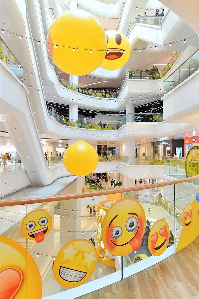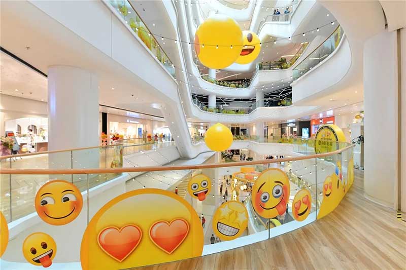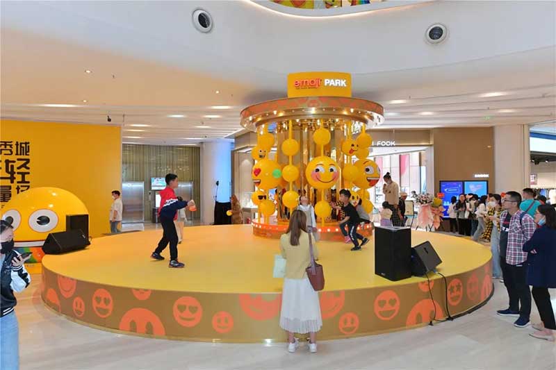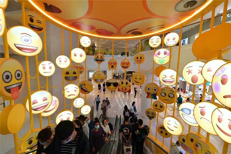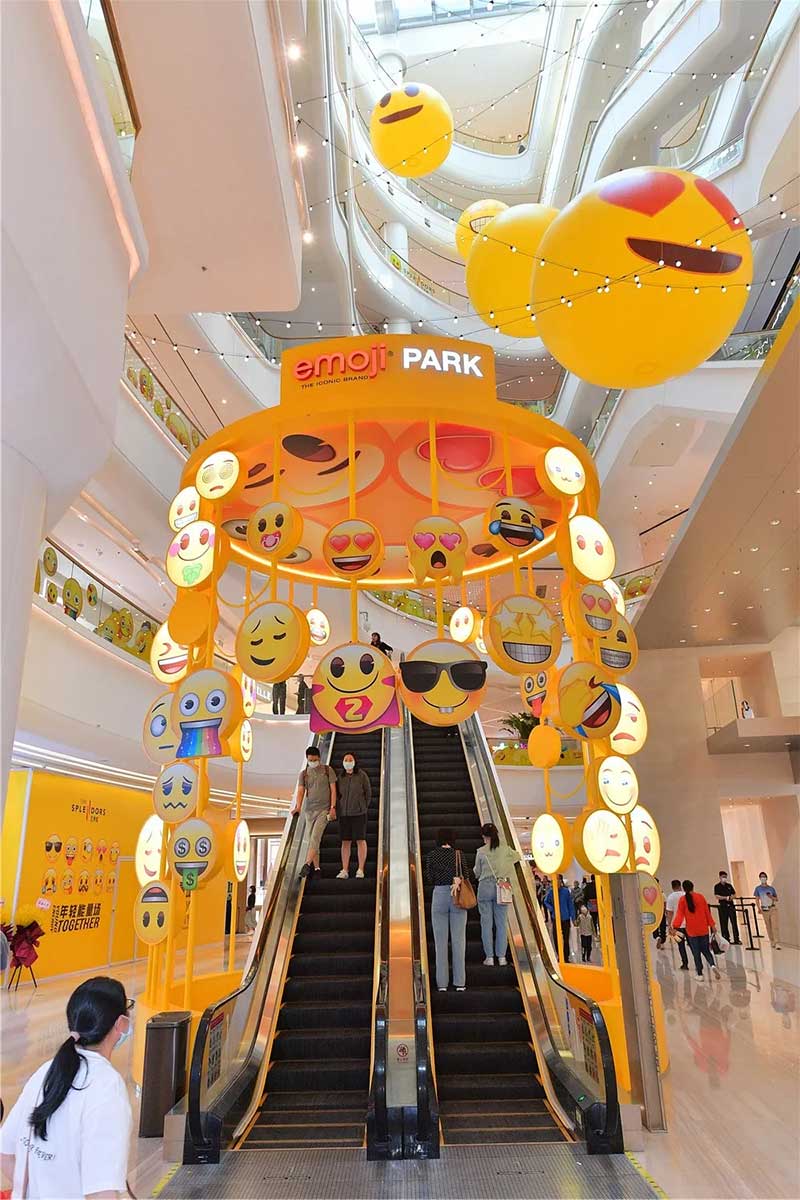 全球潮流IP emoji重磅打造emoji park 带来一场欢乐盛宴,本次设计有四大亮点,在构思的初期考虑利用感受来构想,主题设计上考虑大家越来越离不开手机作为多媒体阅读,所以大玩emoji表情包设计就横空出世了。如今购物已经离不开虚拟加实体,在设计意念上当然非开心主题莫属啦,把全新的览秀城带出更年青,时尚,活力来。活力也分内外,所以意念上是把年青人的心声用emoji表达!贯通地铁及商业空间,设计了多个大型emoji公仔区域、这个是必经通道,而为了配合购物中心加大吸引力和加强玩味的要求,一些趣味性的游戏装置和大型墙画将连接连廊的前端和转接位!