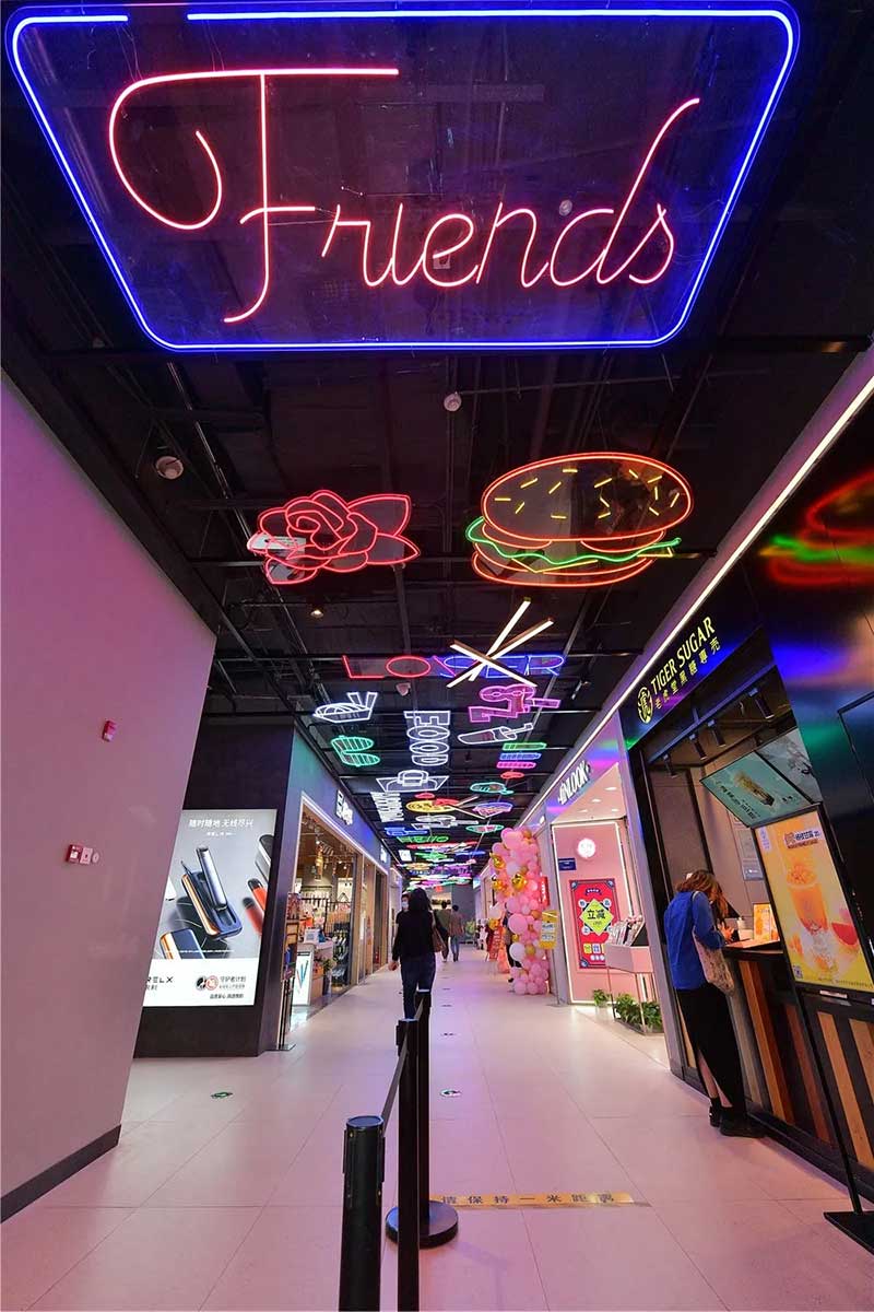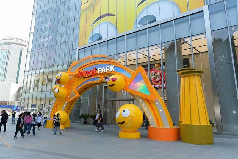 南门入口区就是主要的重点地标,从百多表情中挑选了适合emoji公仔的可爱和个性化表情,带出城市动感的节拍。目的就是要把户外入口的位置,设计成emoji park主题乐园入口,这里适合拍照打卡,和自己心爱的emoji公仔来个合影!南门入口由12个大小不一的emoji造型和16米宽的箭头拱门组成,用了超过300个灯泡作为点缀营造夜景氛围,从而做出游乐场的感觉。