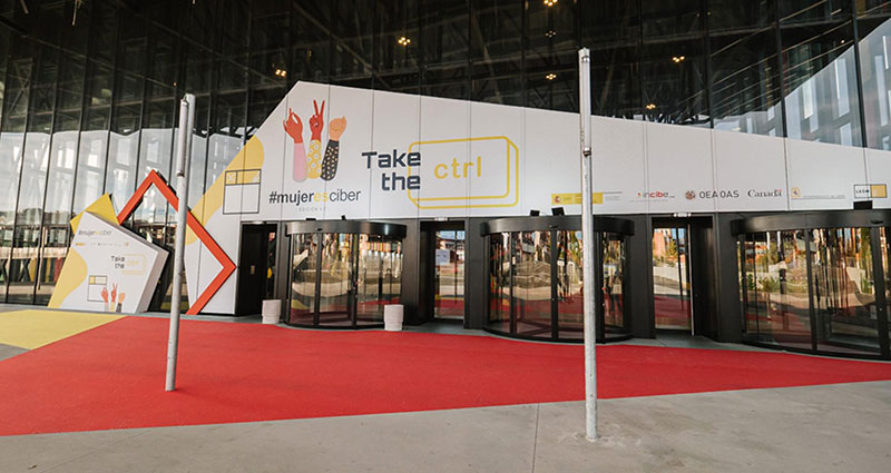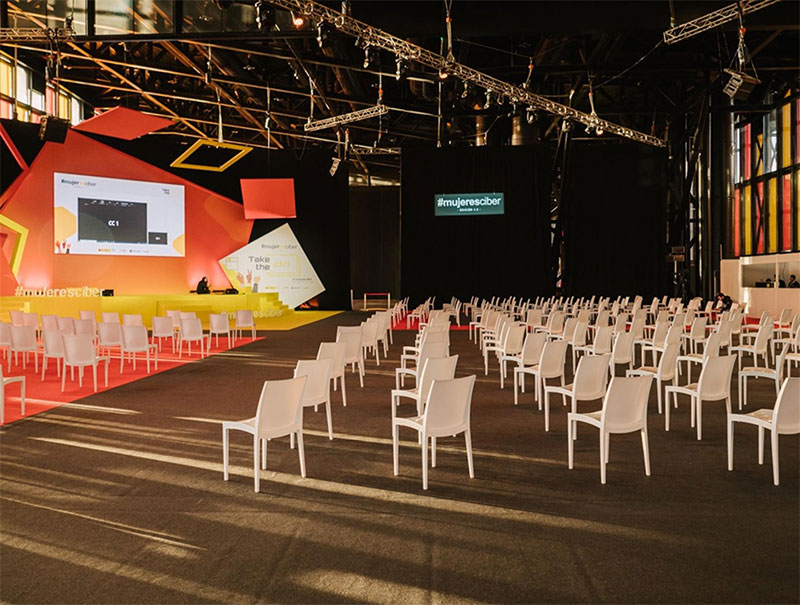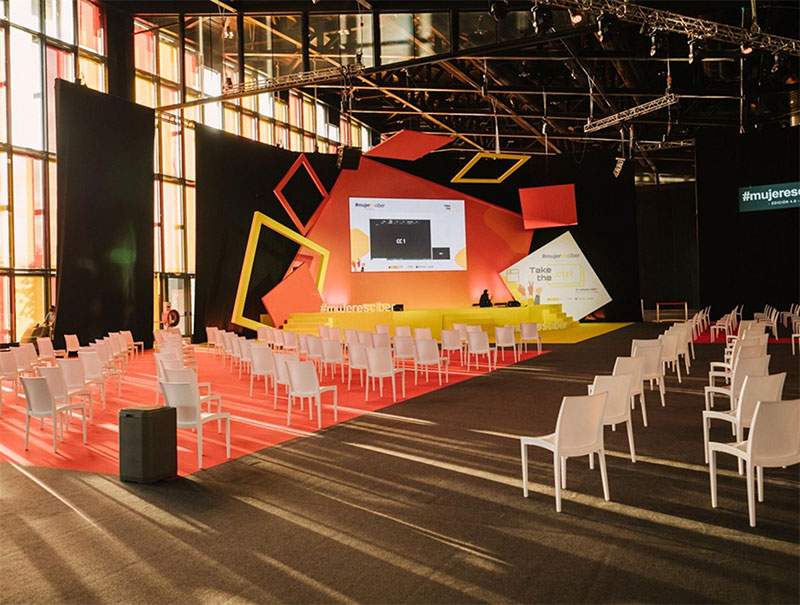 一个梯形形状的图形和INCIBE标志的解构图形构成了场地的主入口拱门。在结构上设计了具有不规则形状的大型结构,以拱门的形式作为进入每个空间或作为活动的视觉识别图形,并将其运用到现场的其他方面如装饰、平面图形、标牌等。作为装饰和空间设计的通用视觉符号,无论是悬挂在展馆中还是作为补充的装饰,都采用了INCIBE(信息安全国际会议)徽标的符号。同时还设计了不同的尺寸和颜色搭配:组合色或纯色被随机分散在空间的设计中,并作为一个统一的元素,提供平面、立体的视觉元素,并强化了INCIBE在活动中的形象。还应用了INCIBE手册的色系,使品牌的存在在整个路线上都清晰可见。对于外观,则有一个图形构图,将活动的图像放在梯形上,并在场地的主入口处解构了INCIBE标志的细节。