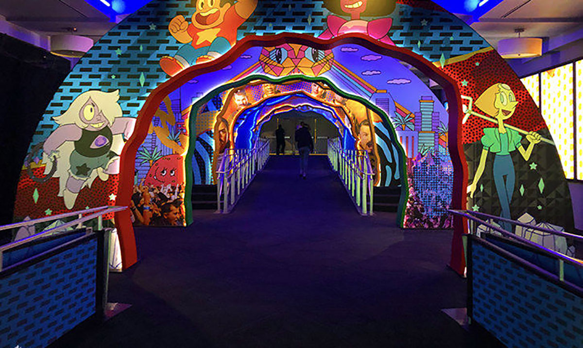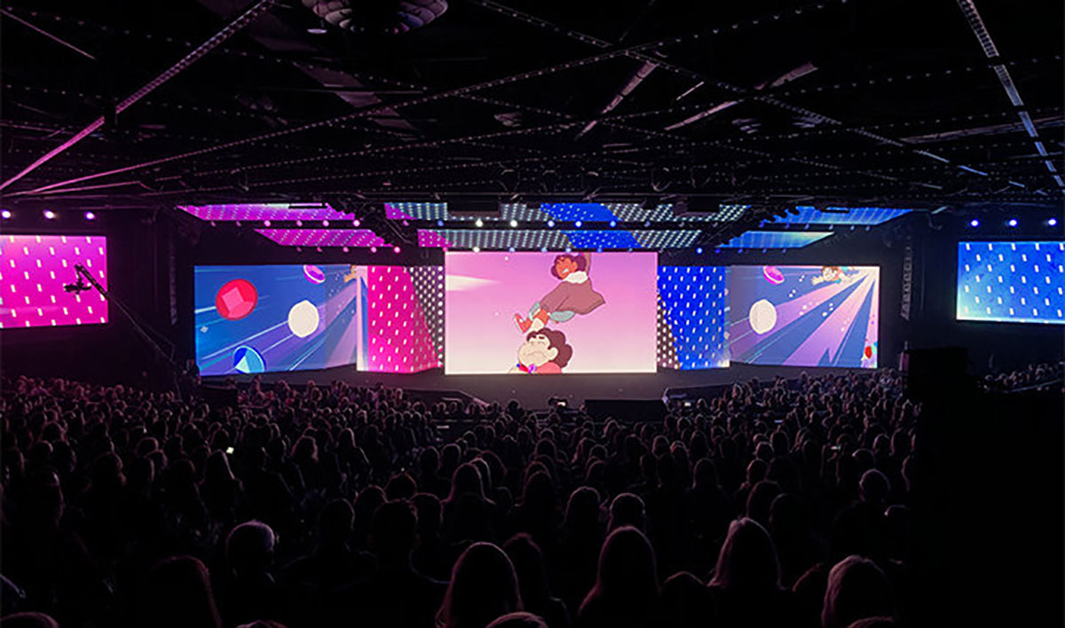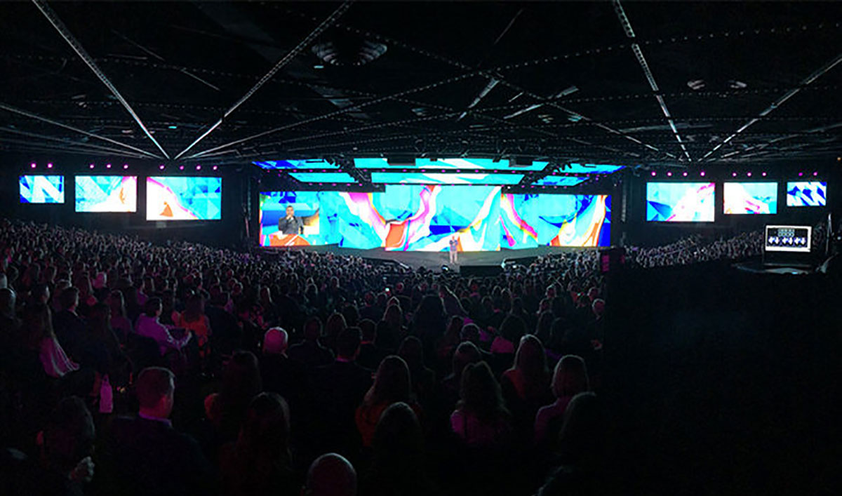 参会者在进入主大厅半圆之前,会经过8个巨大的LED照明拱门,并直接进入了Upfront行动。成对的互动体验提供了展前娱乐,让参会者有机会采用特殊过滤器和定制灯环进行独特的自拍。此次品牌大会的舞台设置成116英寸的视频屏幕,两侧是视频“翅膀”,延伸到观众的外围设备。就连天花板也被视频瓦片“云”所覆盖,悬挂着150个索具点,给所有参会者更震撼的沉浸式体验,更直观地体会品牌活动的核心内容。