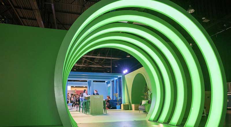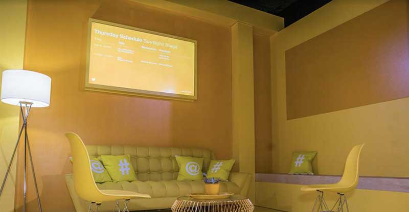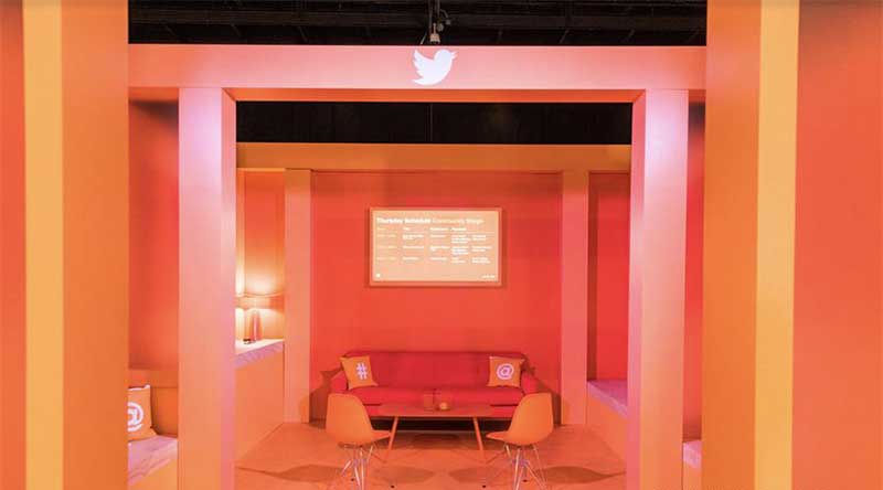 Twitter在在线视频大会上为来宾们提供了友好的绿色休息区体验,创造一个沉浸在光和颜色的空间,90’x30 ‘的空间以单色为特点,每个房间都有不同的功能,为来宾提供休息、交流,创造社交媒体内容、品牌体验。