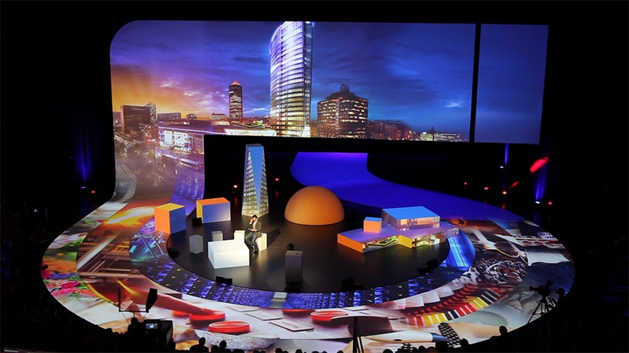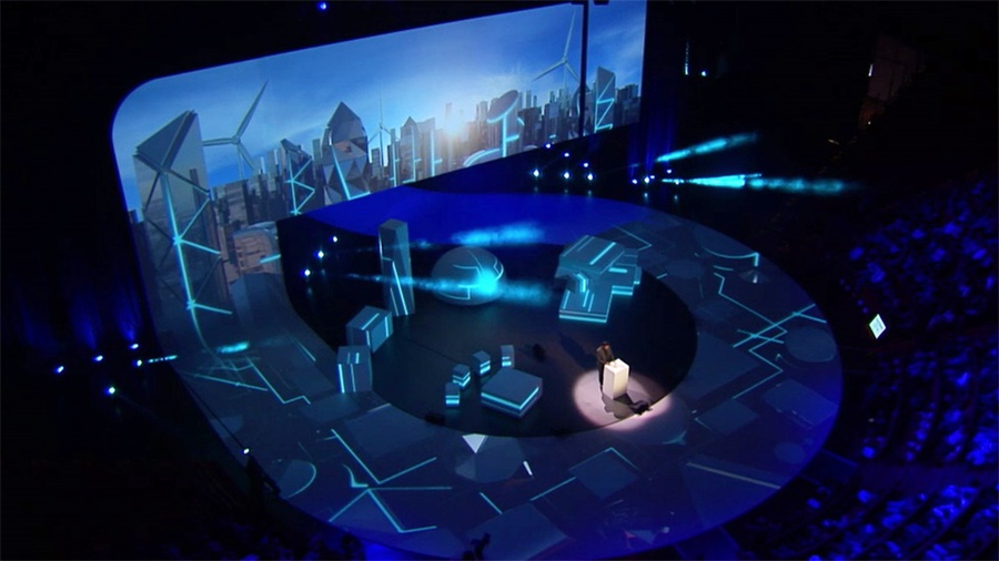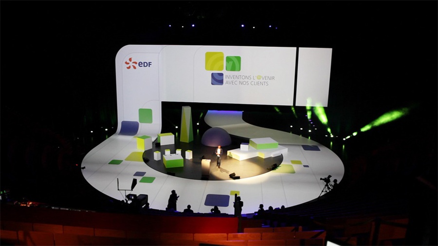 法国电力公司是法国的公用电力公司,在EDF商业大会上,为给该活动现场赋予新的视觉维度,依据这样的思路,进行了一种意想不到的会议舞台场景设计,在舞台上通过视频映射技术,将特别设计的动画投影到舞台上,使整个活动现场仿佛被“魔法”所震撼。