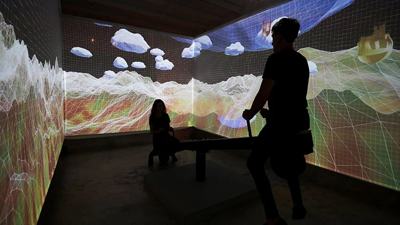 沉浸式互动装置投影跷跷板,一旦跷跷板开始运动,由于集成的传感器连续记录参数,可视元件被投射到悬浮的织物上,该参数根据给定时刻的特定状态变化,人沉浸在画面中,有种身临其境感觉。
