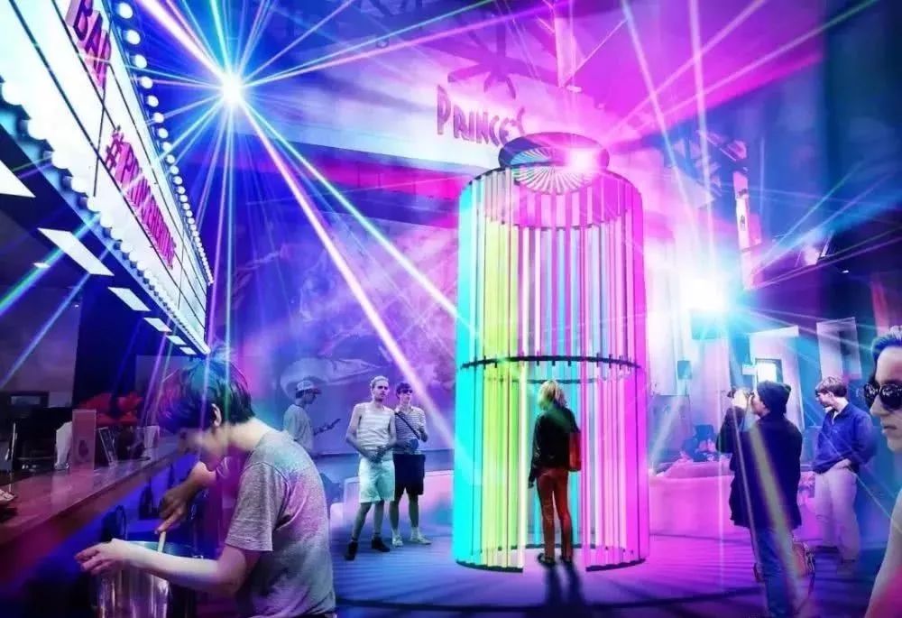景区的《Prince Screen #1》是艺术家H-Lab打造的一座沉浸式艺术装置,50余米的LED灯管从天花板上盘旋而下的时候,与周边的反光镜的折射光觥筹交错。配合朦胧的烟雾,游客可在梦幻与现实中游走。