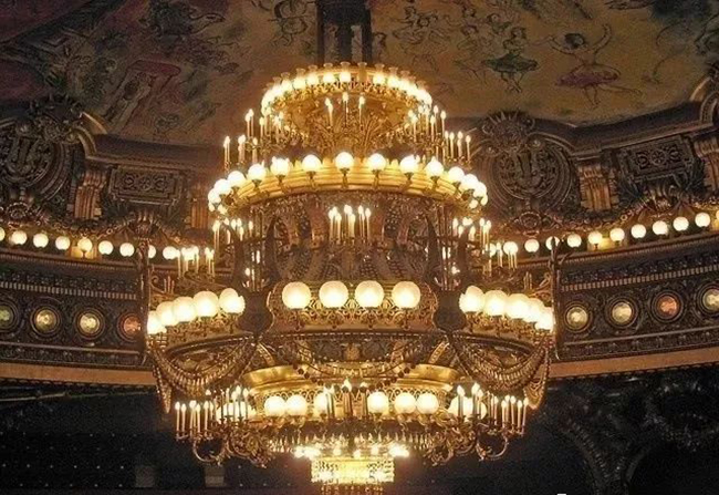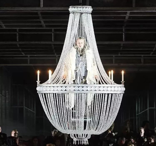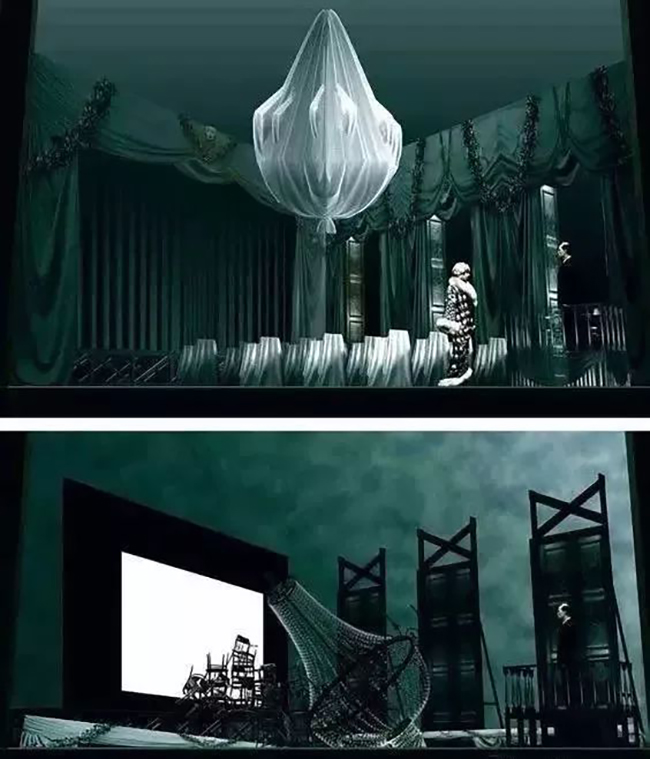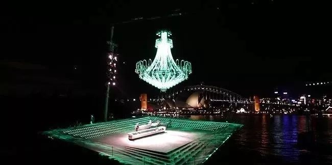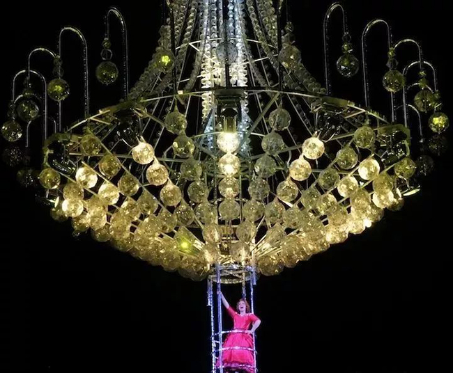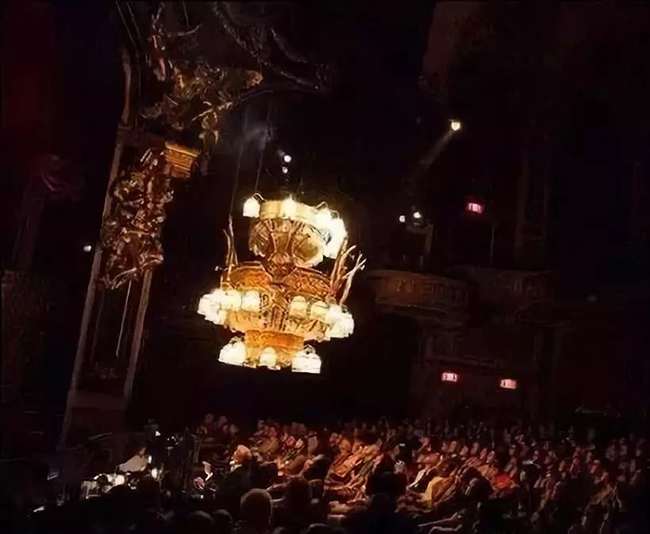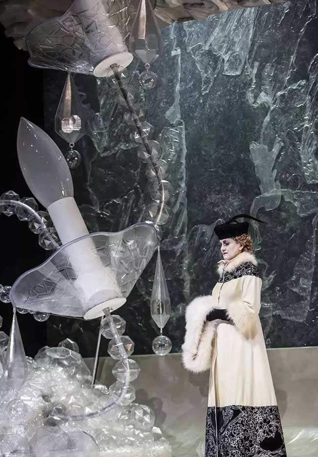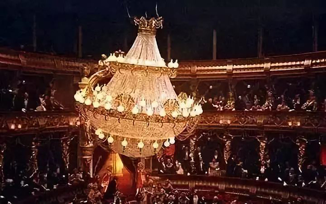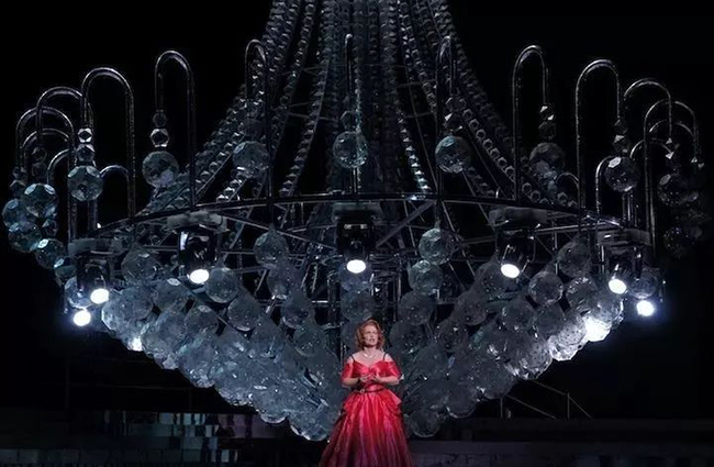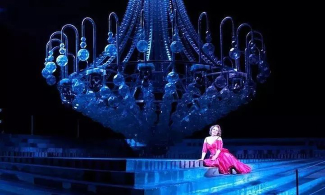 这个水晶吊灯体积更大,是歌剧《阿拉贝拉》舞台置景的一部分,几乎占据了舞台三分之一的面积。