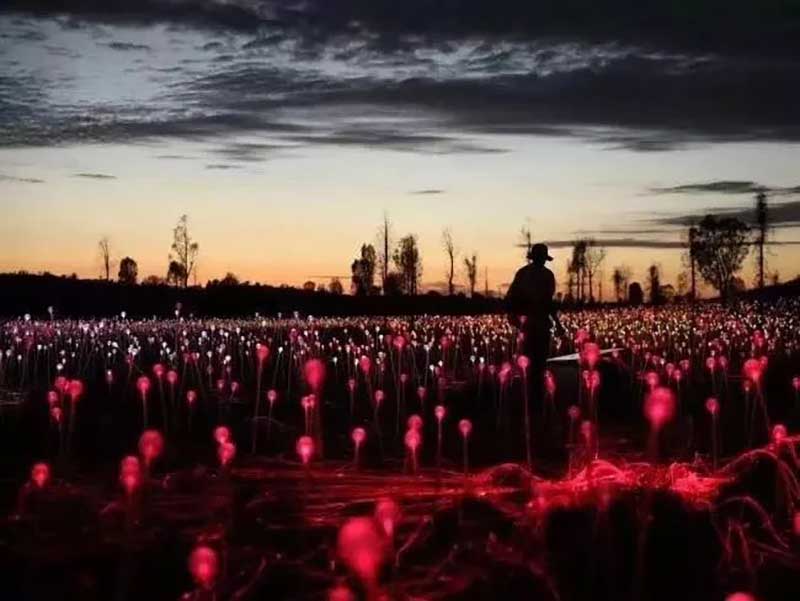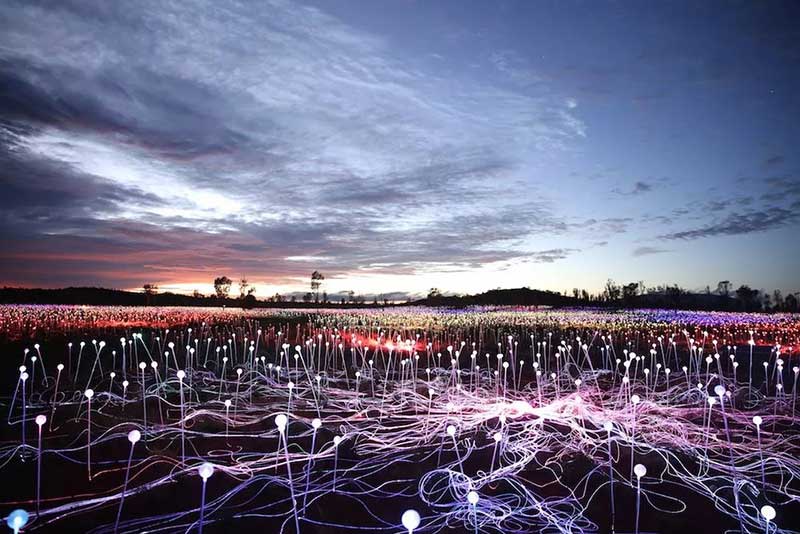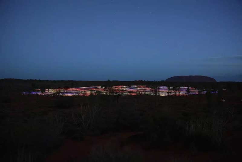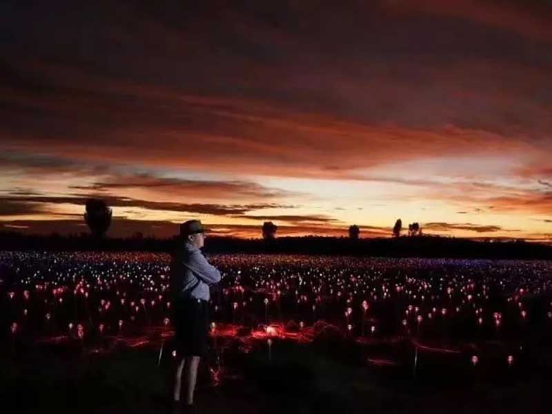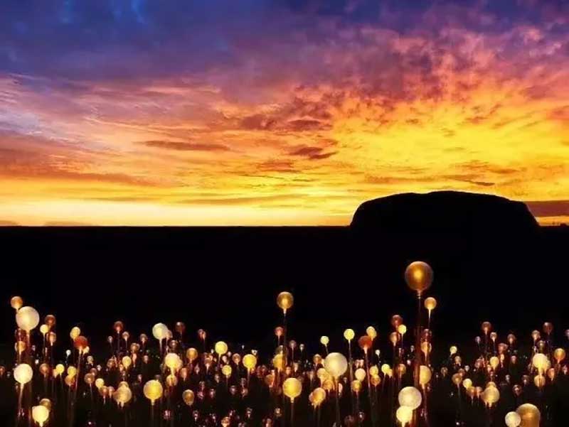 由国际著名的灯光艺术家Bruce Munro所设计的“原野星光艺术装置展”于2016年来到乌鲁鲁—这个曾经激发起他关于“原野星光”艺术灵感的地方。这是到目前为止最大的“原野星光艺术装置展”,当夜幕降临在澳大利亚的灵性之心—乌鲁鲁,50000多个覆盖著磨砂玻璃球体的管子将会在夜空中如花朵般怒放,越夜越美丽。