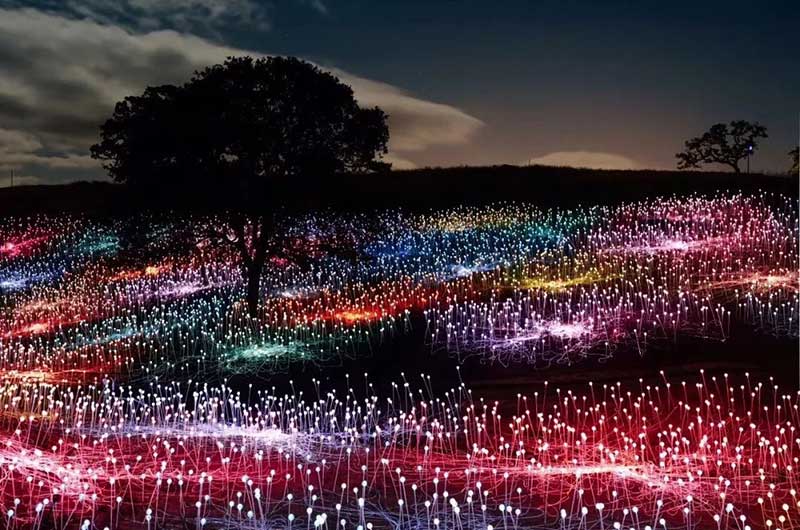 “原野星光”是由50000多个覆盖著磨砂玻璃球体的发光的管子构成。这些玻璃球体由一系列错综複杂的光纤网络连接,当夜幕降临在乌鲁鲁时,会在夜空中如花朵般怒放,美不胜收。参观者们将会通过特别设计的步道近距离欣赏‘原野星光’,在南半球浩瀚的星空下从沉睡中逐渐甦醒,越夜越美丽。“原野星光” 象征的是生活中一切美好的事物和对未来的希望。在广阔的乌鲁鲁沙漠地带,发光的管子如同沉睡的种子一般静静等待著,到夜幕降临时,它们又像花朵一样绽放在南半球浩瀚的星海下,柔和的光线将夜幕点缀得如梦似幻。这一切都会给游客带来不一样的独特体验。