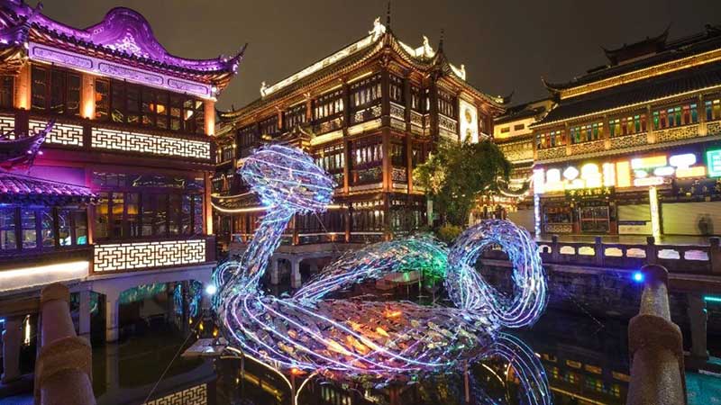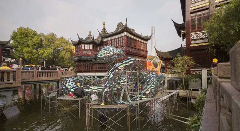 九曲桥湖面上的“鱼旎如意”是豫园灯会的亮点之一,与湖心亭、绿波廊比邻而居,勾勒上海豫园江水地貌之风华。鱼字有“余”之意,寓意年年有余;“旎”字有风吹连绵的唯美之意,“如意”则向中华艺术古典韵味的造型致敬,四字连音,亦有“予你如意”的意思。作为一份新年贺礼,送于所有前来观赏的嘉宾:未来可期,予你如意。