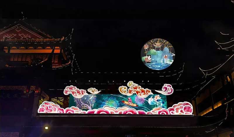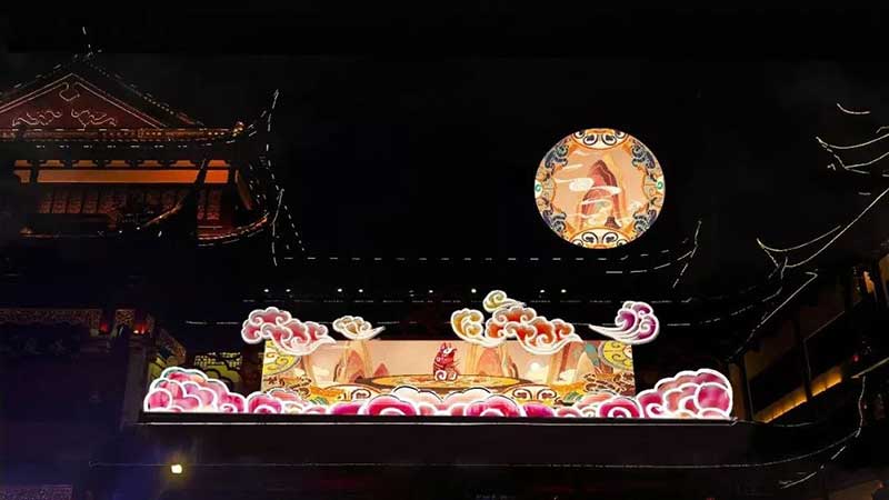 为烘托2020上海豫园灯会节庆氛围,除了大型光影艺术装置“鱼旎如意”外,还在豫园和丰楼、华宝楼打造墙体投影秀,采用3D Mapping技术,将传统灯彩技艺和新媒体艺术大胆结合。