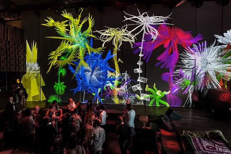 分形花卉2015是一个巨大的虚拟花园,不断揭示巨大的植物生命的不同大小,颜色和形状。进化的植物宇宙形成了虚拟的种子,随着观众的反应而生长、开放和消失。这些花的图形,几乎是数学形式都是完全独特的,它们的抽象是不一样的。这些数字花朵与游客产生了一种神秘的对话:它们鞠躬欢迎公众进入虚拟花园,展示它们的颜色和形状,最后消失在视线之外,就像云朵逐渐变得模糊。
