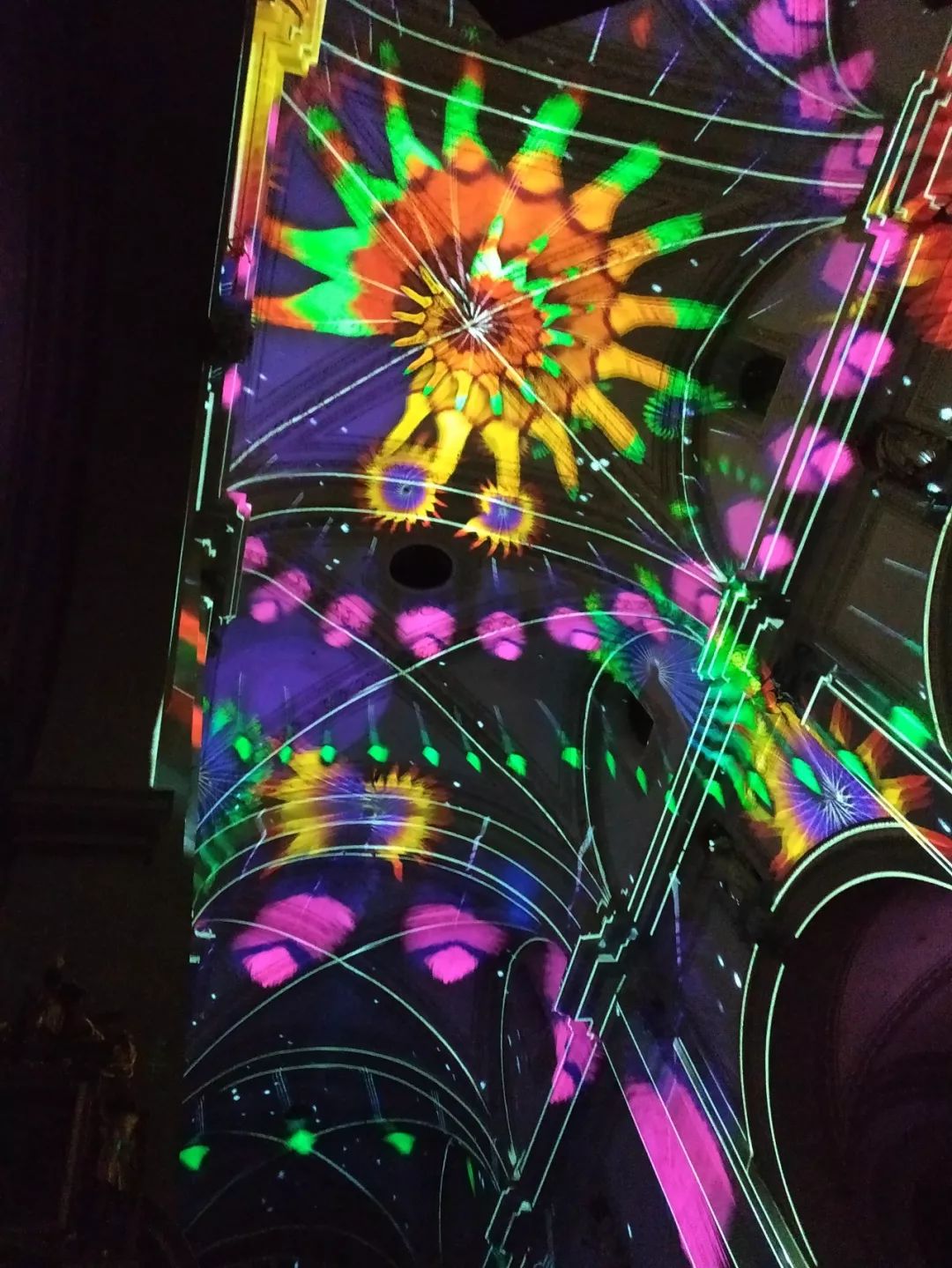 在豪夫教堂的天花板和墙壁上,Projektil团队通过灯光秀将游客进入幻想世界。表演持续约20分钟。