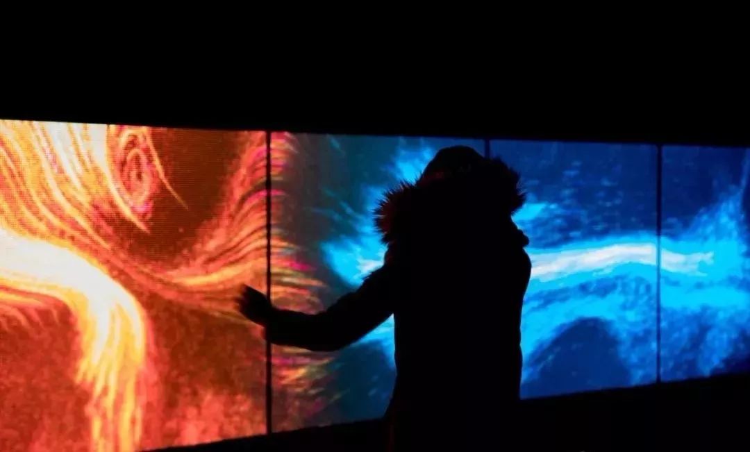 装置灵感源自美剧《权力的游戏》,装置的“冰与火”对立元素呈现出一种史诗般的景观。体验者可以向冰面发射火焰,反之亦然,触发火焰和冰粒子撞击的模拟爆炸效果。