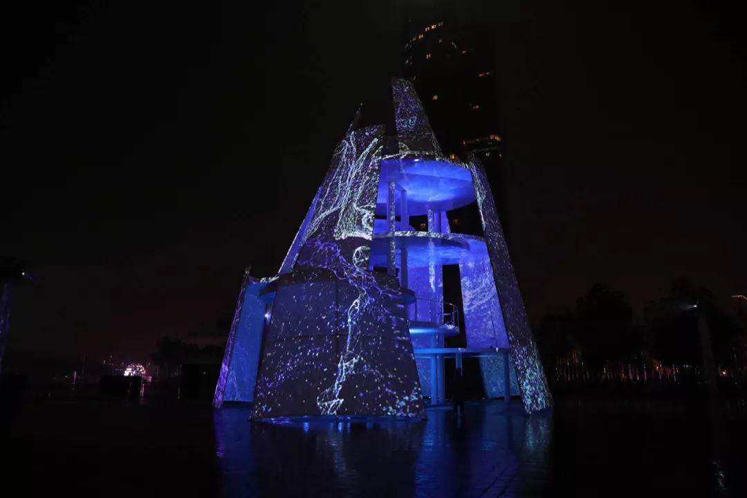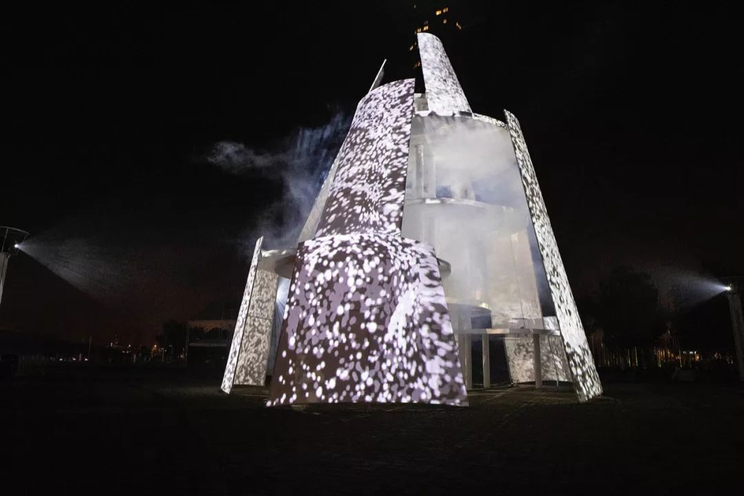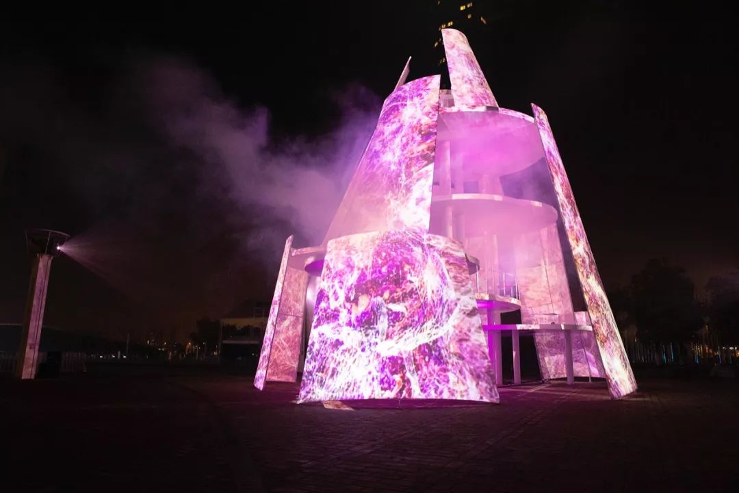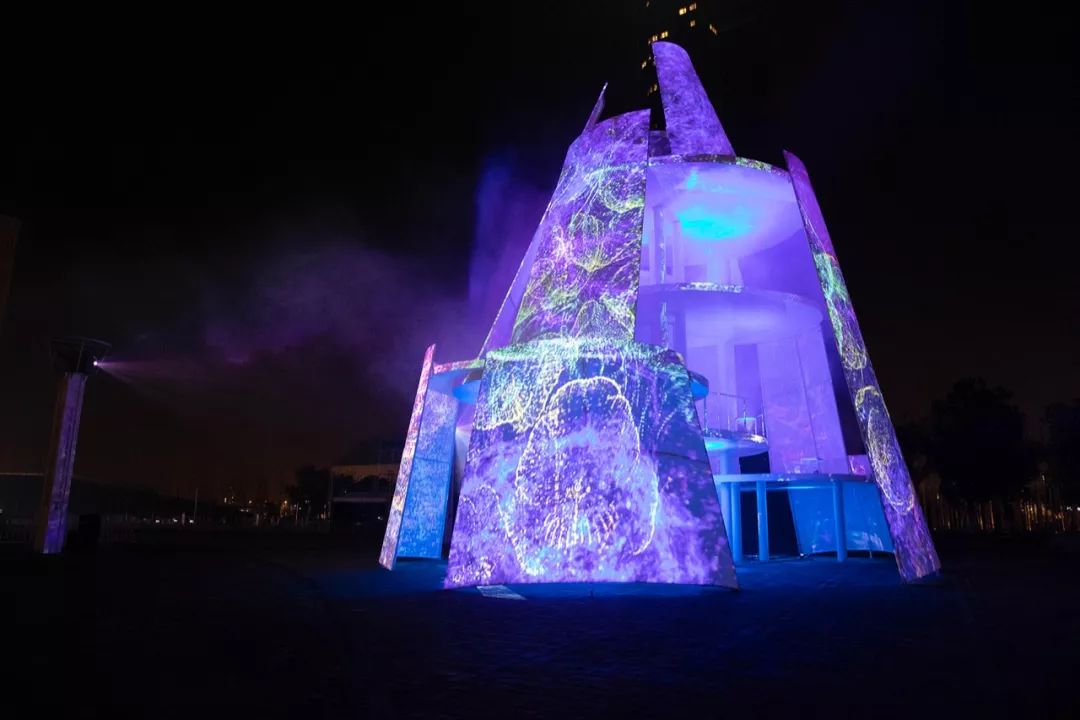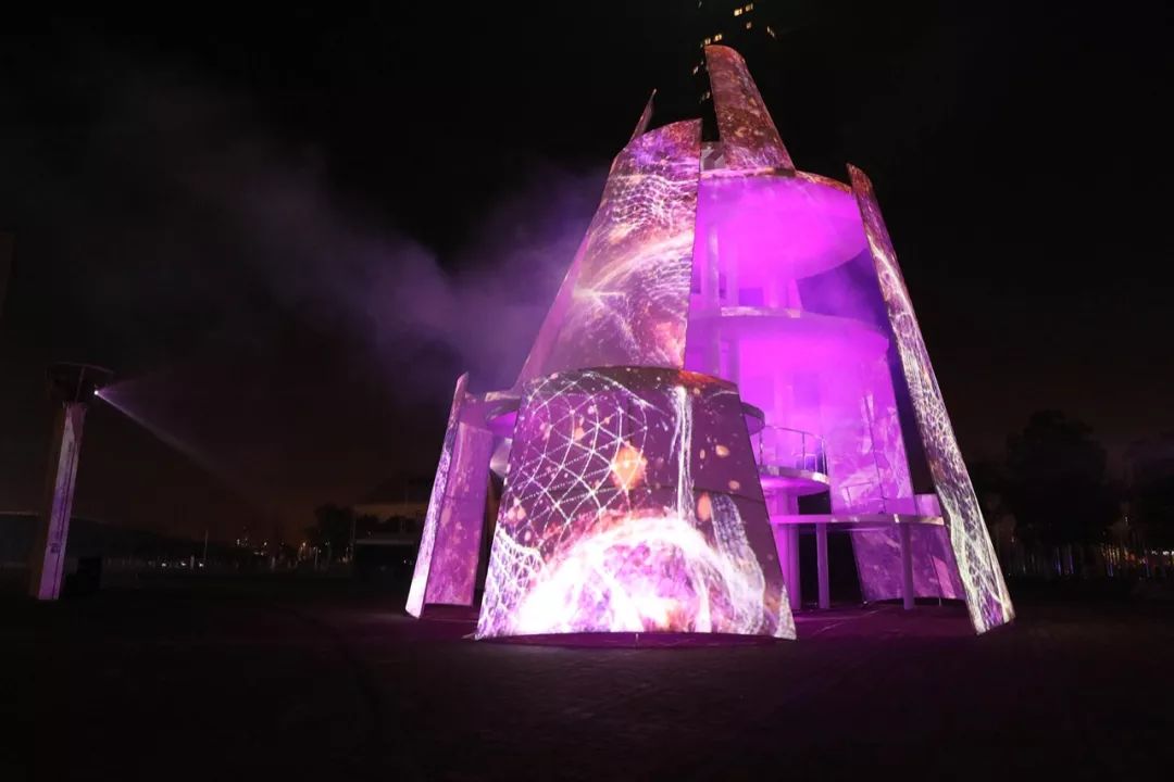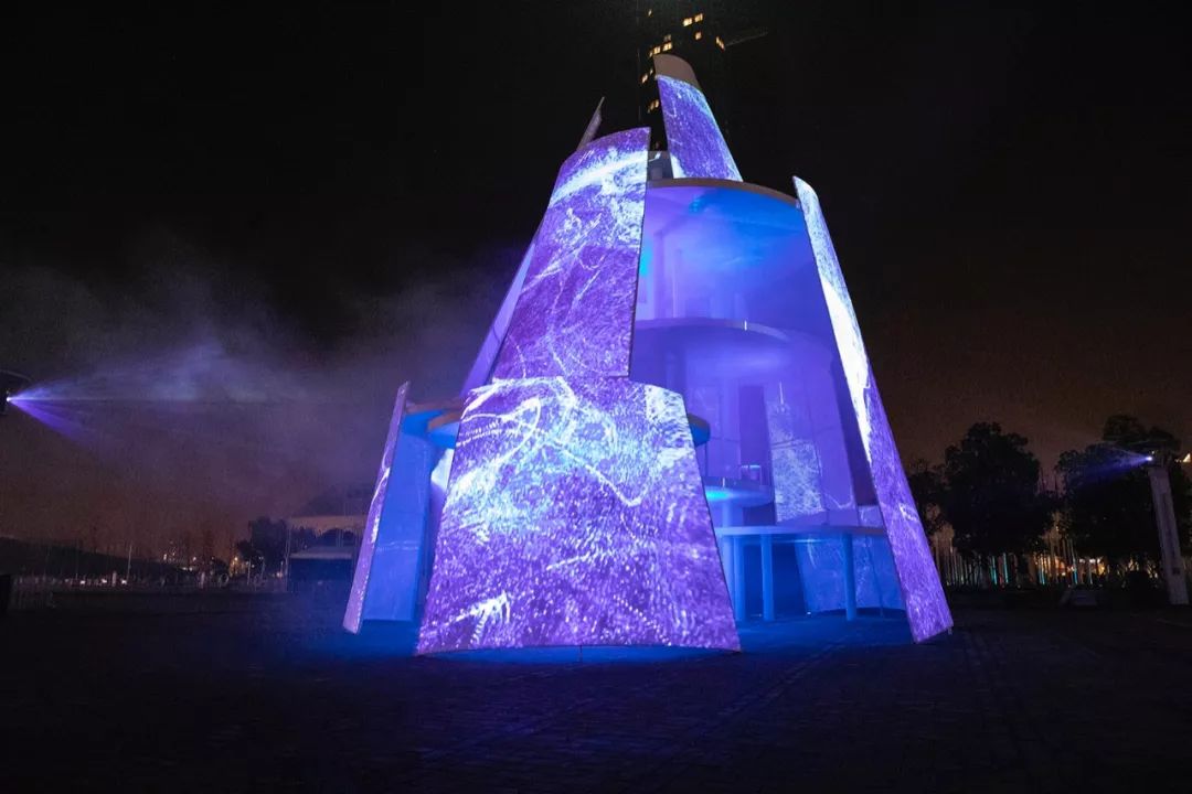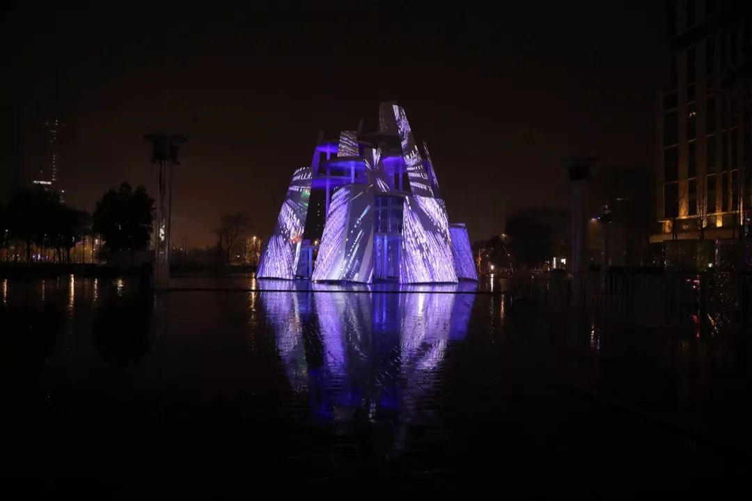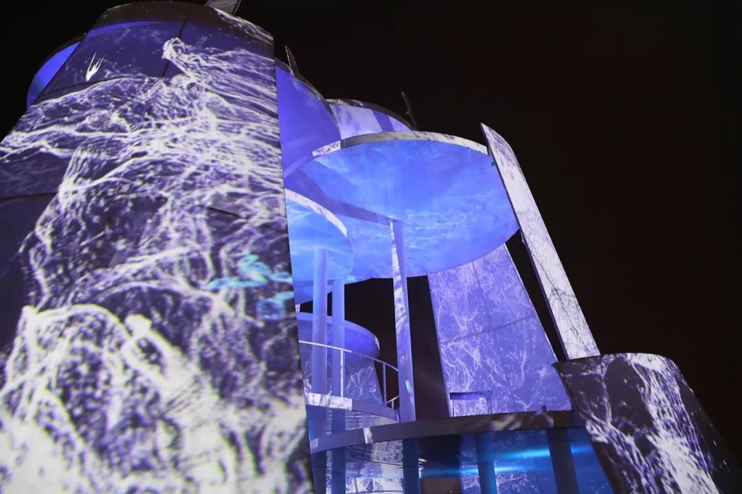 时间塔以若干层大小不断变化的圆盘连接的立体架构与围绕在周边的面积不等、不断上升的屏幕进行组合,形成了立体的、相互掩映的空间关系,将具象的实体存在转化为空间的抽象表达。我们通过对圆盘底部的照明渲染,达到时间塔内部的灯光照明配合外部的作品表演进行同一控制,使时间塔达到了美轮美奂的艺术效果。仿佛一个来自远古的神秘晶体,在夜空中发散着神秘的气息。