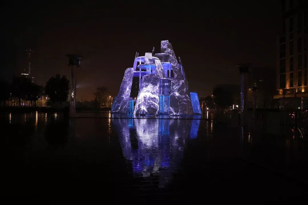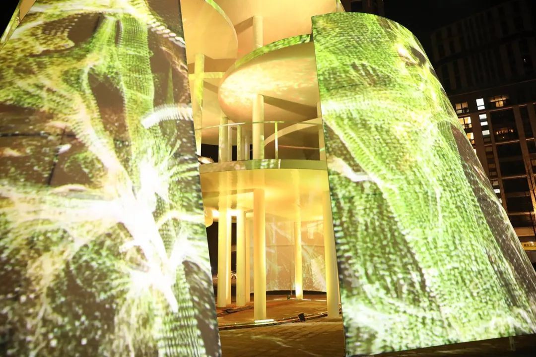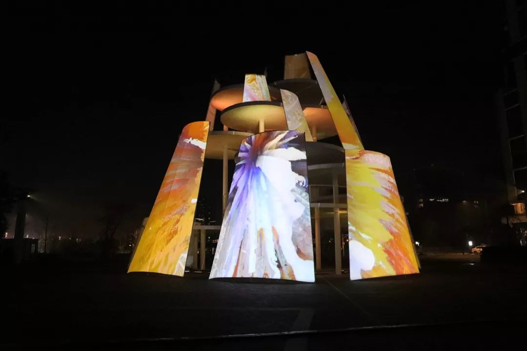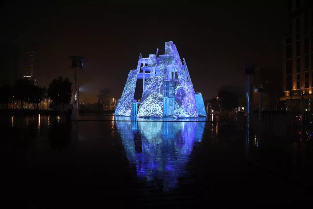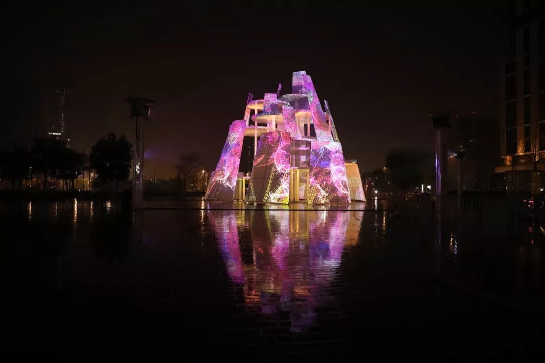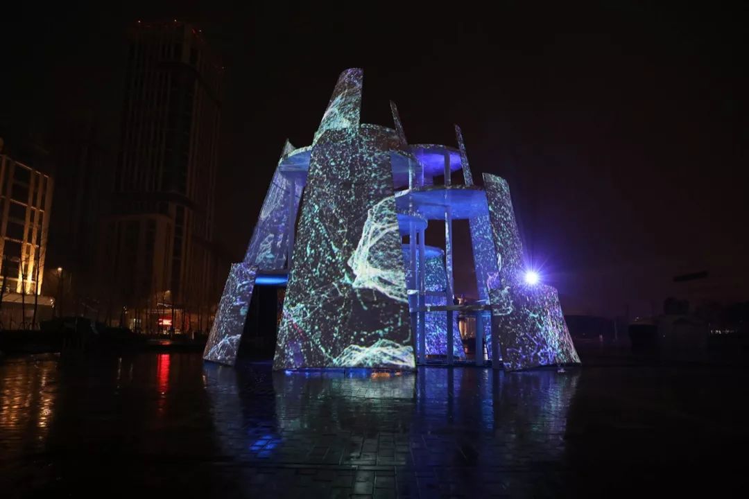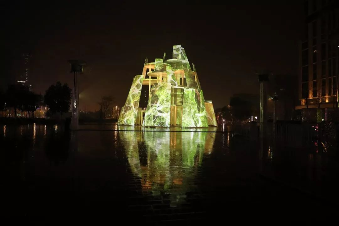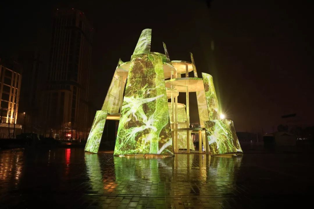 时间塔以若干层大小不断变化的圆盘连接的立体架构与围绕在周边的面积不等、不断上升的屏幕进行组合,形成了立体的、相互掩映的空间关系,将具象的实体存在转化为空间的抽象表达。我们通过对圆盘底部的照明渲染,达到时间塔内部的灯光照明配合外部的作品表演进行同一控制,使时间塔达到了美轮美奂的艺术效果。仿佛一个来自远古的神秘晶体,在夜空中发散着神秘的气息。
