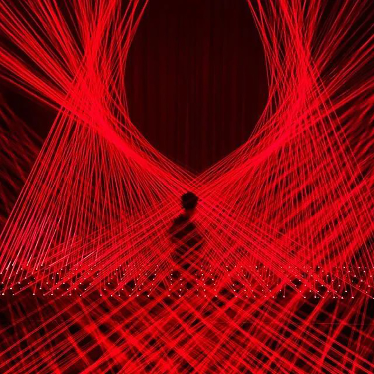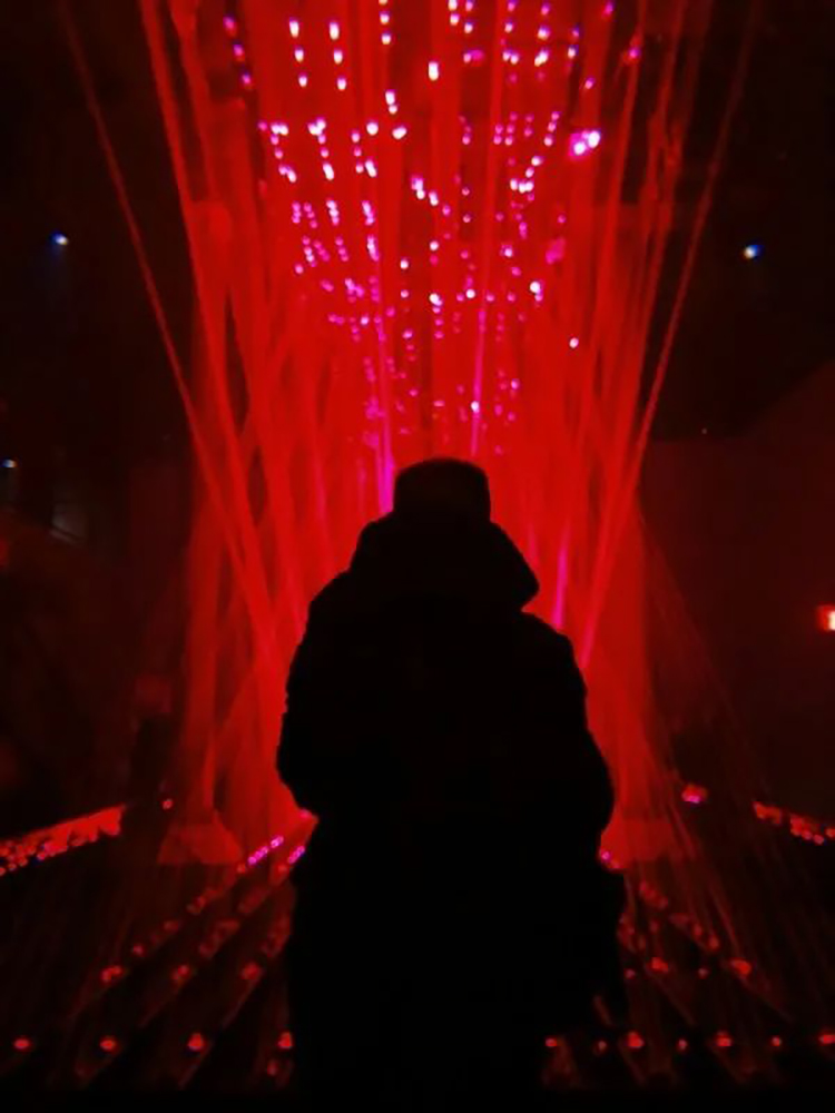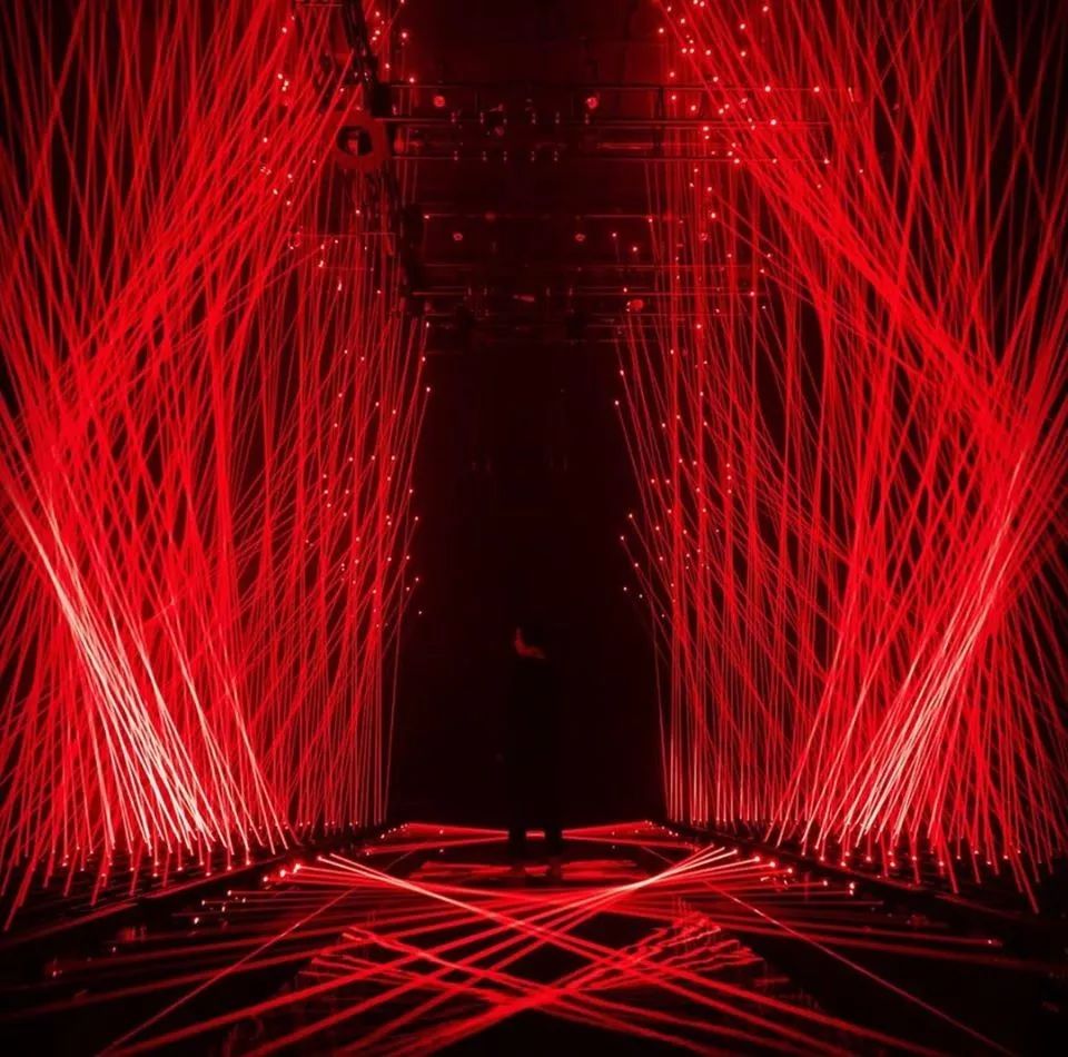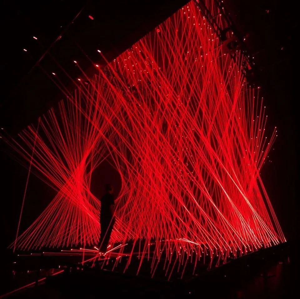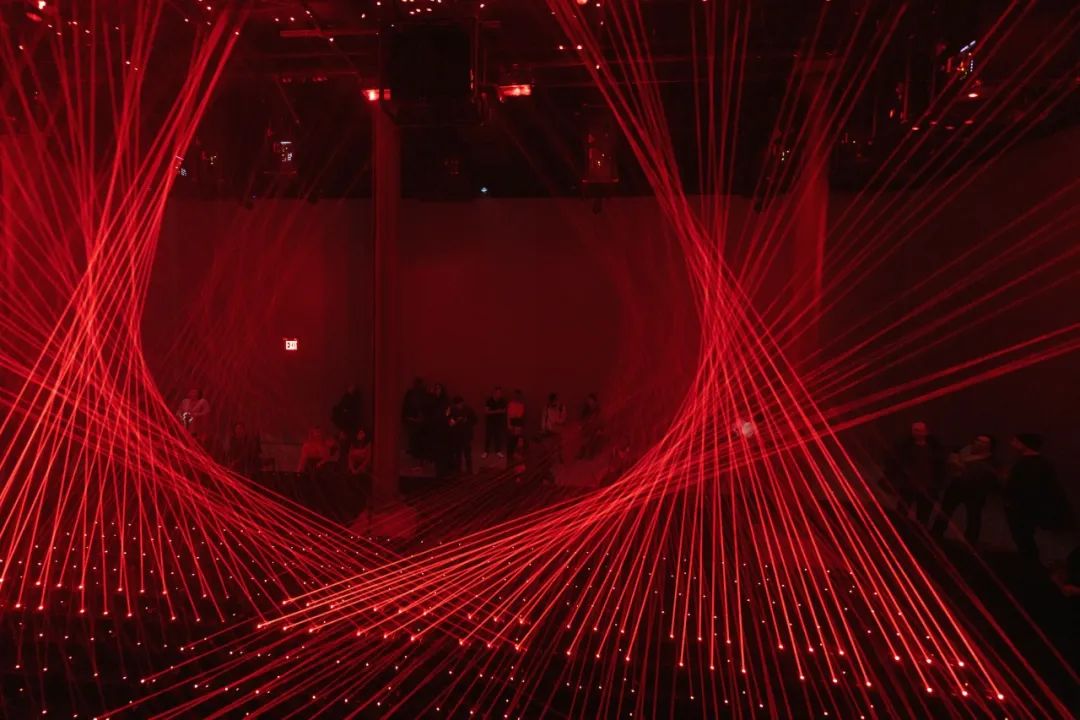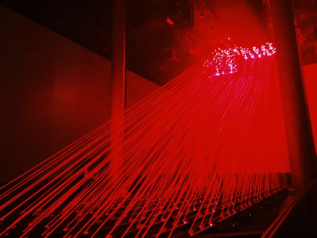 展览的中心部分是由几十个动态红色激光模块和传感器配置等组成,这些模块可以协同移动,制造出一个看似「有规则」的世界,从而激发我们内心深处的人性化意识 ,它们像珠帘或竖琴的琴弦。