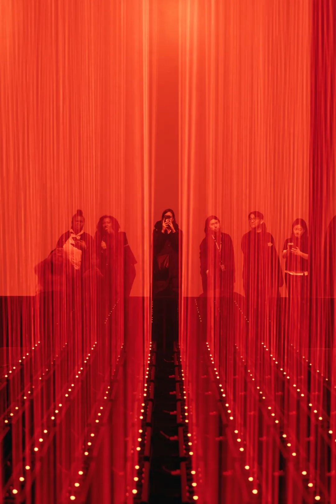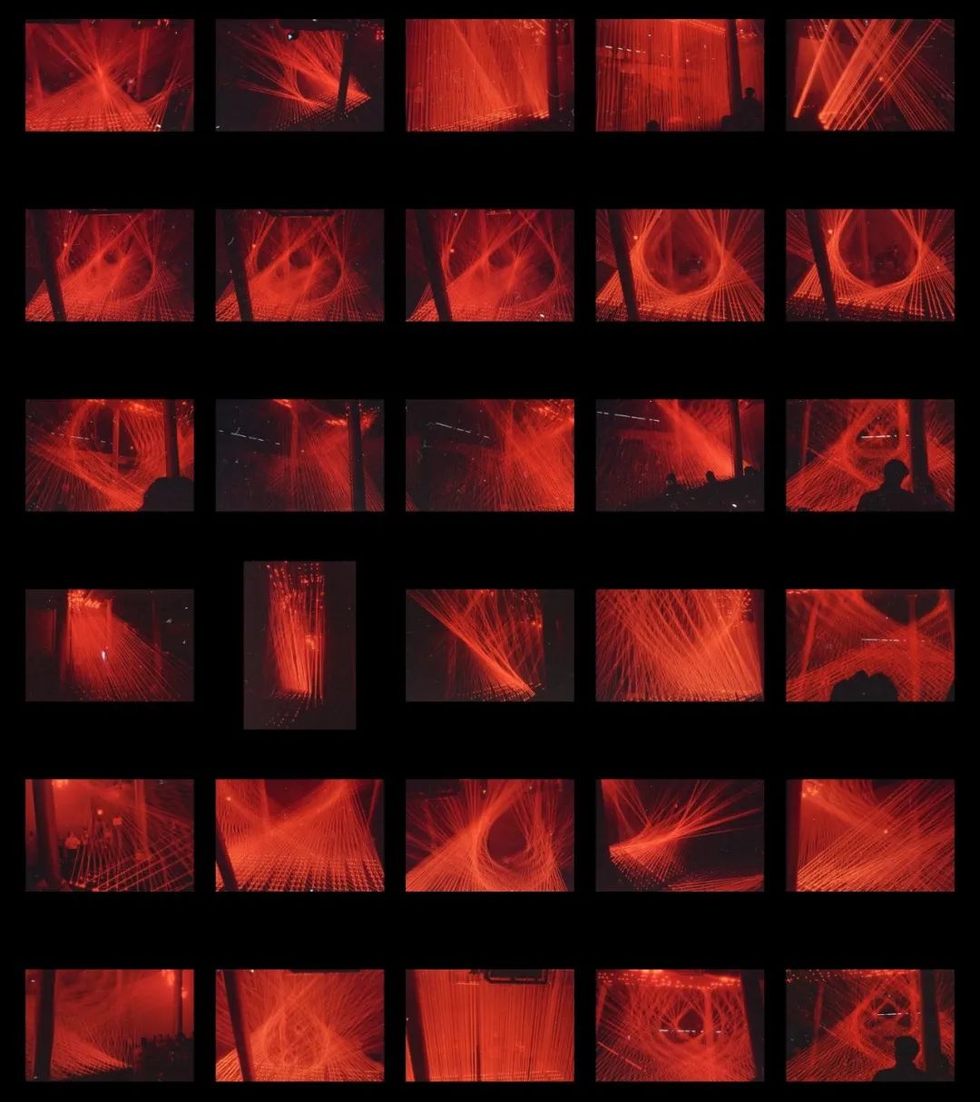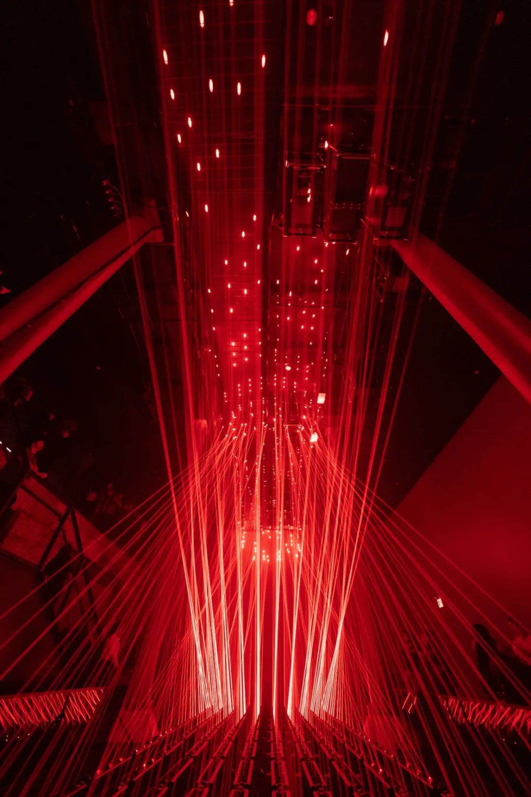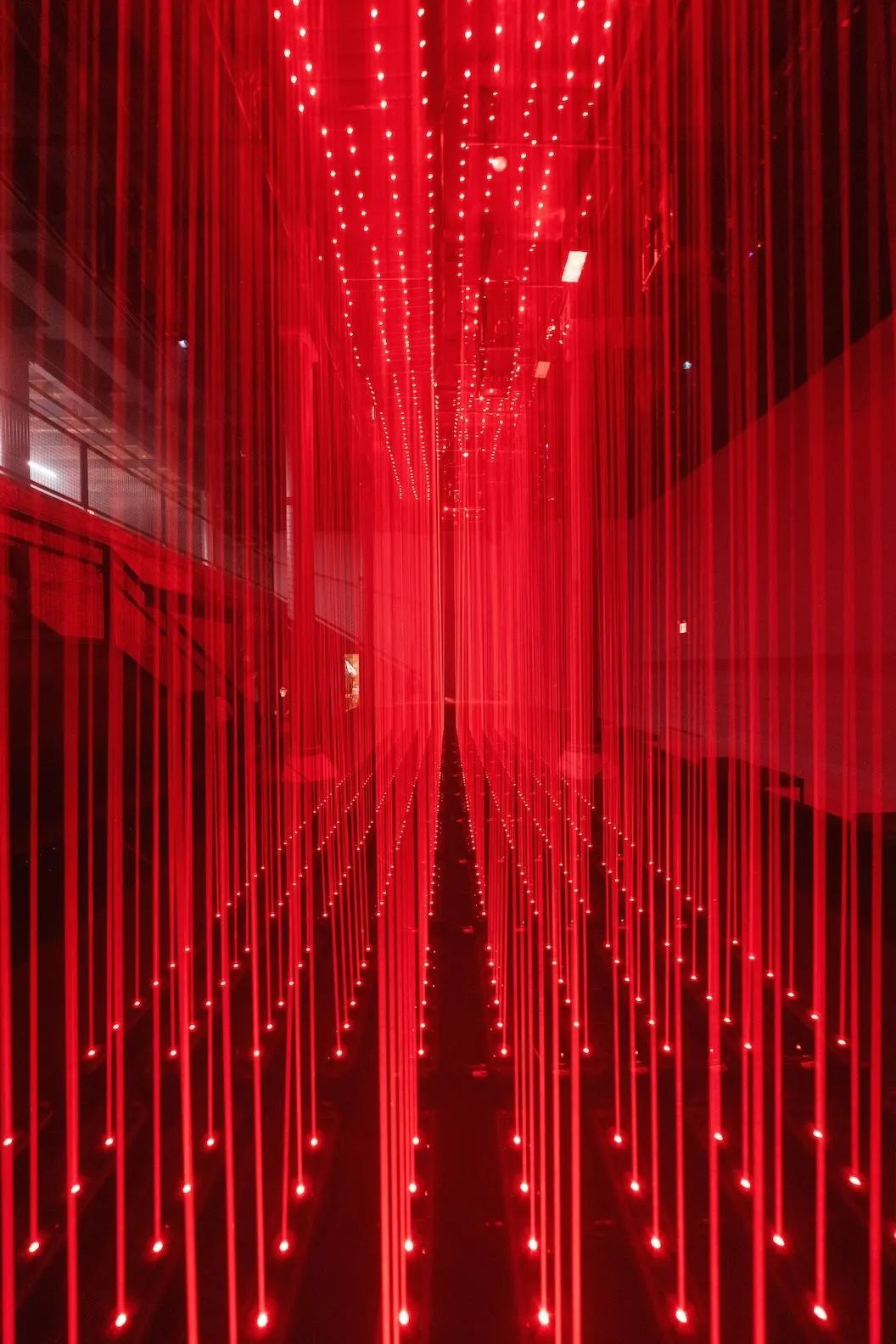 展览的中心部分是由几十个动态红色激光模块和传感器配置等组成,这些模块可以协同移动,制造出一个看似「有规则」的世界,从而激发我们内心深处的人性化意识 ,它们像珠帘或竖琴的琴弦。