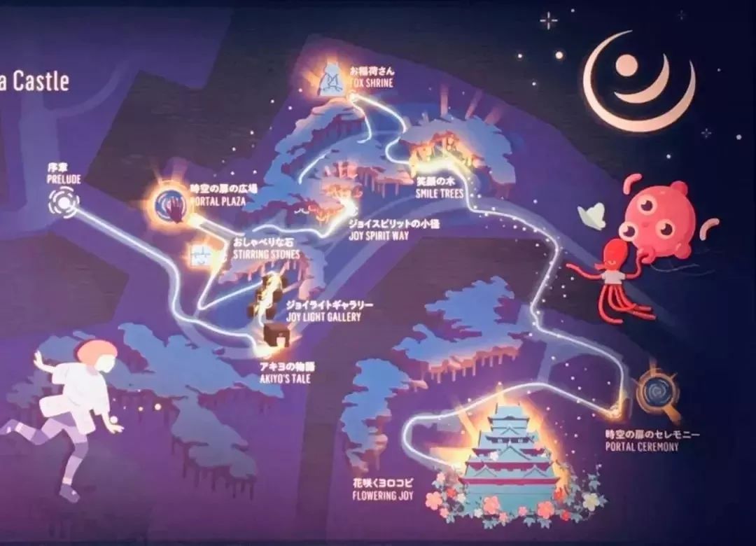 夜游的顺序:序章→AKIYO物语→欢乐灯光画廊→会说话的石头→时空之门广场→欢乐精灵小路→稻荷神→微笑之树→时空之门仪式→欢乐之花。