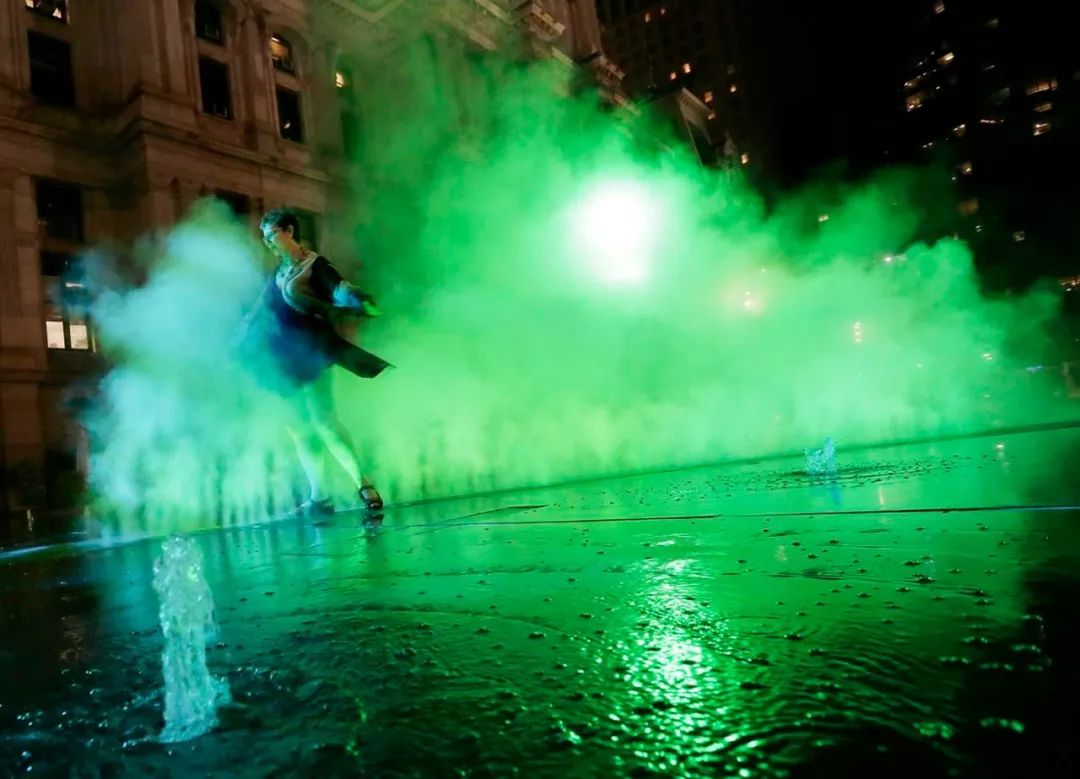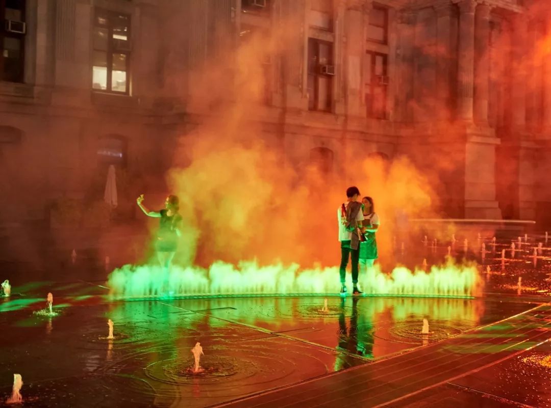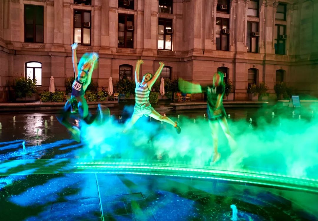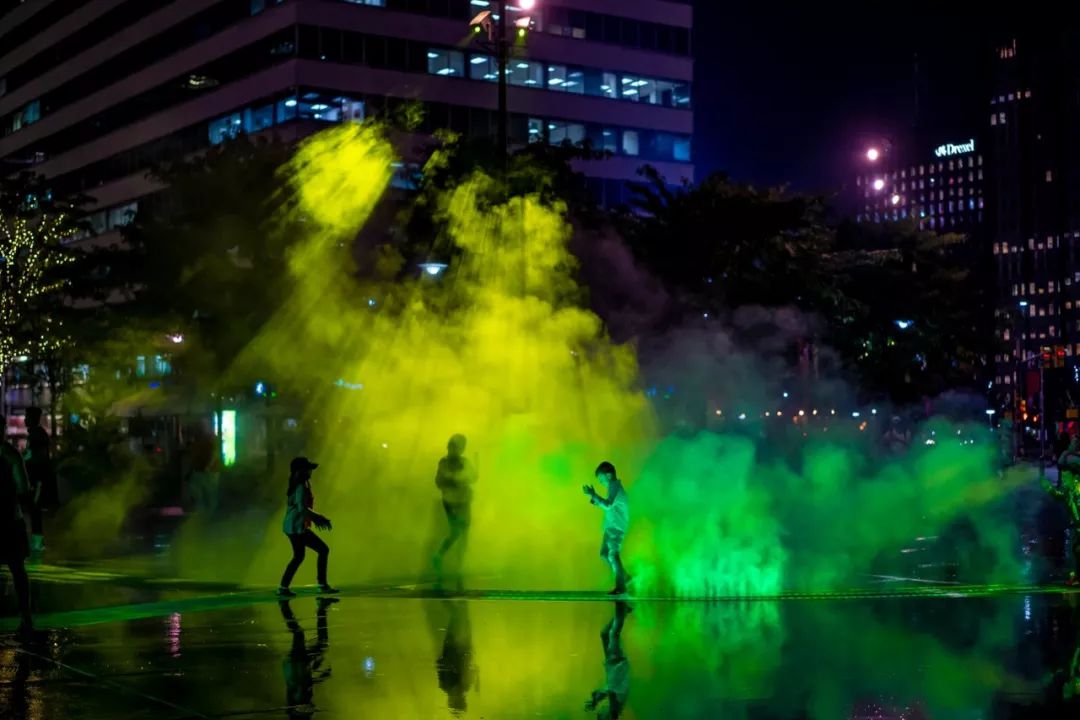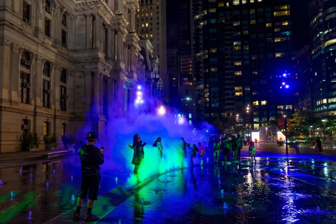 政府委托艺术家Janet Echelman在美国费城Dilworth公园创作了一个永久性的艺术作品——灵感来自于该公园与水、交通的历史。火车从喷泉下方经过时,四英尺高的彩色雾幕沿着每天运送7万多名乘客的交通线路穿过喷泉表面。利用高压喷雾系统,制造出冷雾并迅速蒸发。薄雾经过过滤,光线投射到薄雾上。孩子们在薄雾中玩耍是安全的。彩色雾幕穿过喷泉,映照出下方火车的足迹,让人想起19世纪初这座城市第一个抽水站以及宾夕法尼亚火车站的火车冒出的蒸汽。弥漫在空气中的光束与水雾,成为Dilworth公园夏日夜晚的一道清凉的风景。