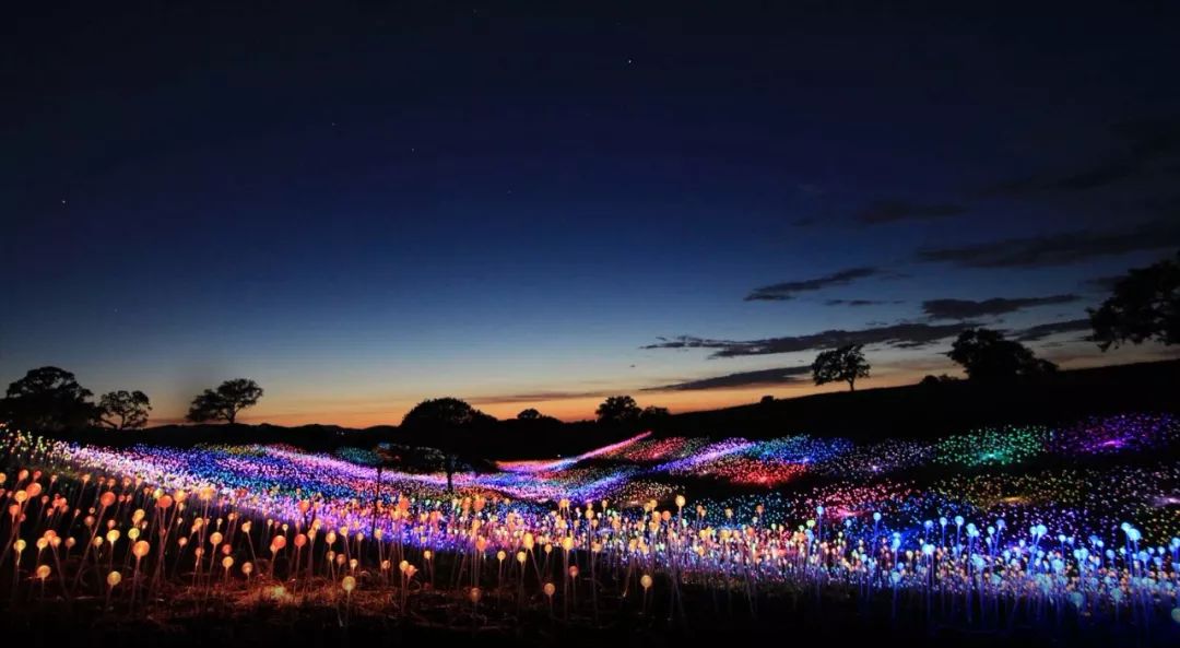 《Field of Light》,是英国艺术家Bruce Munro迄今为止最大的特定场地项目。这些发光体由上万个丙烯酸管子覆盖玻璃茎球构成,色彩缤纷。这是一项庞大的艺术装置,覆盖了丘陵和乡村景观,超过58800盏太阳能LED灯。
