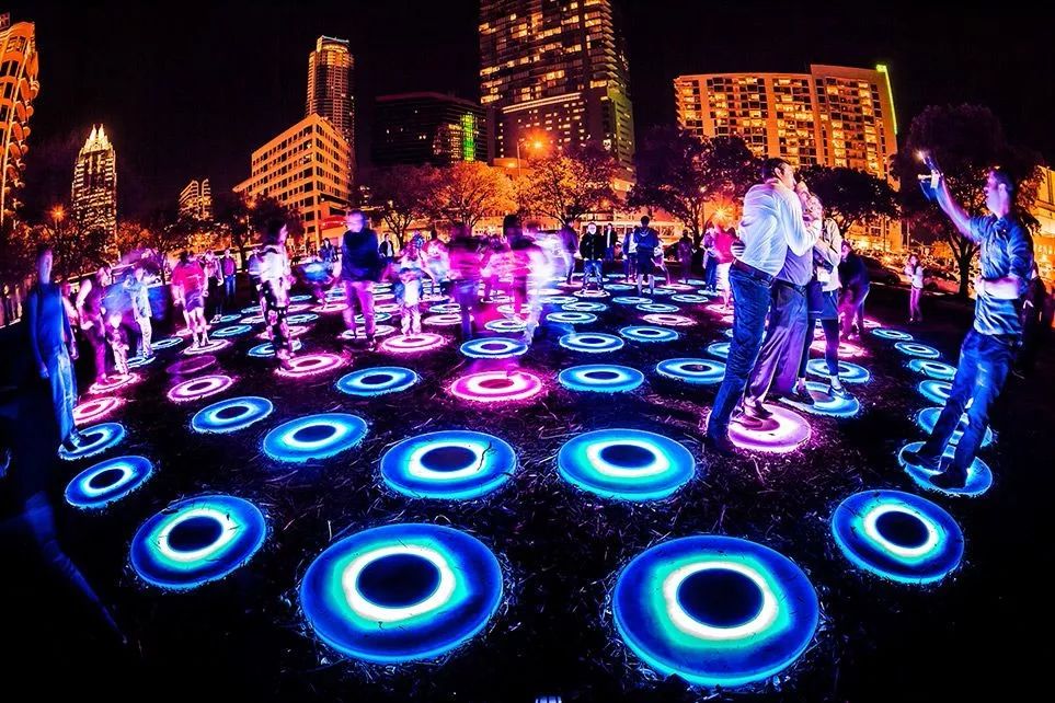 炎炎夏日, 来一场清凉的泳池派对吧,可是这场泳池派对并没有水。《The Pool》是一个巨大的同心圆场地,由上百个LED圆盘组成。走进去便置身于流光溢彩的世界。上百个平铺在地面上的LED圆盘如同水池涟漪、不断闪烁出弧形的美丽光环!当参与者每踩一次圆盘,圆盘中的灯光效果就会发生变化。自2012年以来,《The Pool》曾被带到全球40个公共空间展示。由于它是一个个独立的 LED Pad 组成,《The Pool》的尺寸也可以根据每次展出场地的不同条件,随意改变规模。置身在夏日的梦幻游乐场,与之产生交互,达到心灵的共鸣!