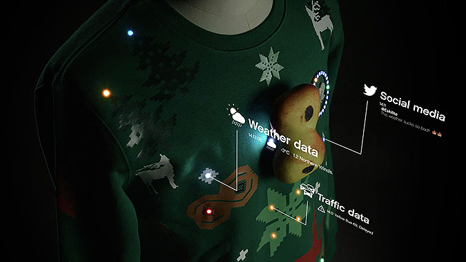 在今年的圣诞节活动中,瑞典711超商推出了藏红花面包,为了推广这款面包,711公司开发了一款实时互动的圣诞毛衣,这款毛衣内置了一个微型电脑,可以根据当地的社交媒体、天气及交通情况来计算得出用户的压力水平,当它感受到当地的圣诞情绪正在下降时,就会点亮毛衣,激活711藏红花的“甜美”价格。